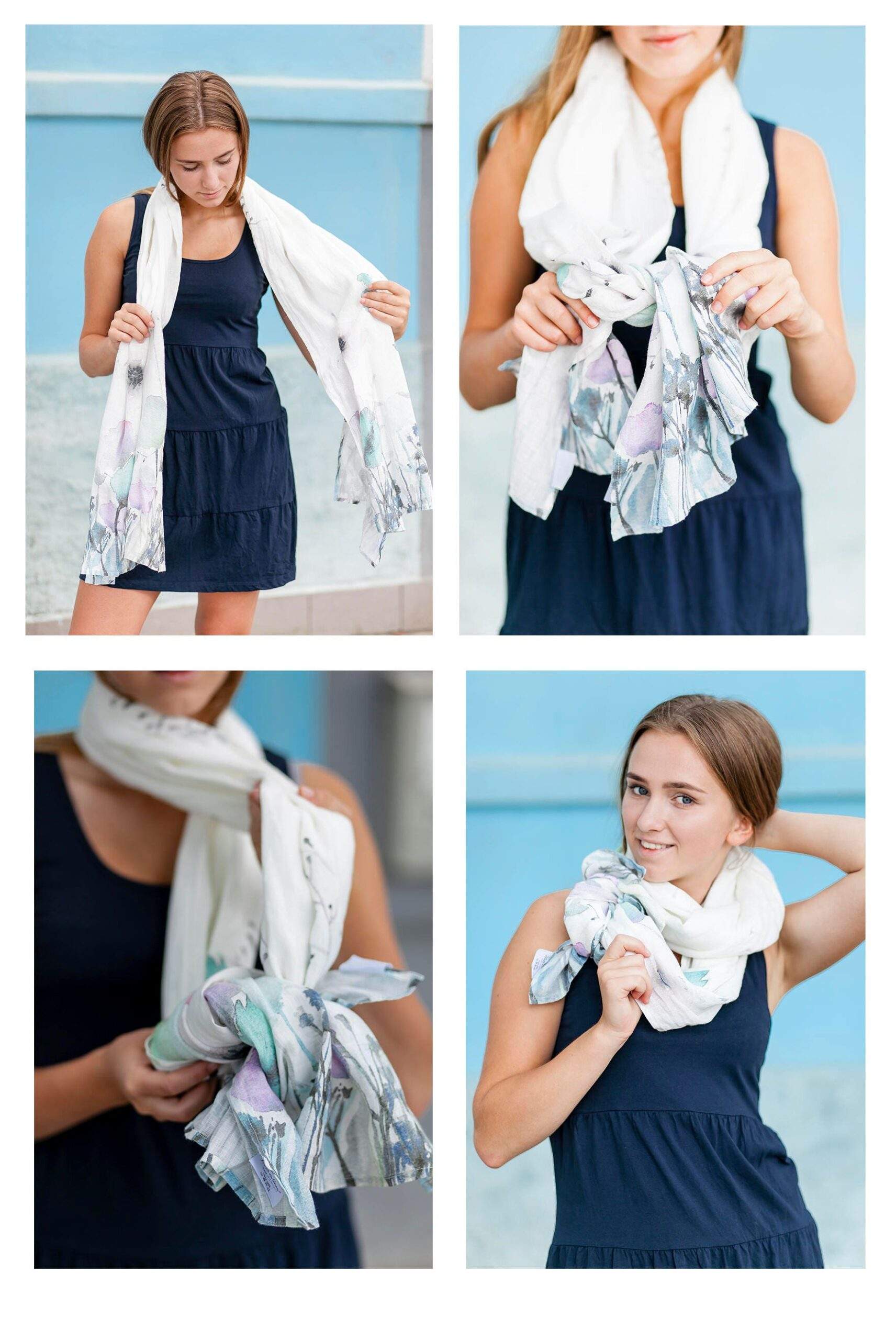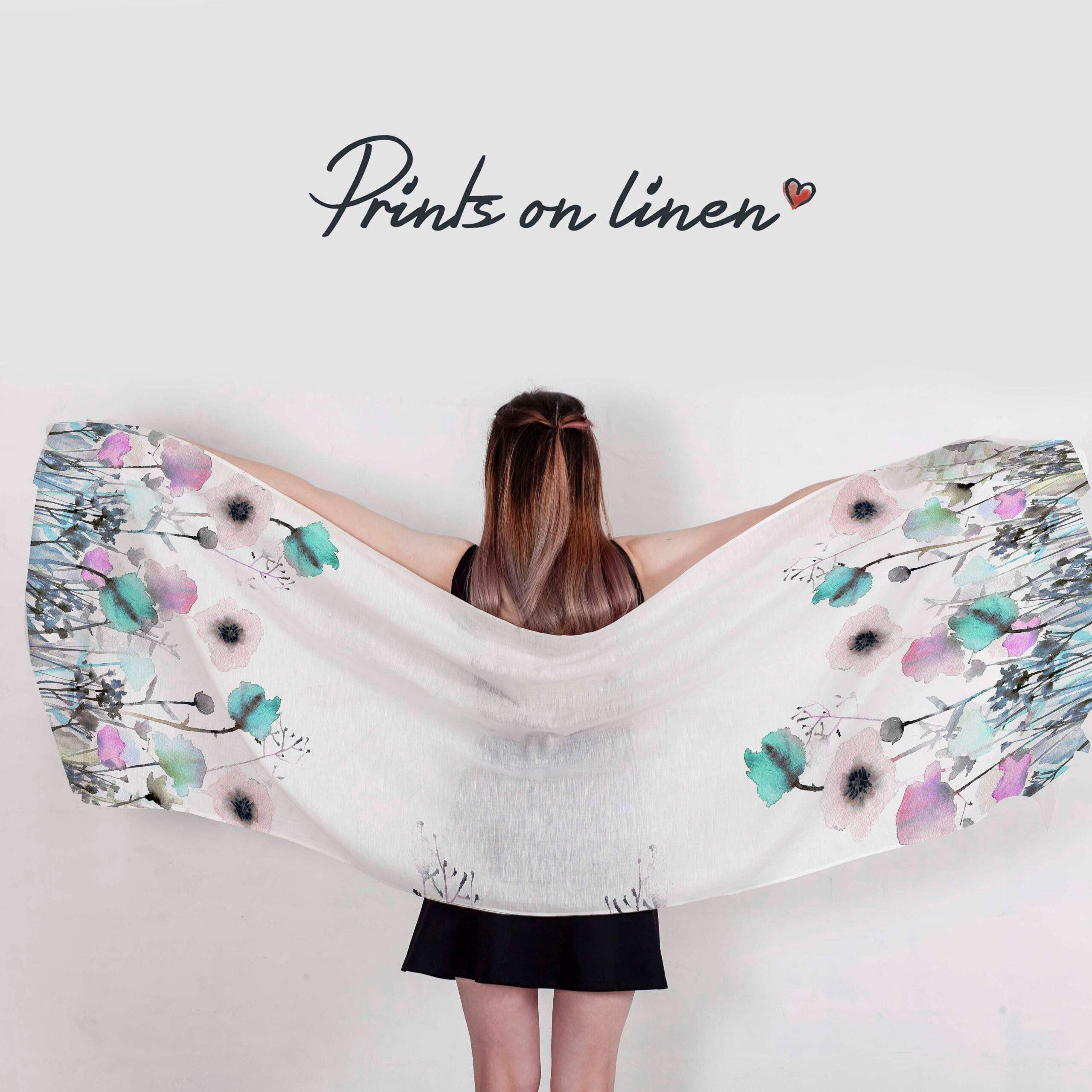 Hand made linen scarf with pastel poppies pattern printed on white natural linen (5 colours available).