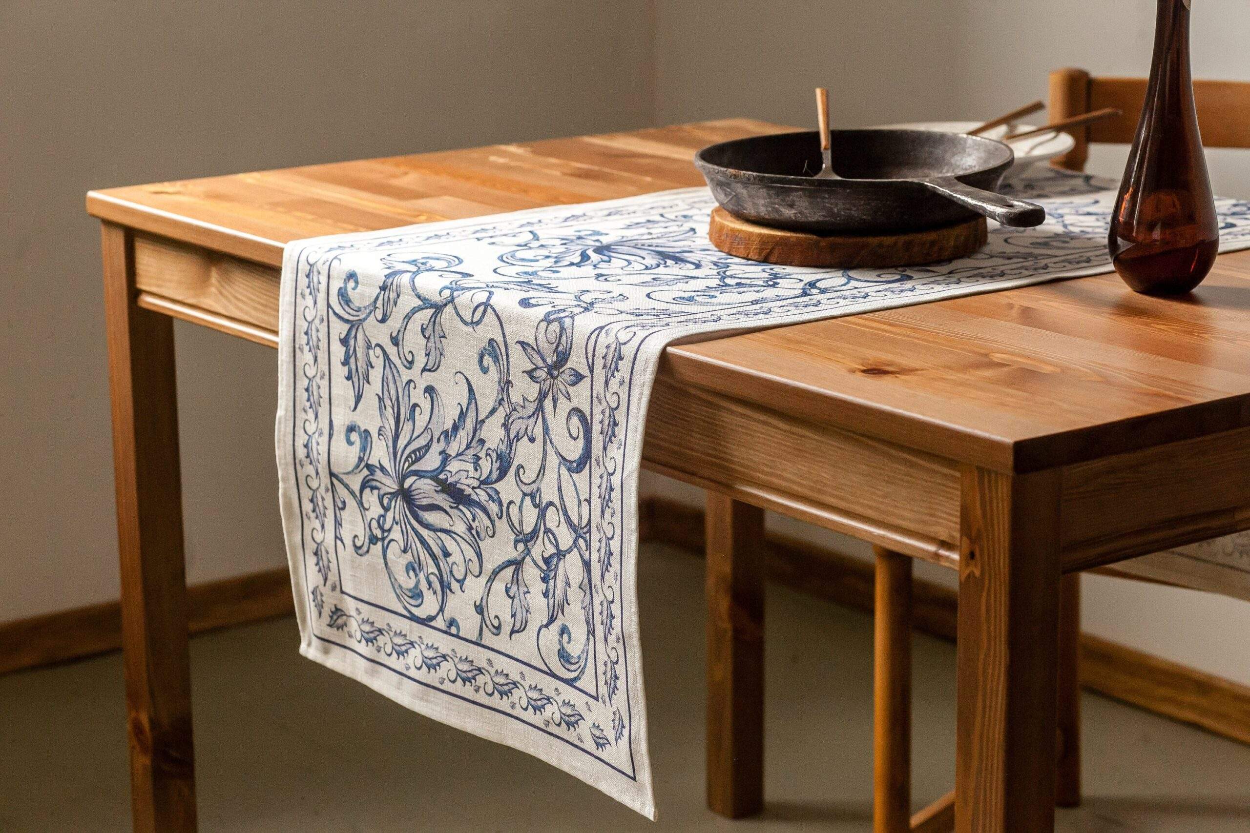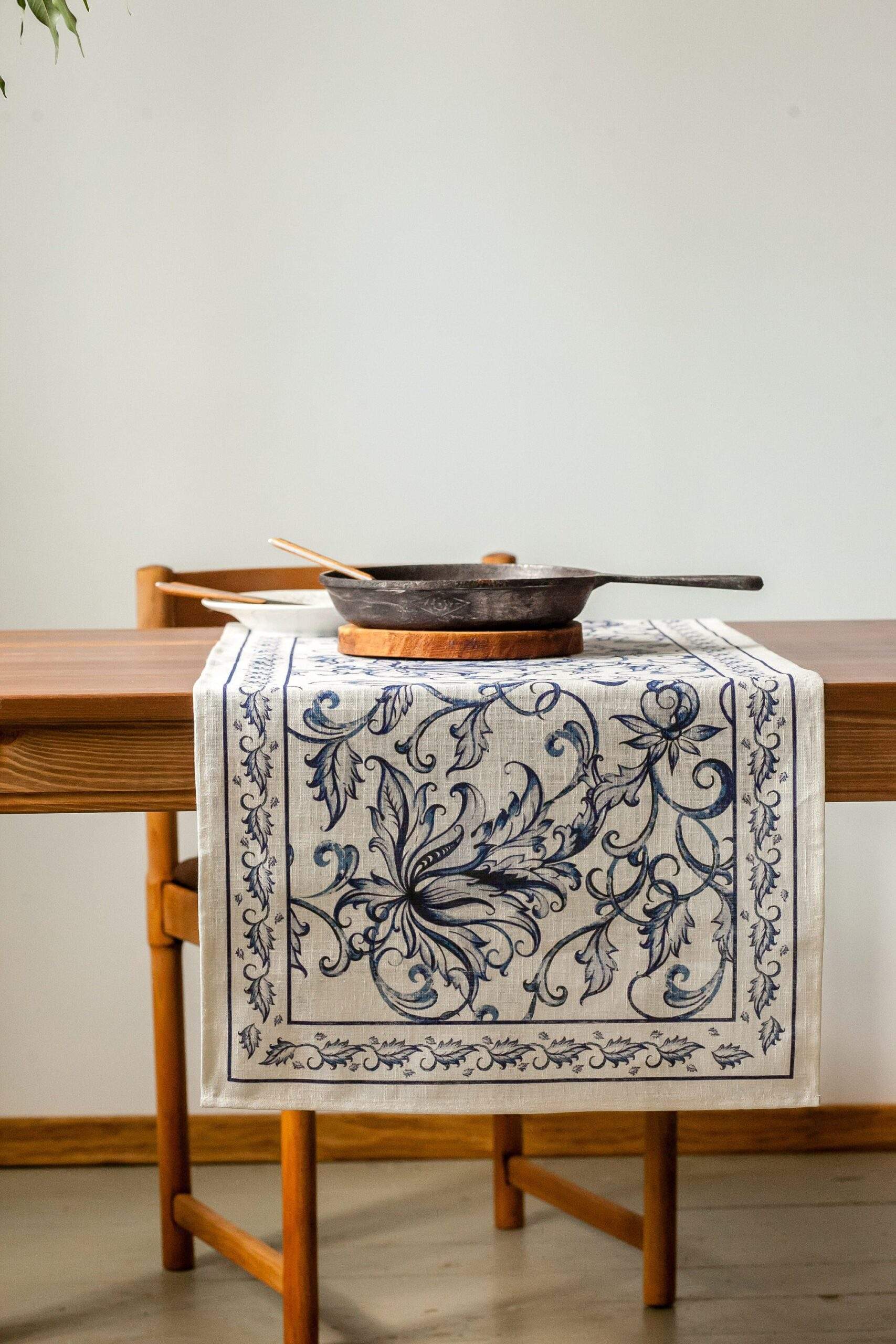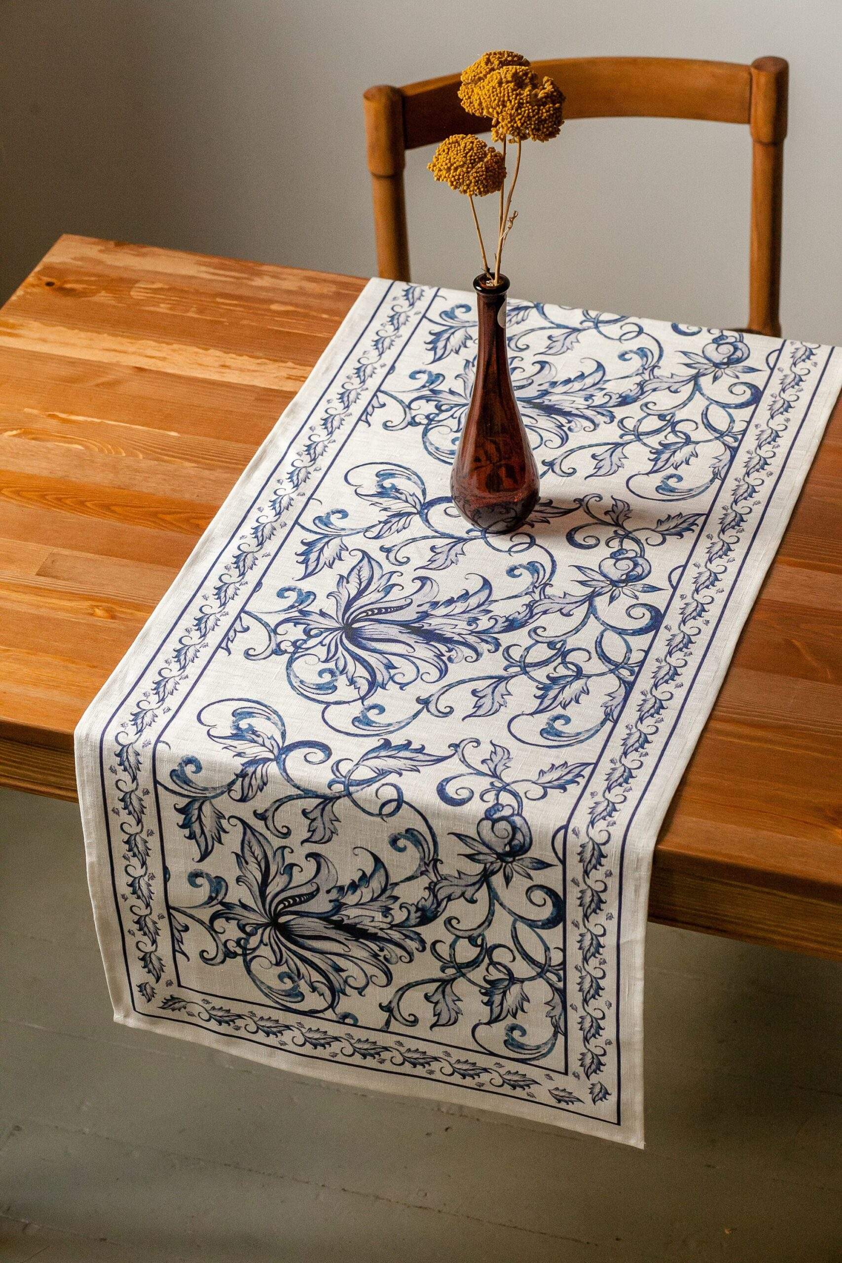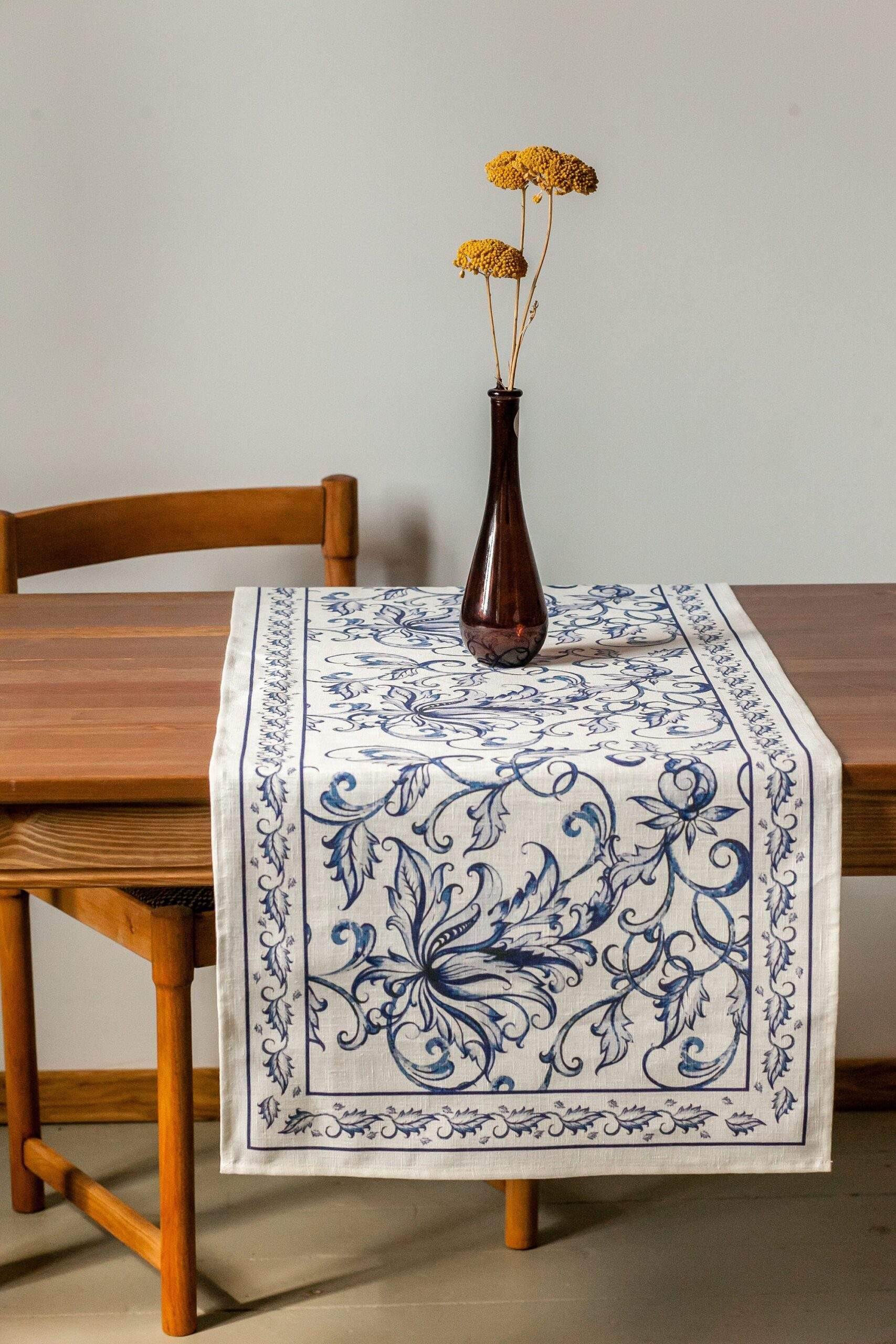 Linen table runner “Blue Willow”. This table runner can be order with same pattern linen table napkins, placemats or tablecloths (different size).