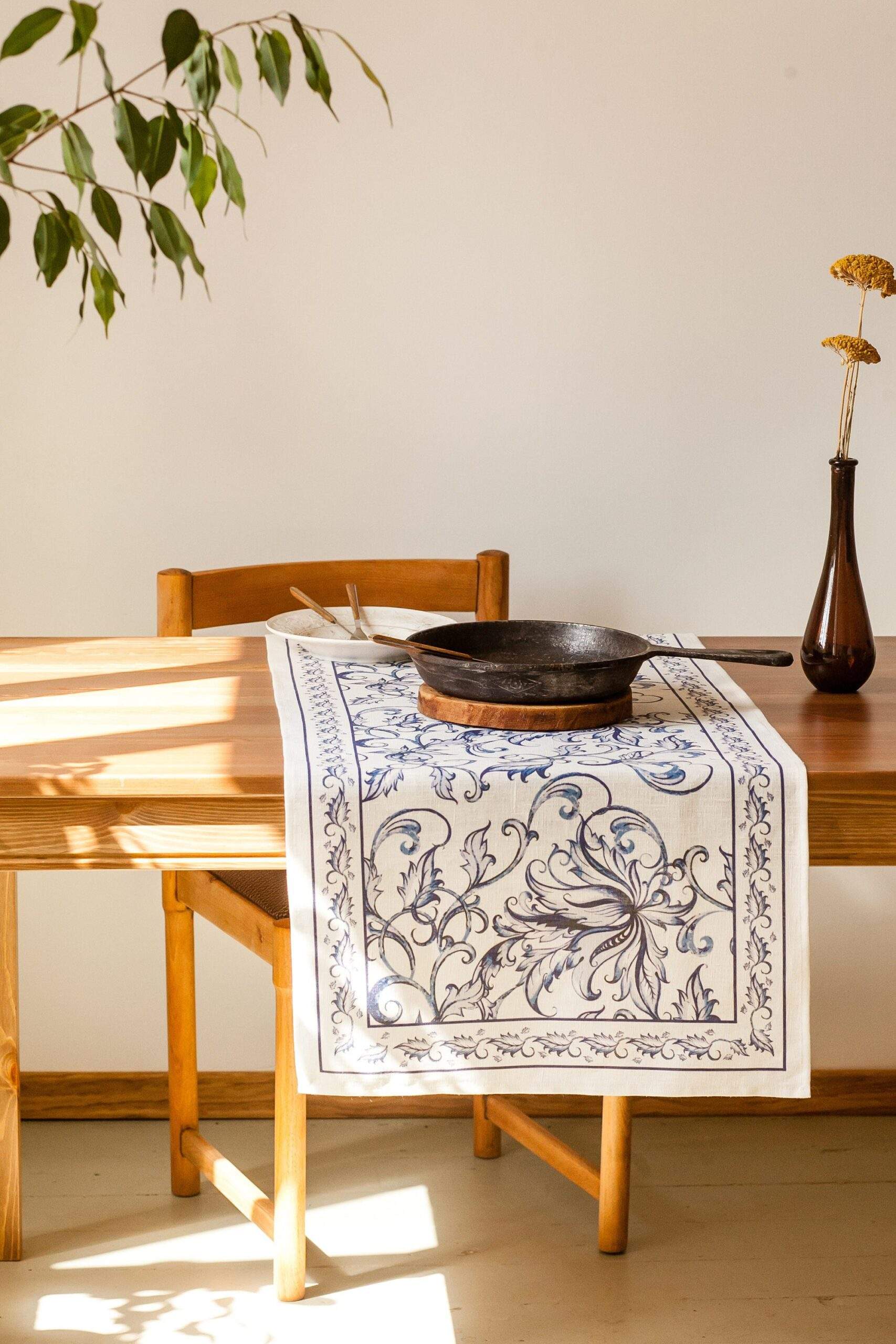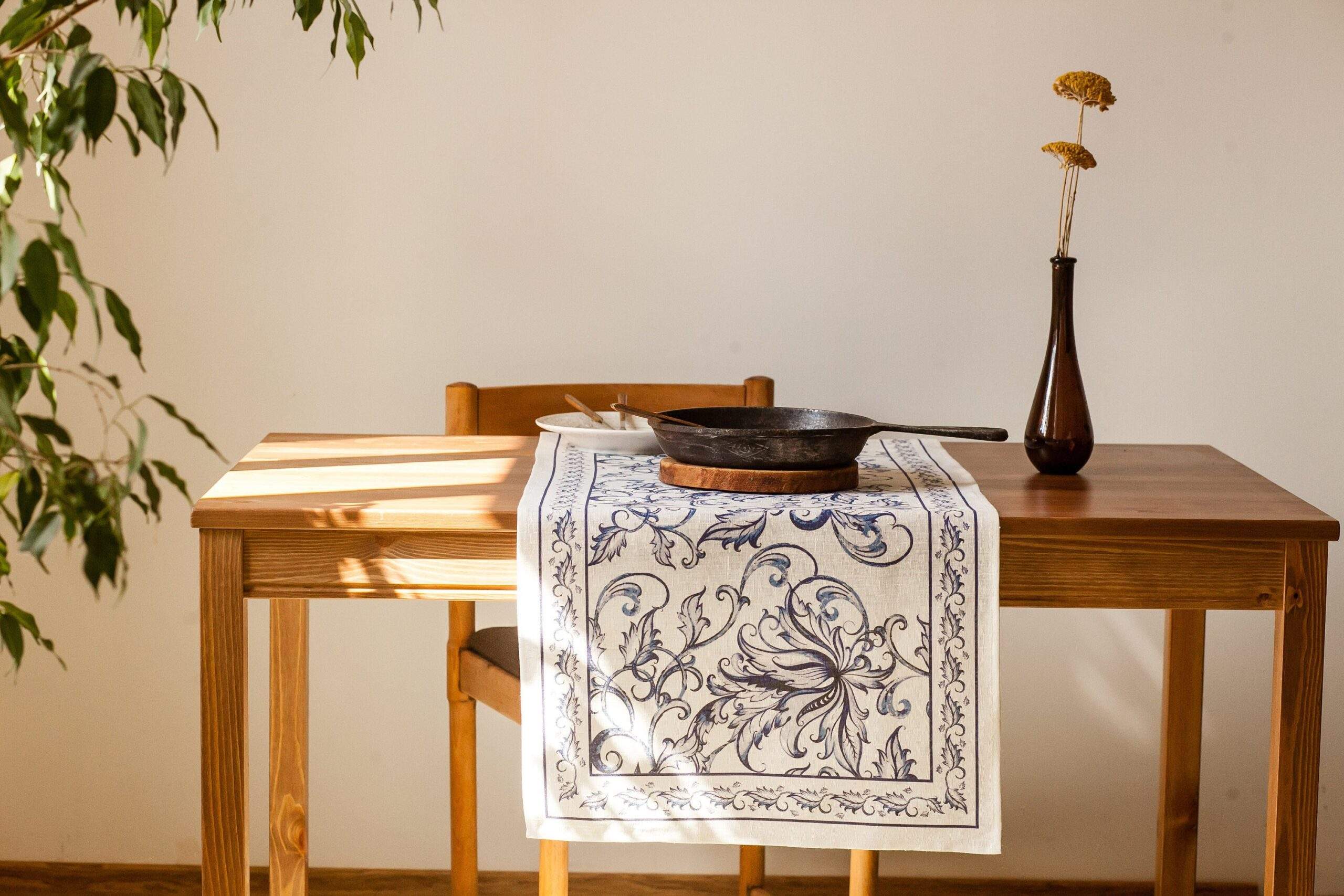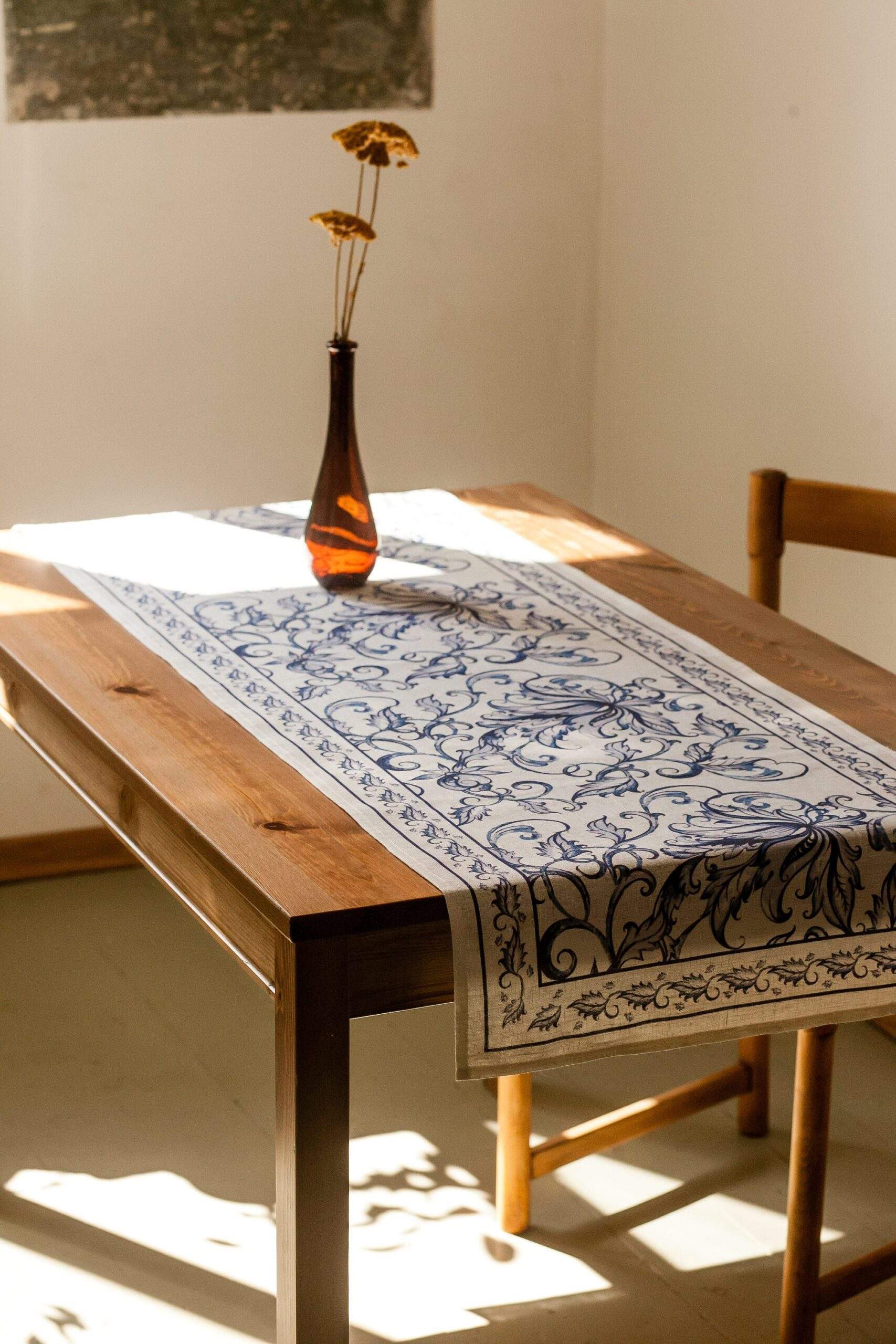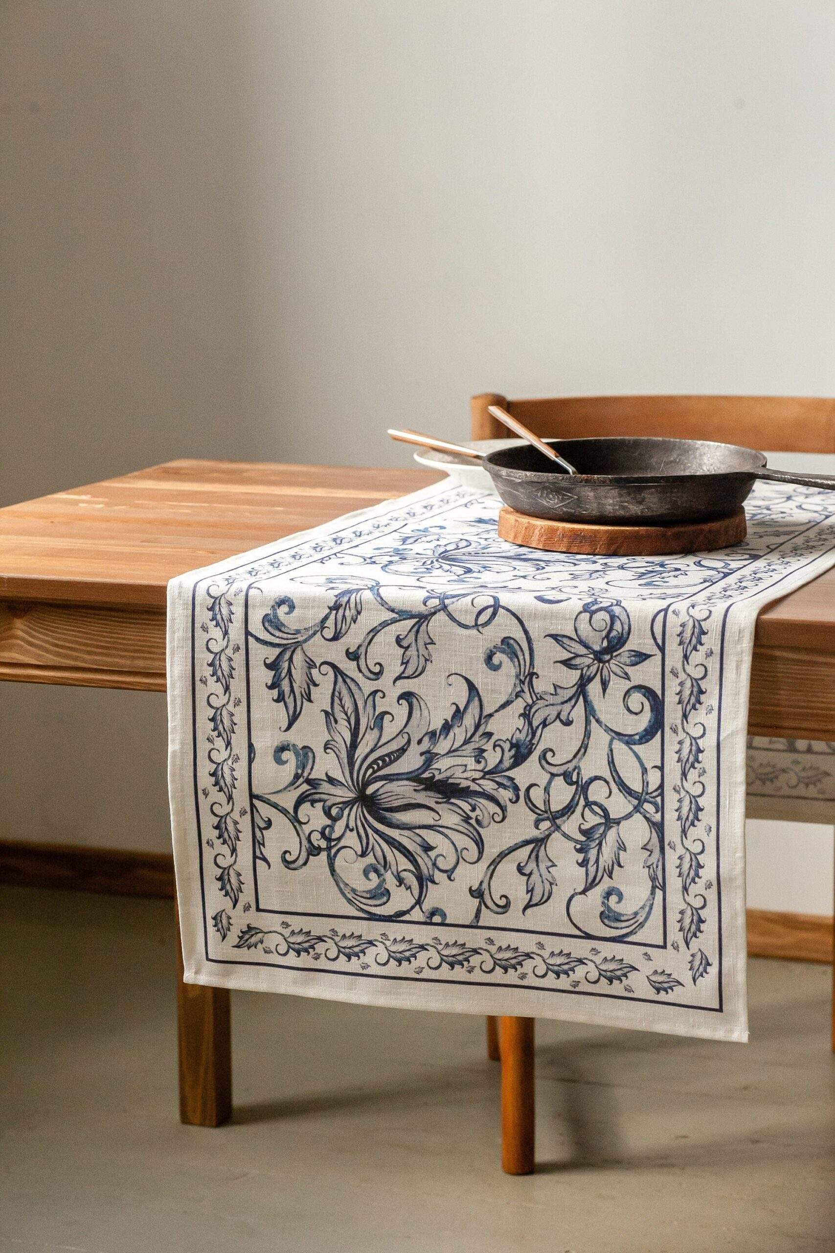 Linen table runner “Blue Willow”. This table runner can be order with same pattern linen table napkins, placemats or tablecloths (different size).
