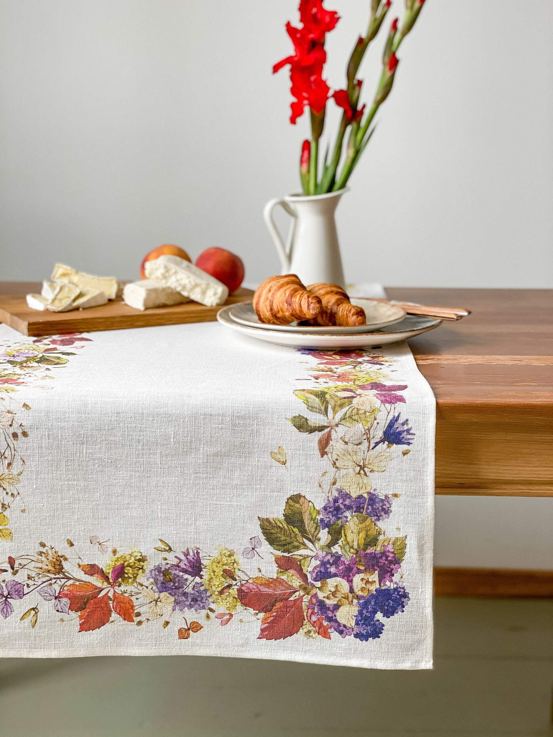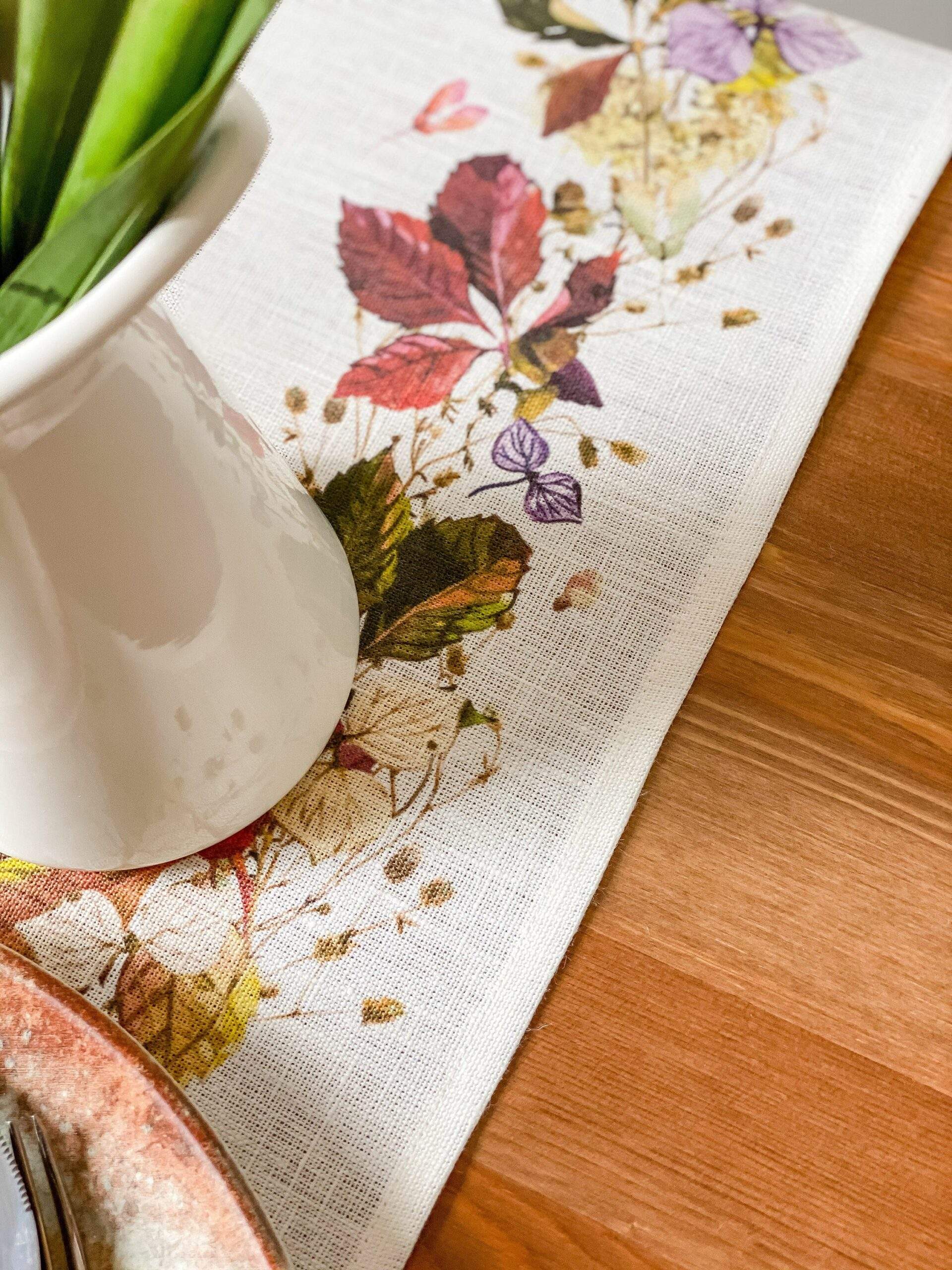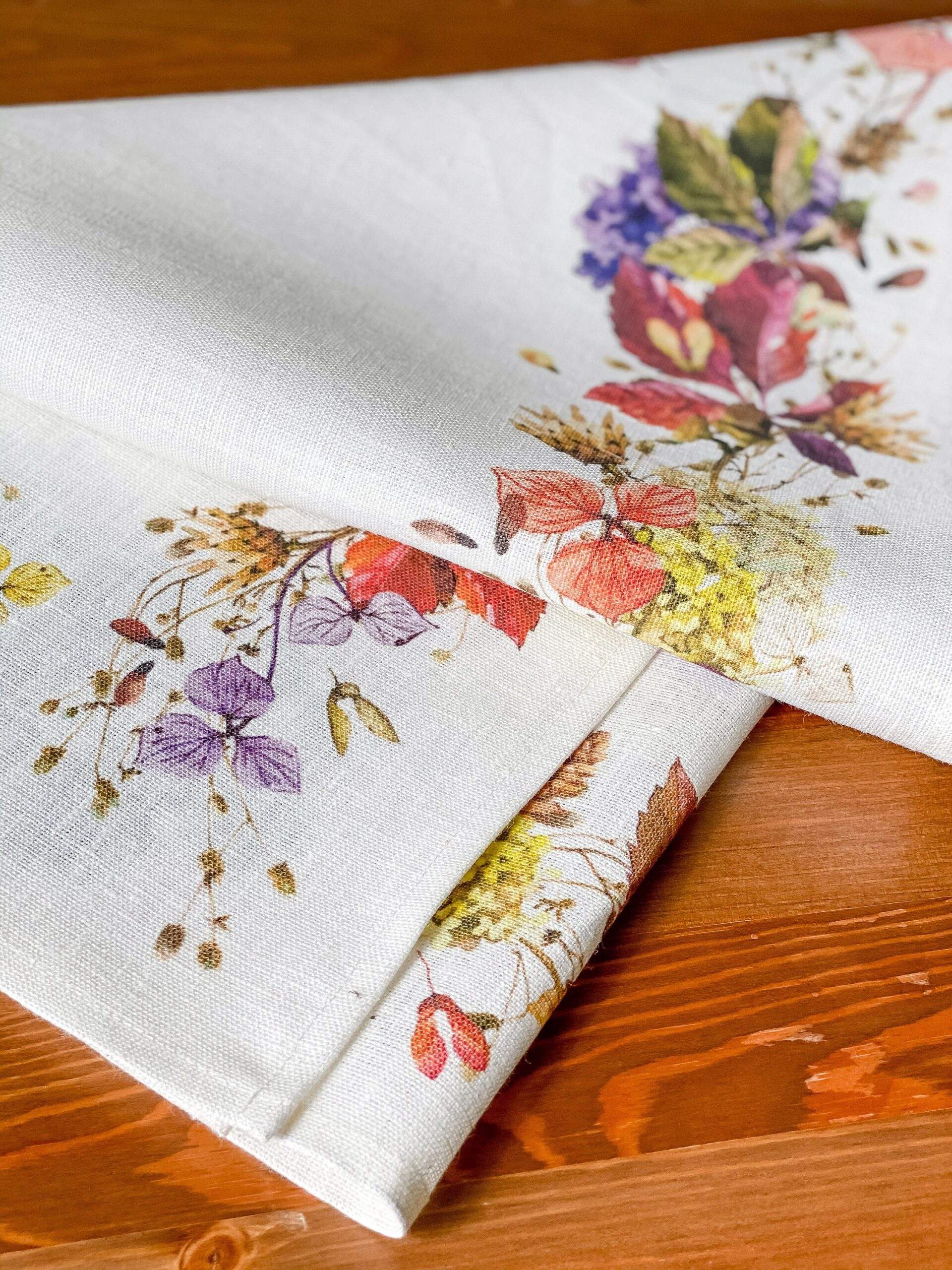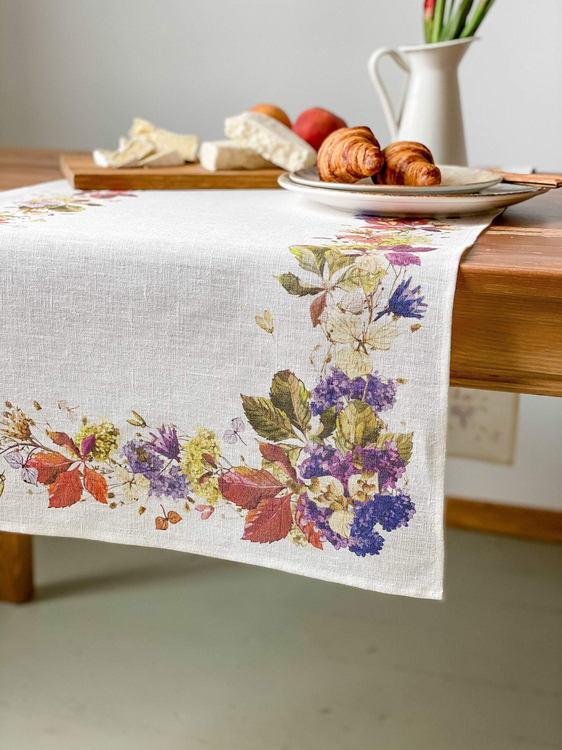 Linen table runner “Lovely Autumn” 100 % linen fabric. Matching linen napkins, placemats and tablecloth.