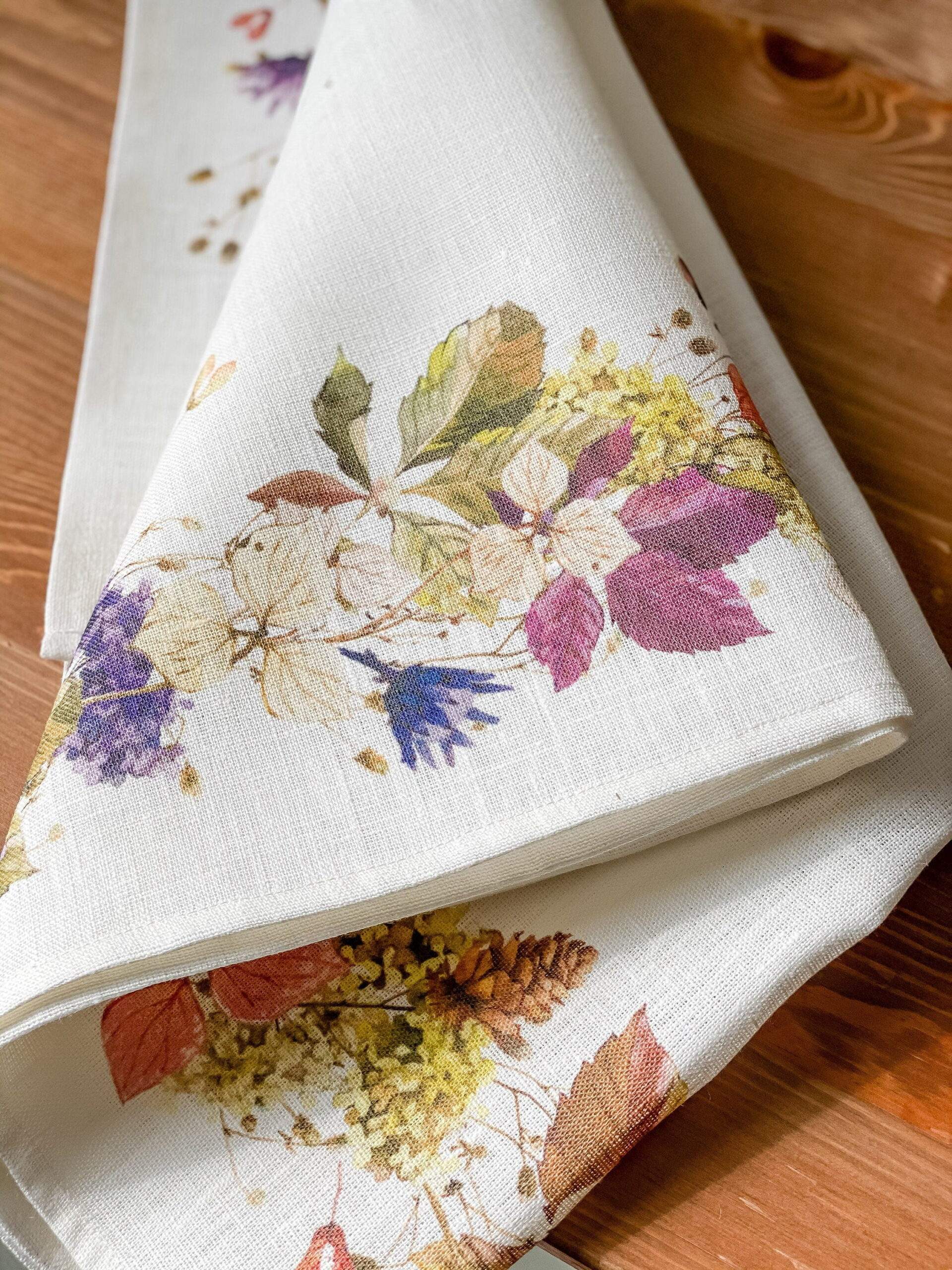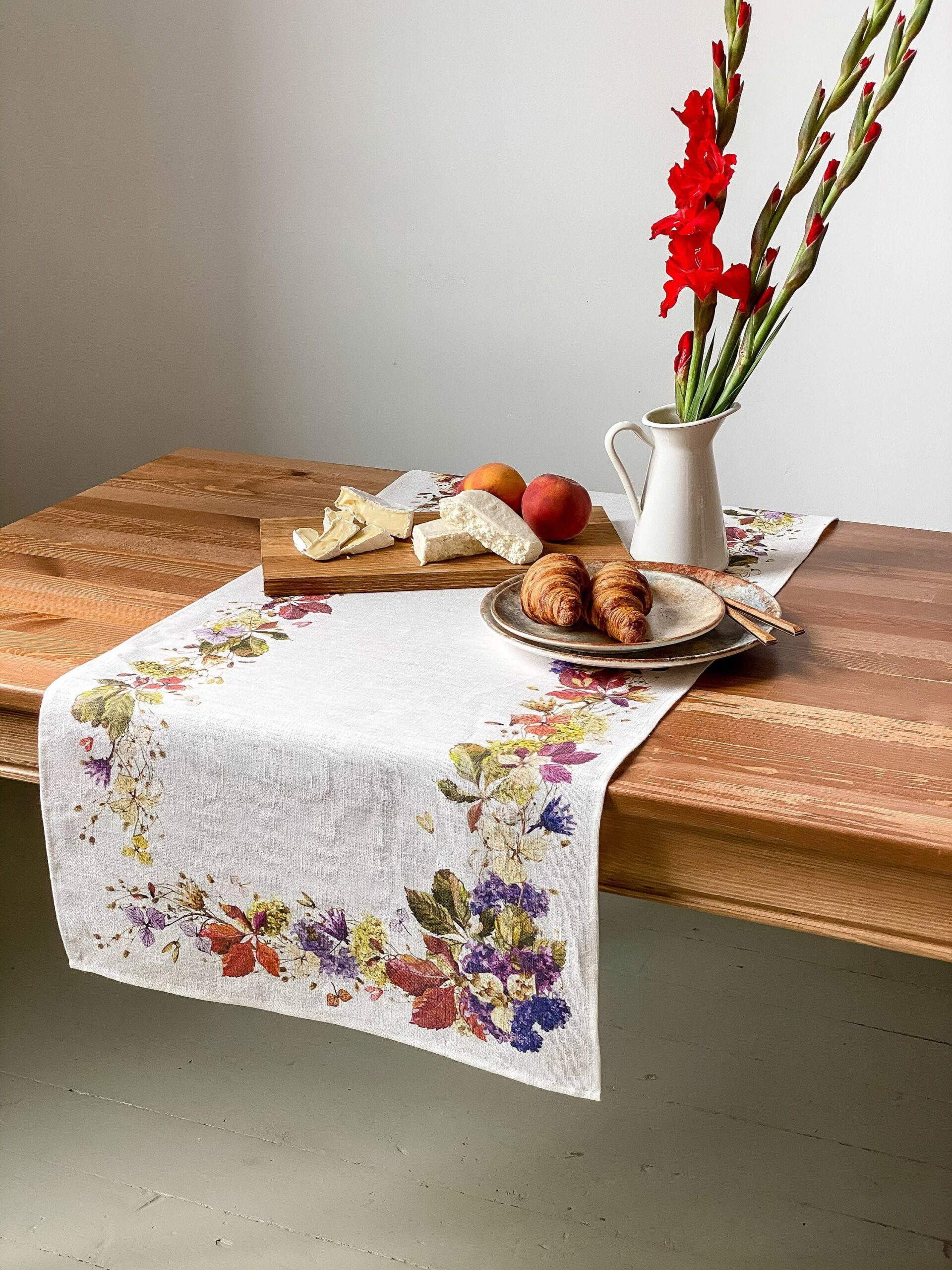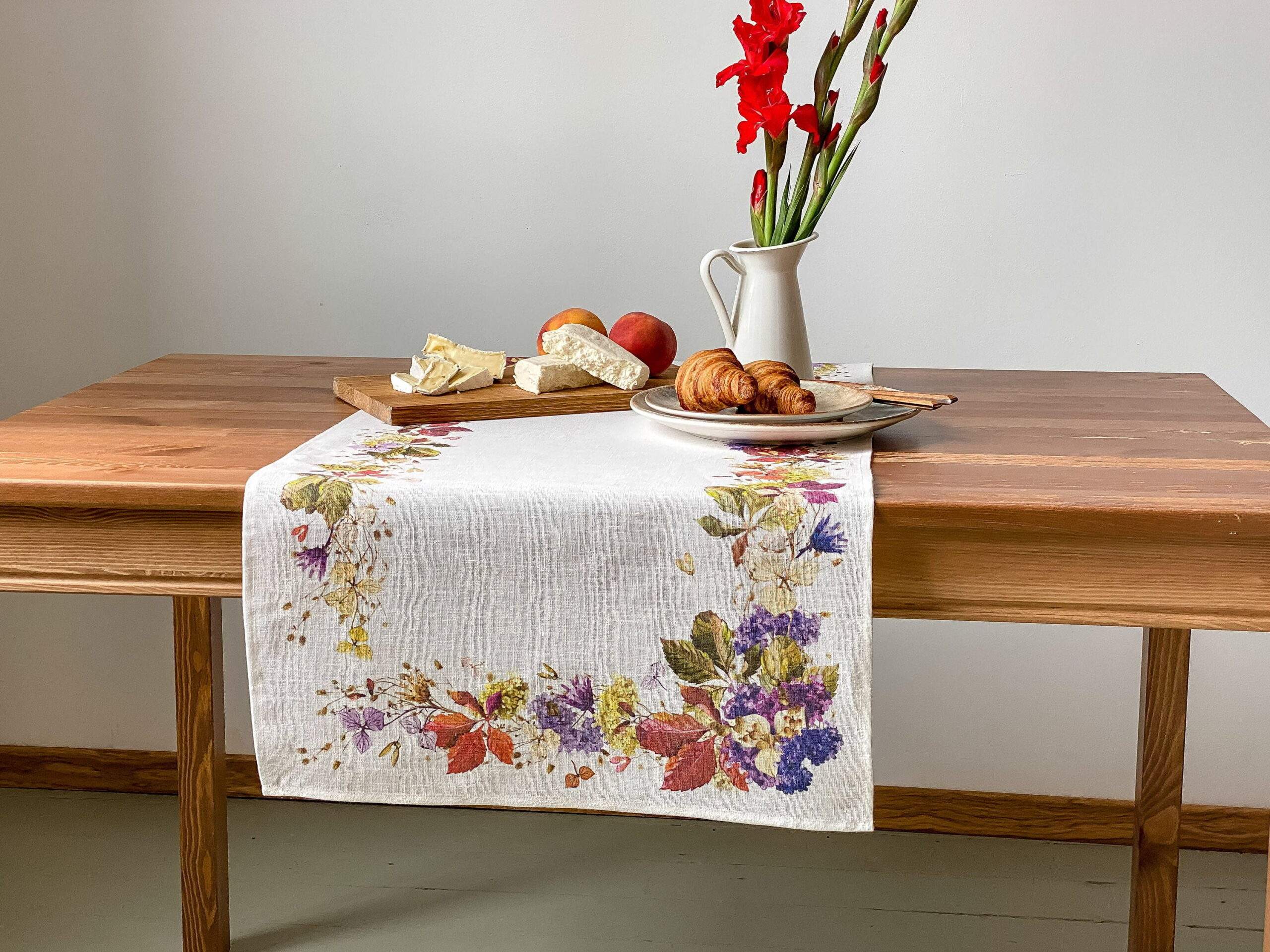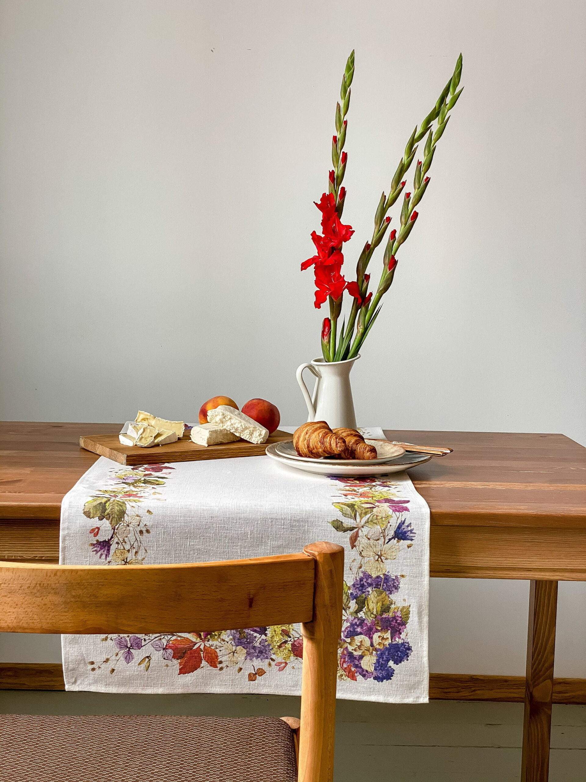 Linen table runner “Lovely Autumn” 100 % linen fabric. Matching linen napkins, placemats and tablecloth.