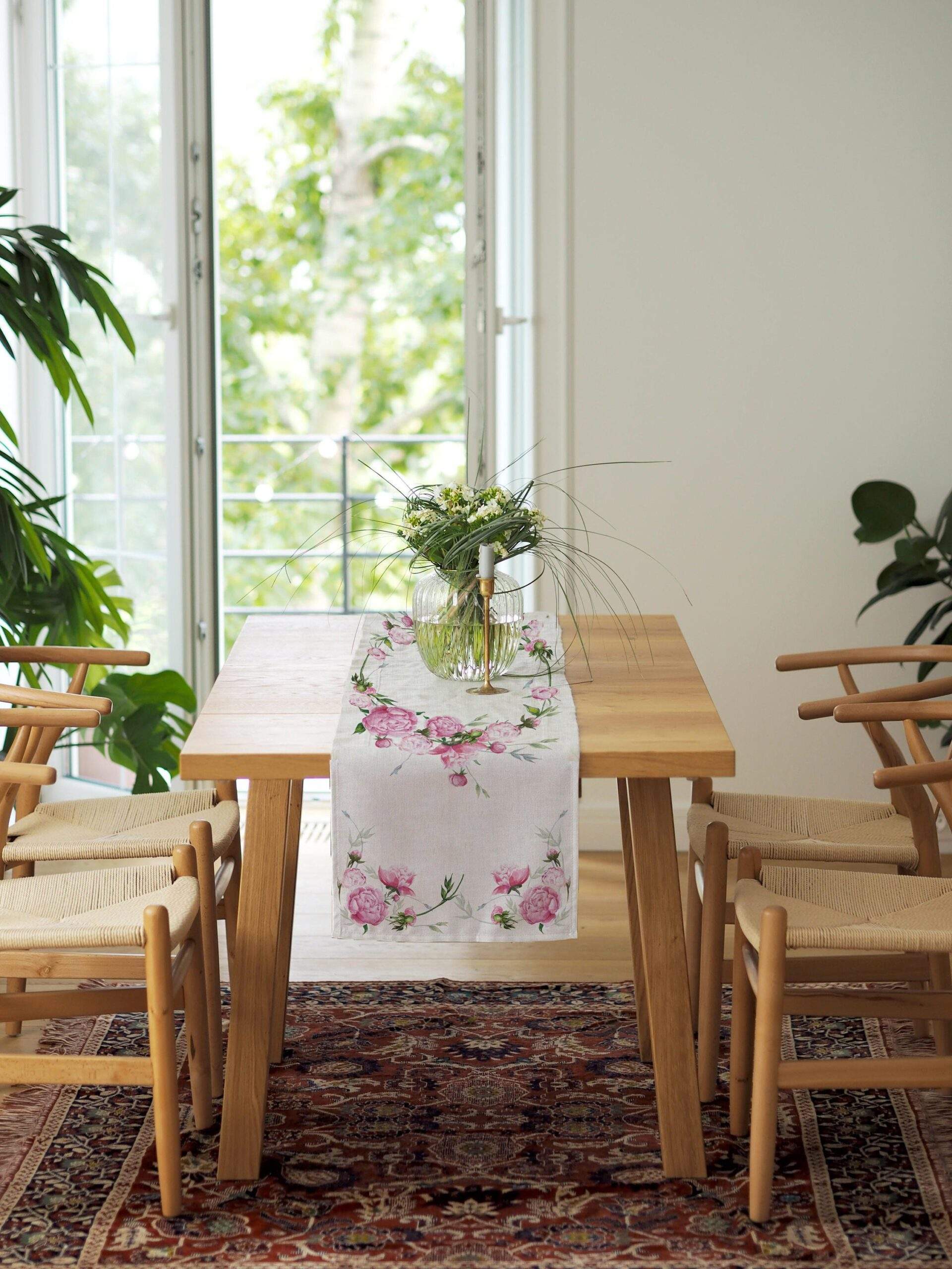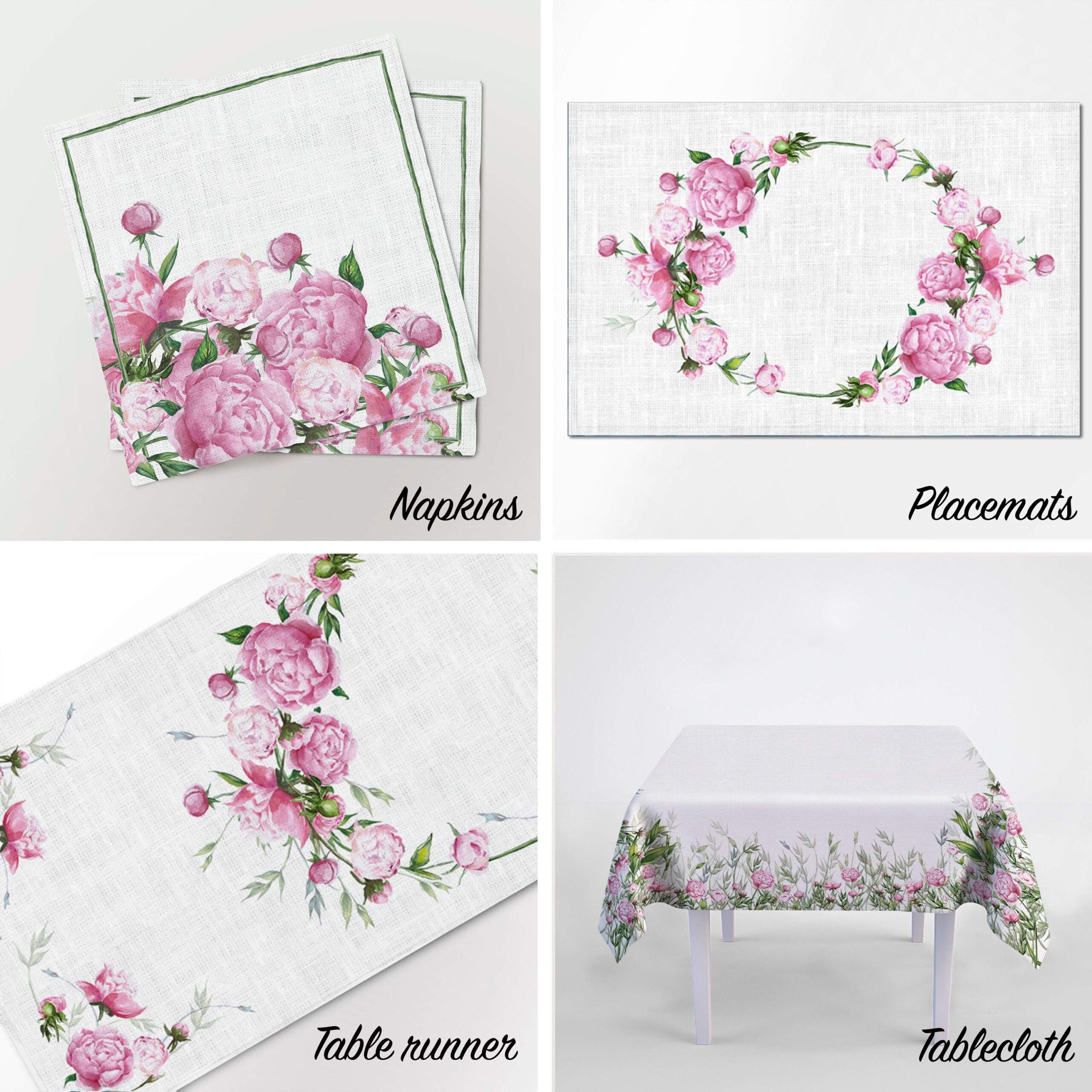 Matching linen set, Linen table runner with peonies pattern made of 100 % natural linen. Purple home decor, party decor. Idea for wedding table decor. This linen table runner can be printed on white / natural linen fabric.