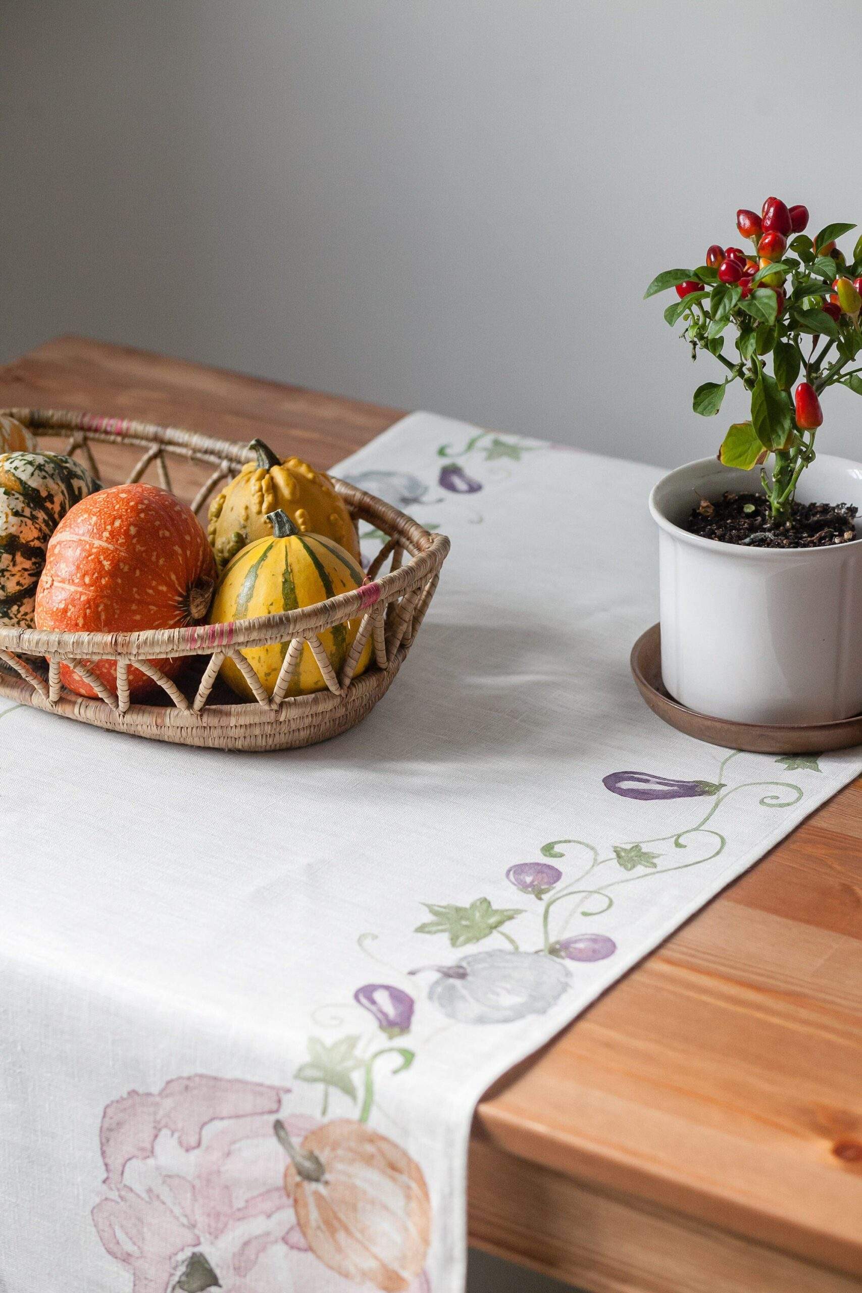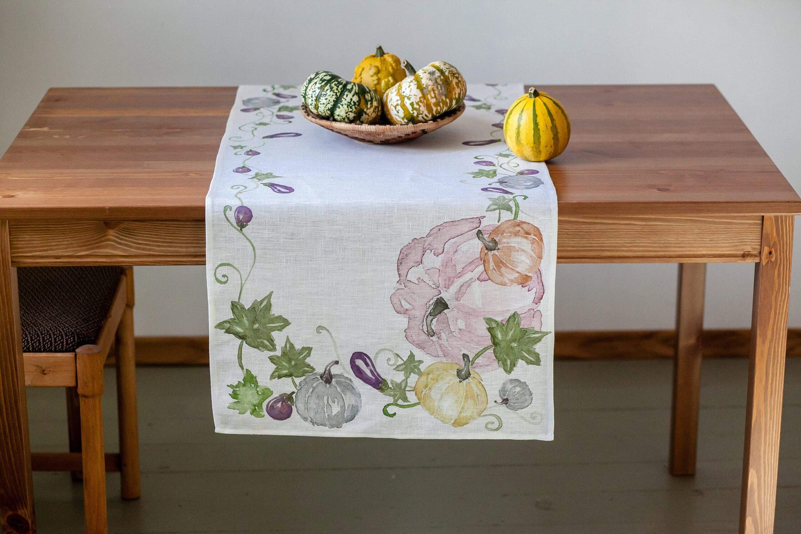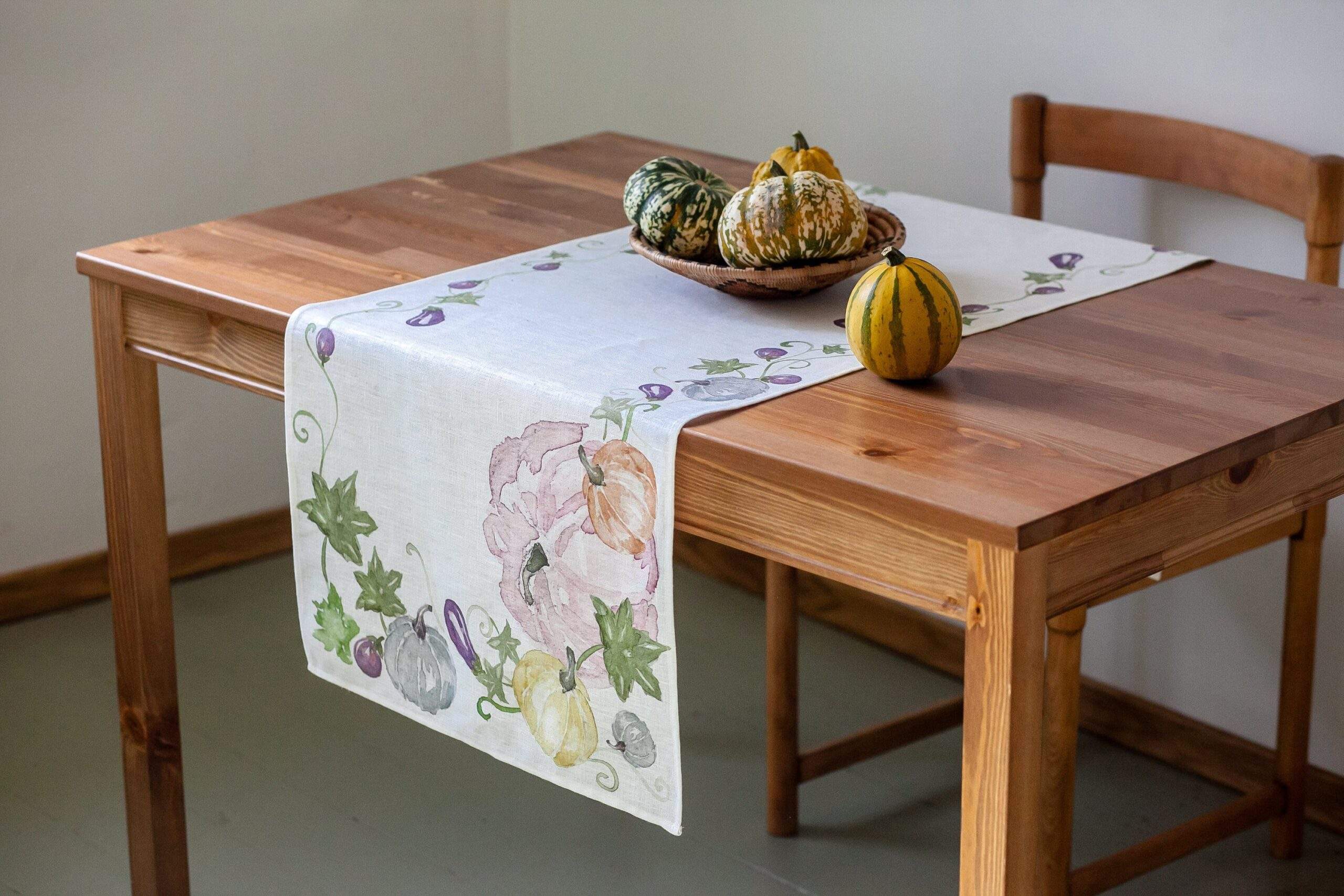 Linen table runner made of 100 % natural white linen with pumpkins print.