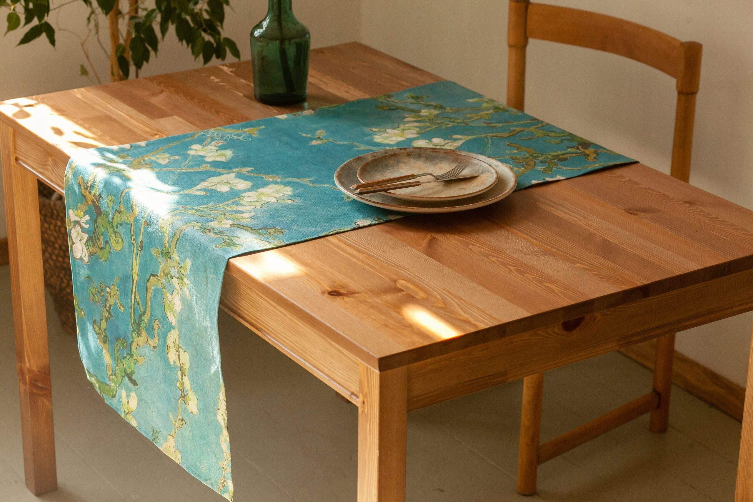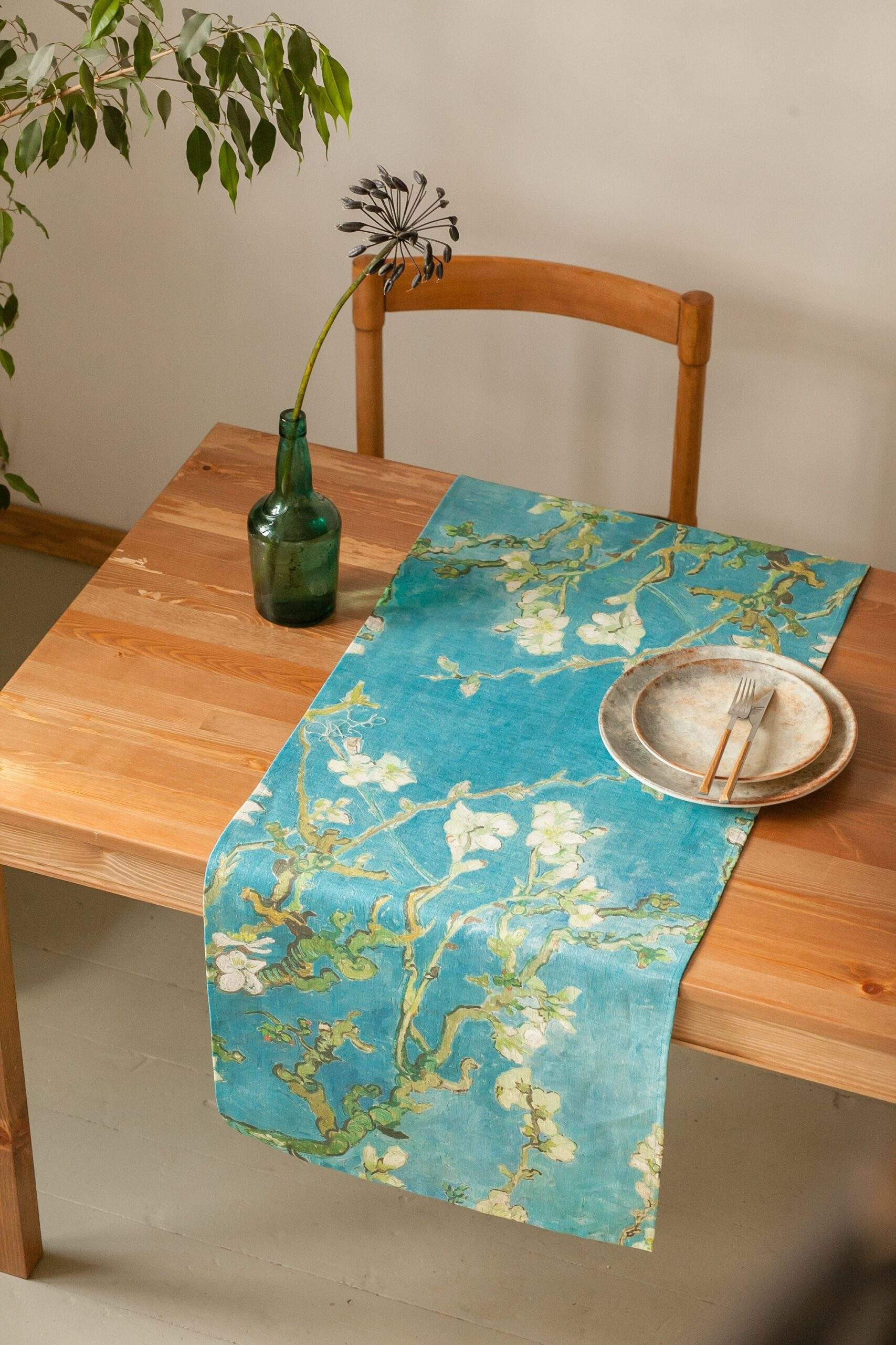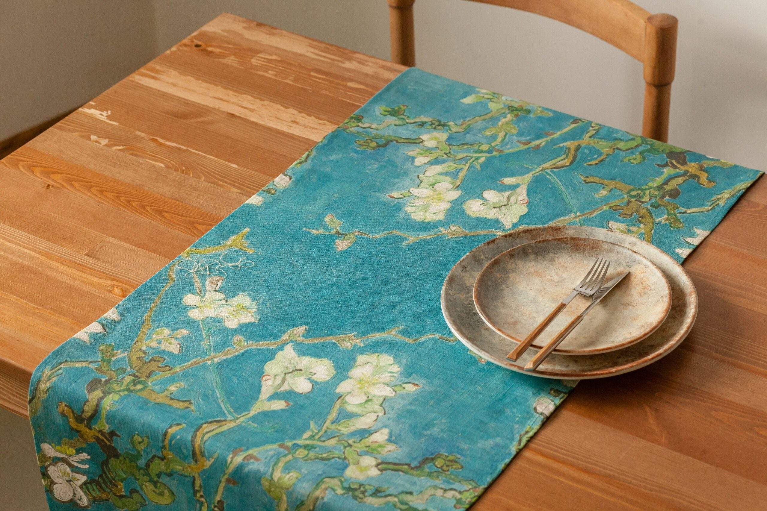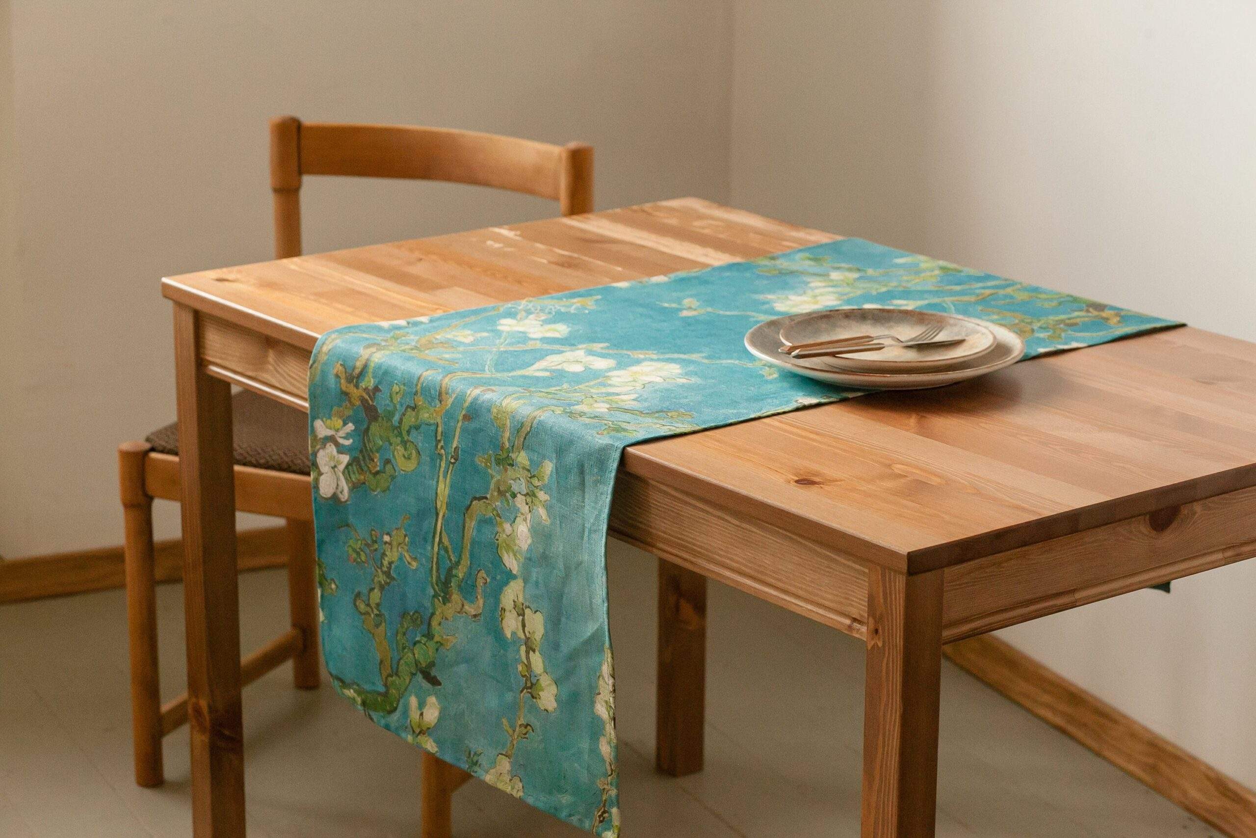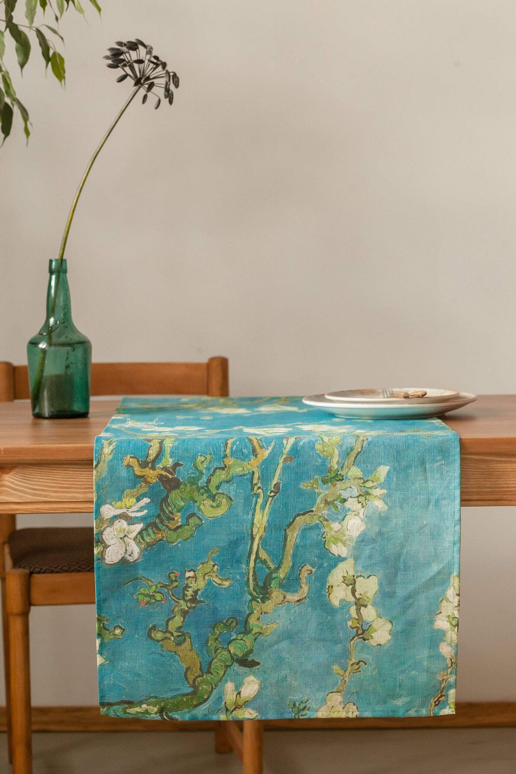 Linen table runner “Almond Blossom” by Vincent van Gogh. Hand made in Lithuania. We have matching linen napkins and placemats sets.