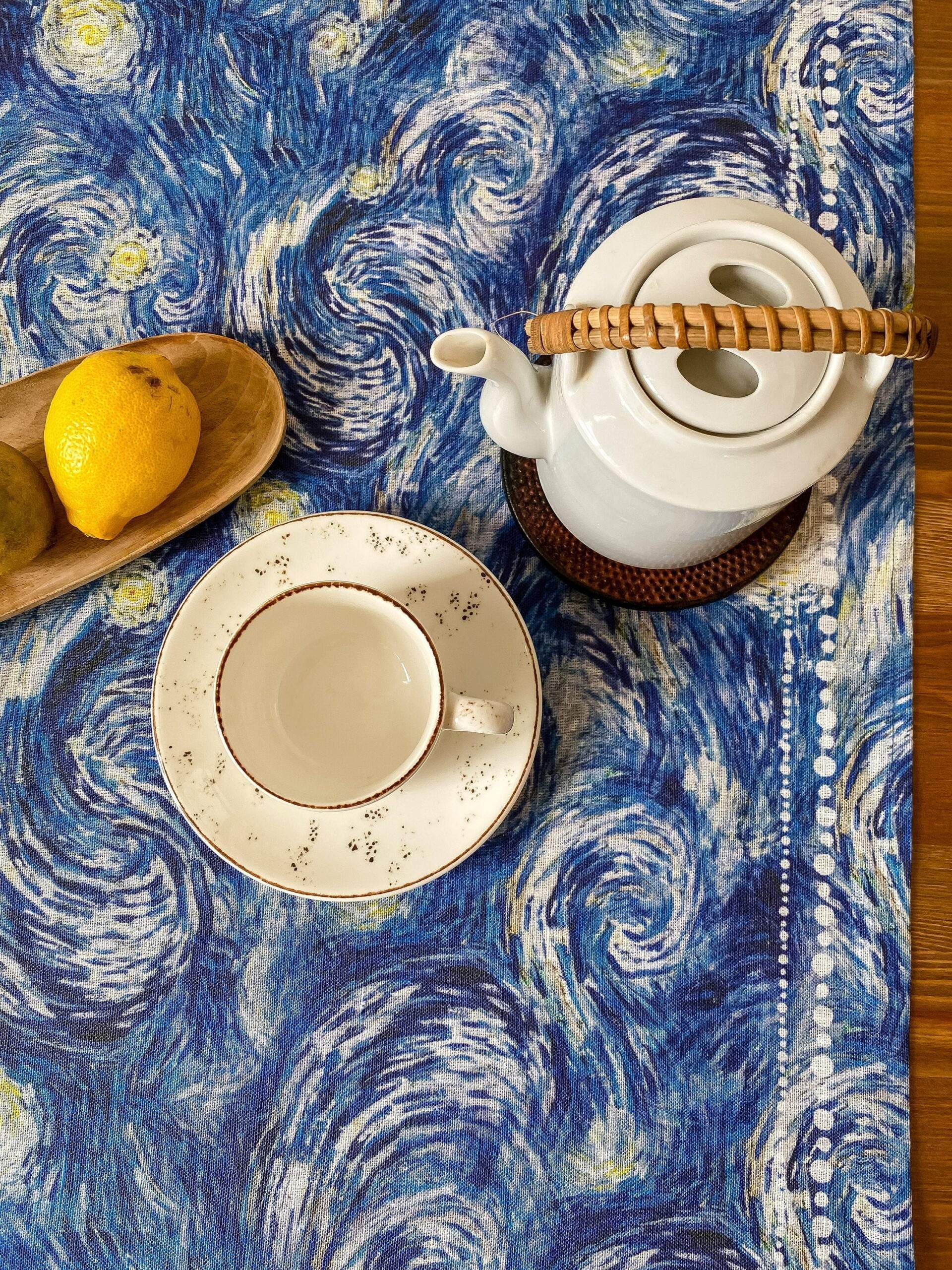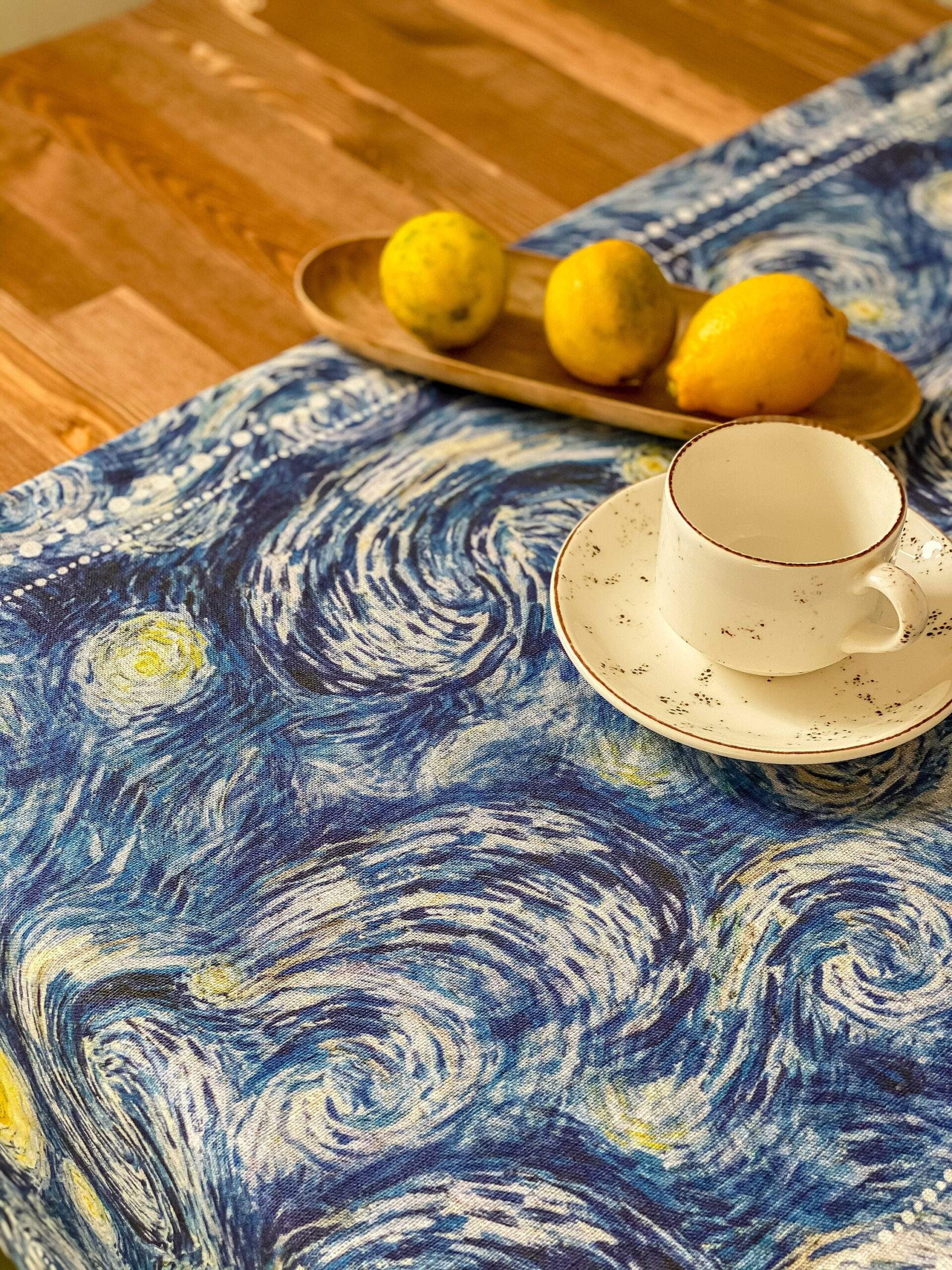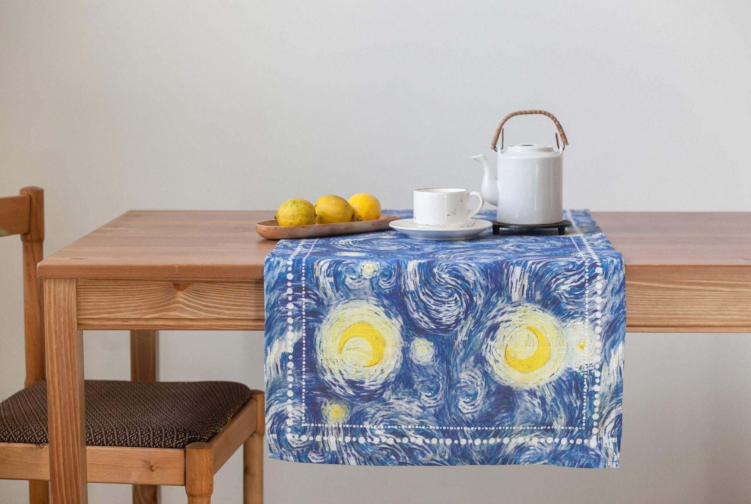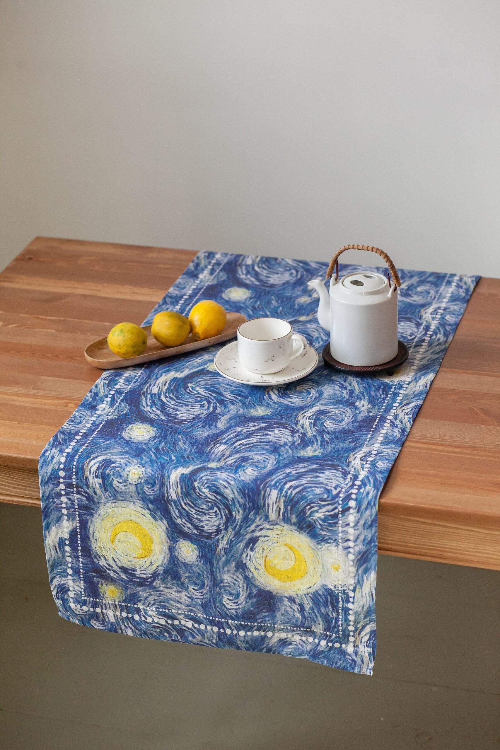 Linen table runner with Vincent van Gogh “Starry night”, made of 100 % natural linen. Unique home decor, party decor. Idea for wedding table decor. This linen table runner can be printed on white linen fabric. This table runner can be order with same pattern linen table napkins, placemats or tablecloths (different sizes).