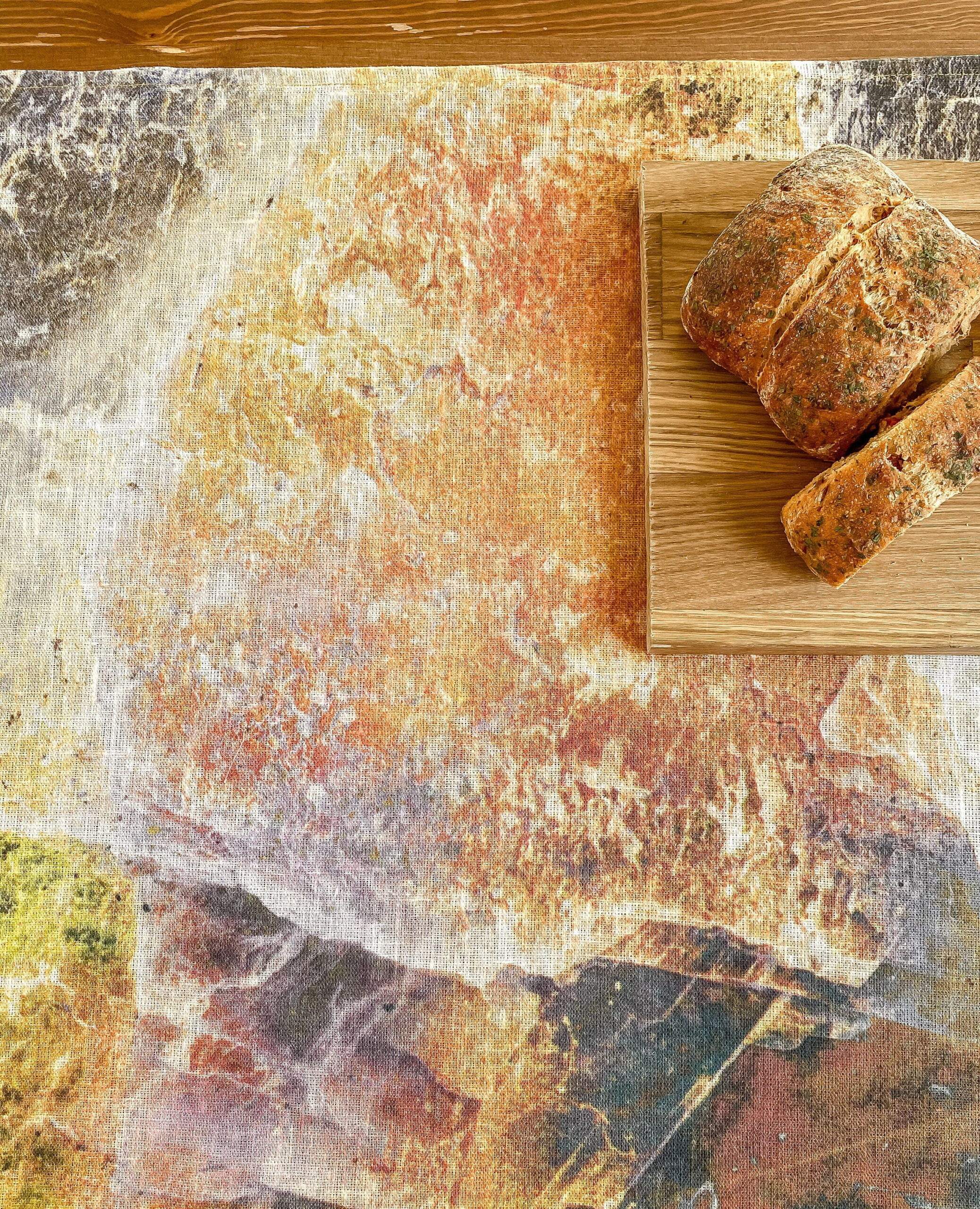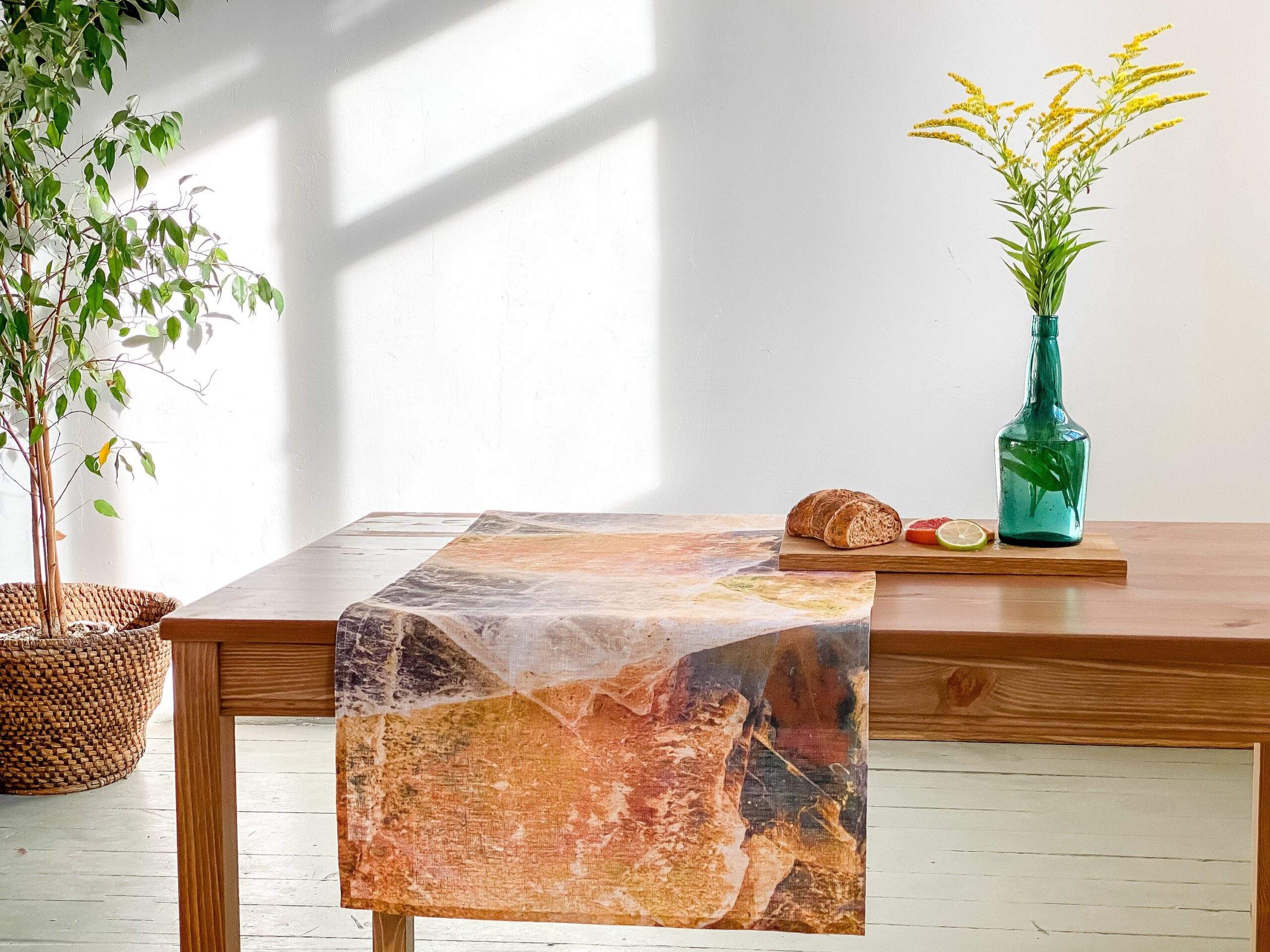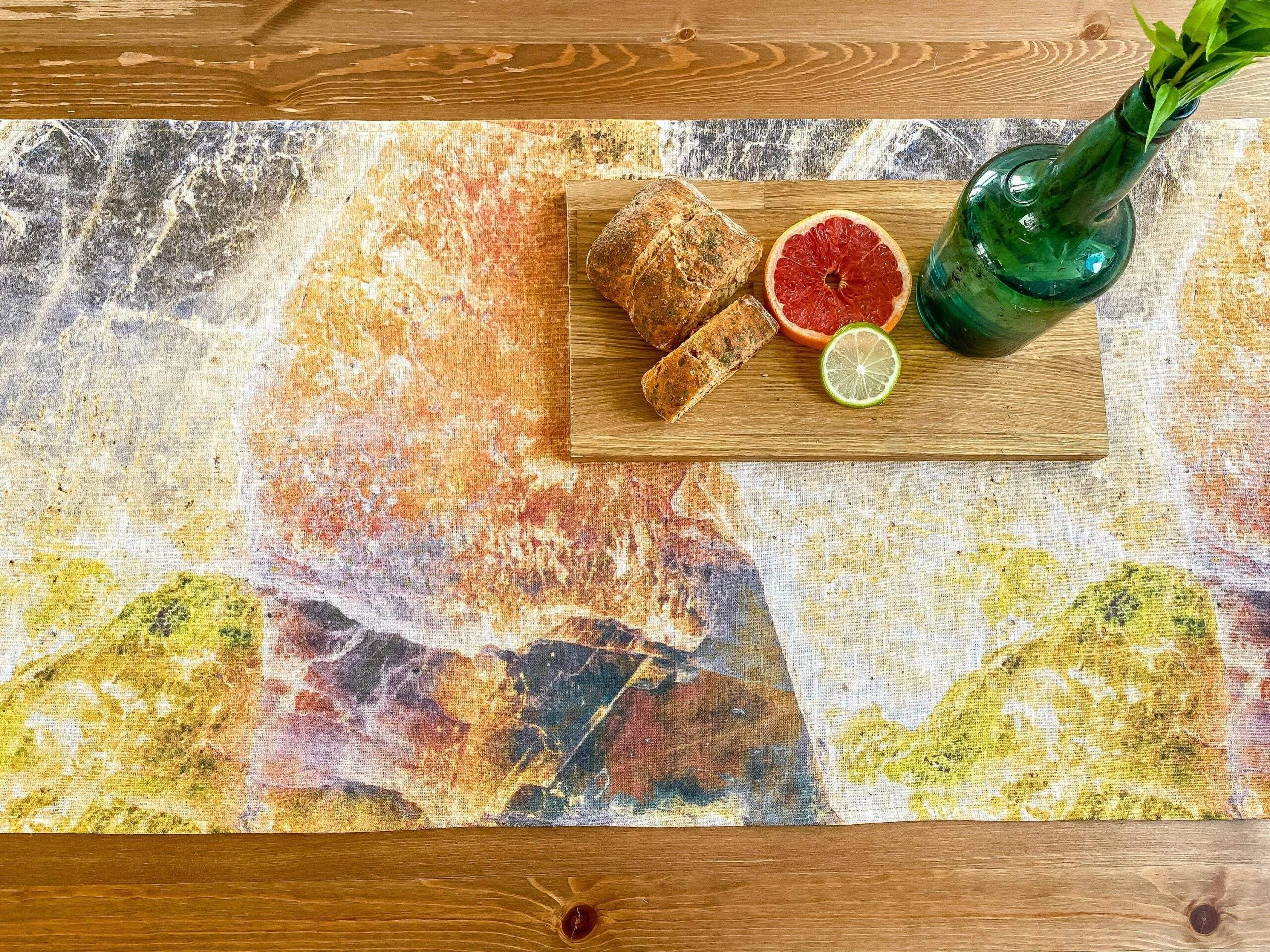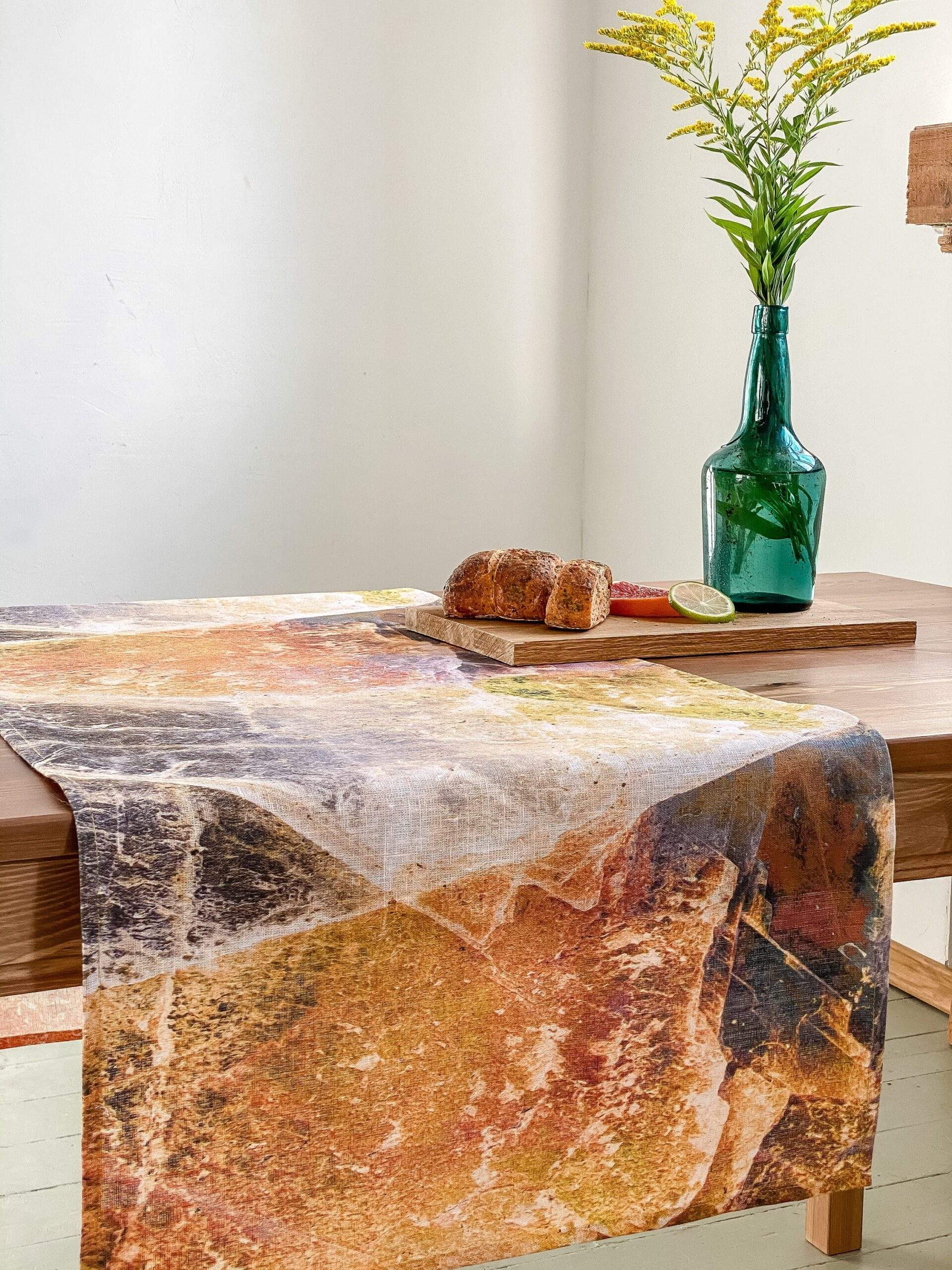 Linen table runner with WABI SABI pattern made of 100 % natural linen. Unique home decor, party decor. Idea for VINTAGE wedding table decor. This linen table runner can be printed on white linen fabric. This table runner can be order with same pattern linen table napkins, placemats. or tablecloths (different size).