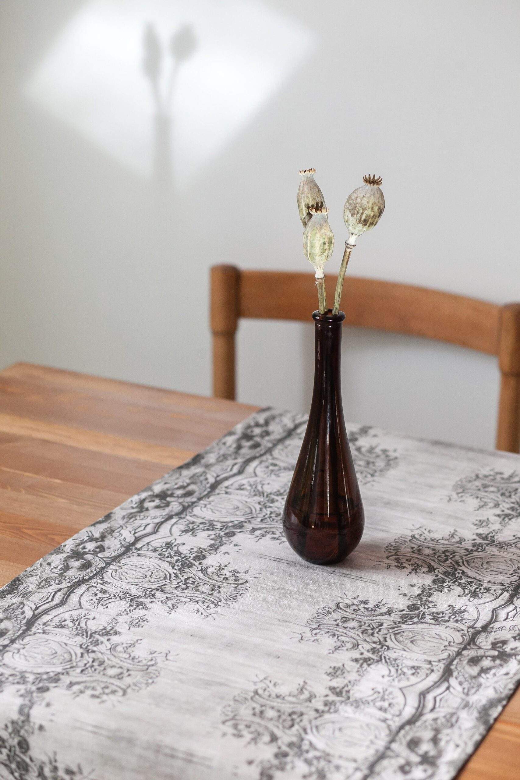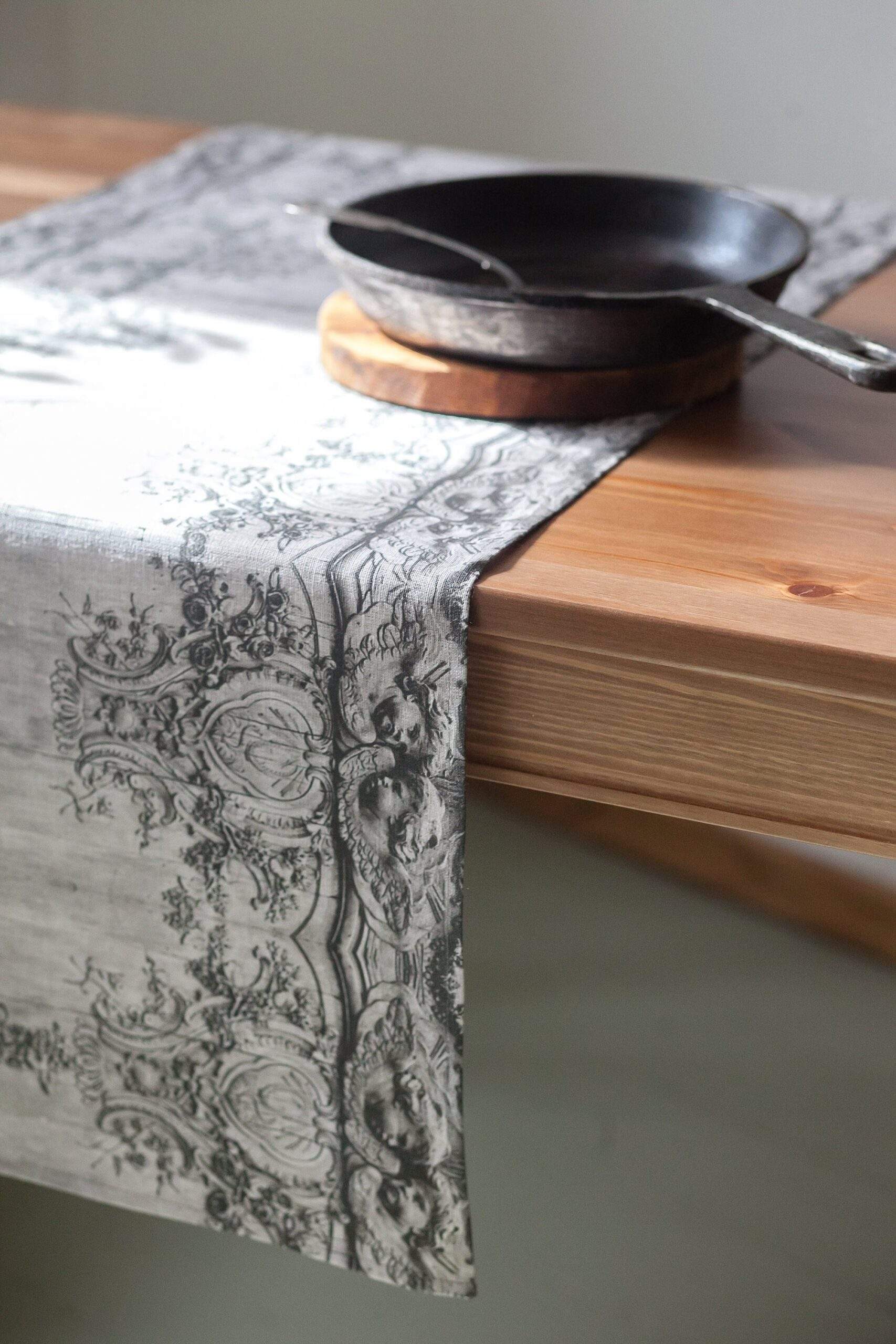 Wabi-sabi style linen table runner with vintage art deco pattern.