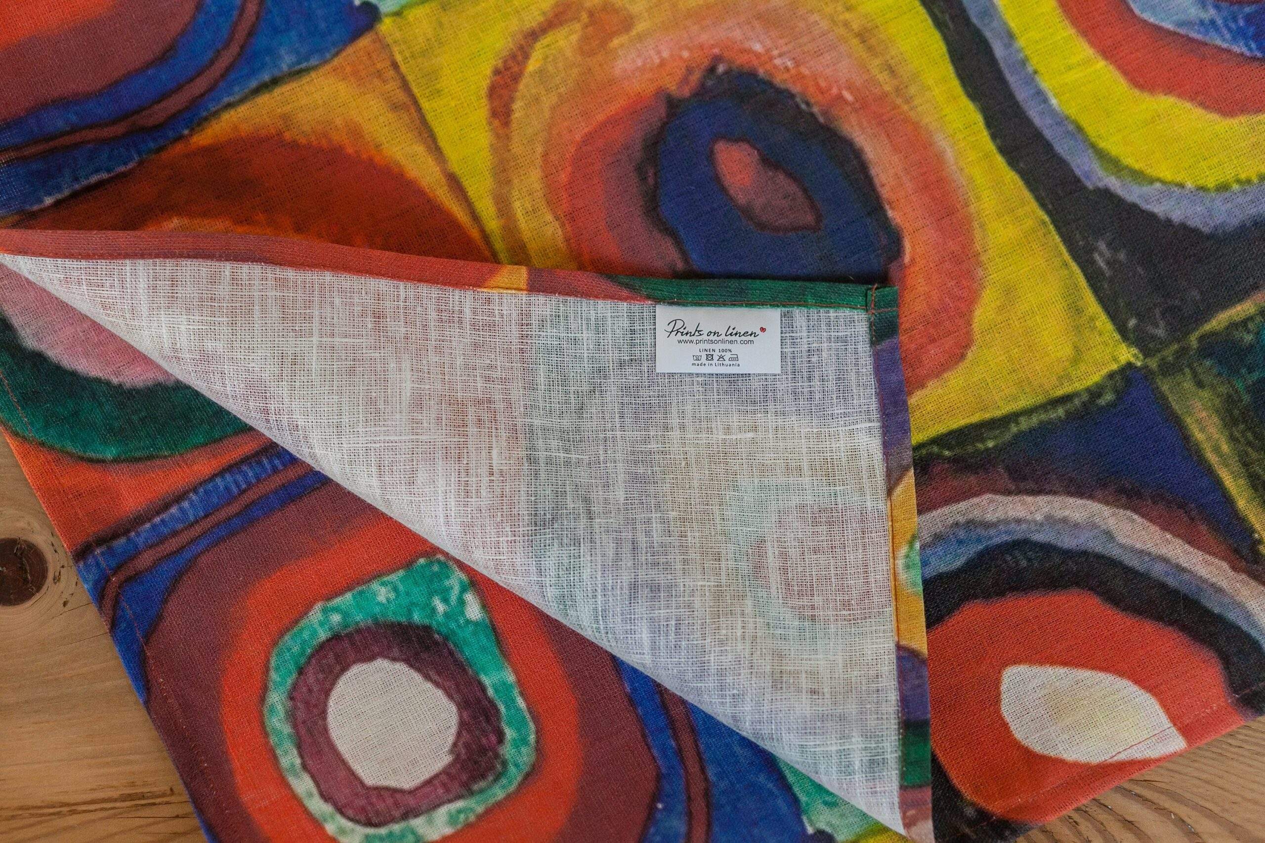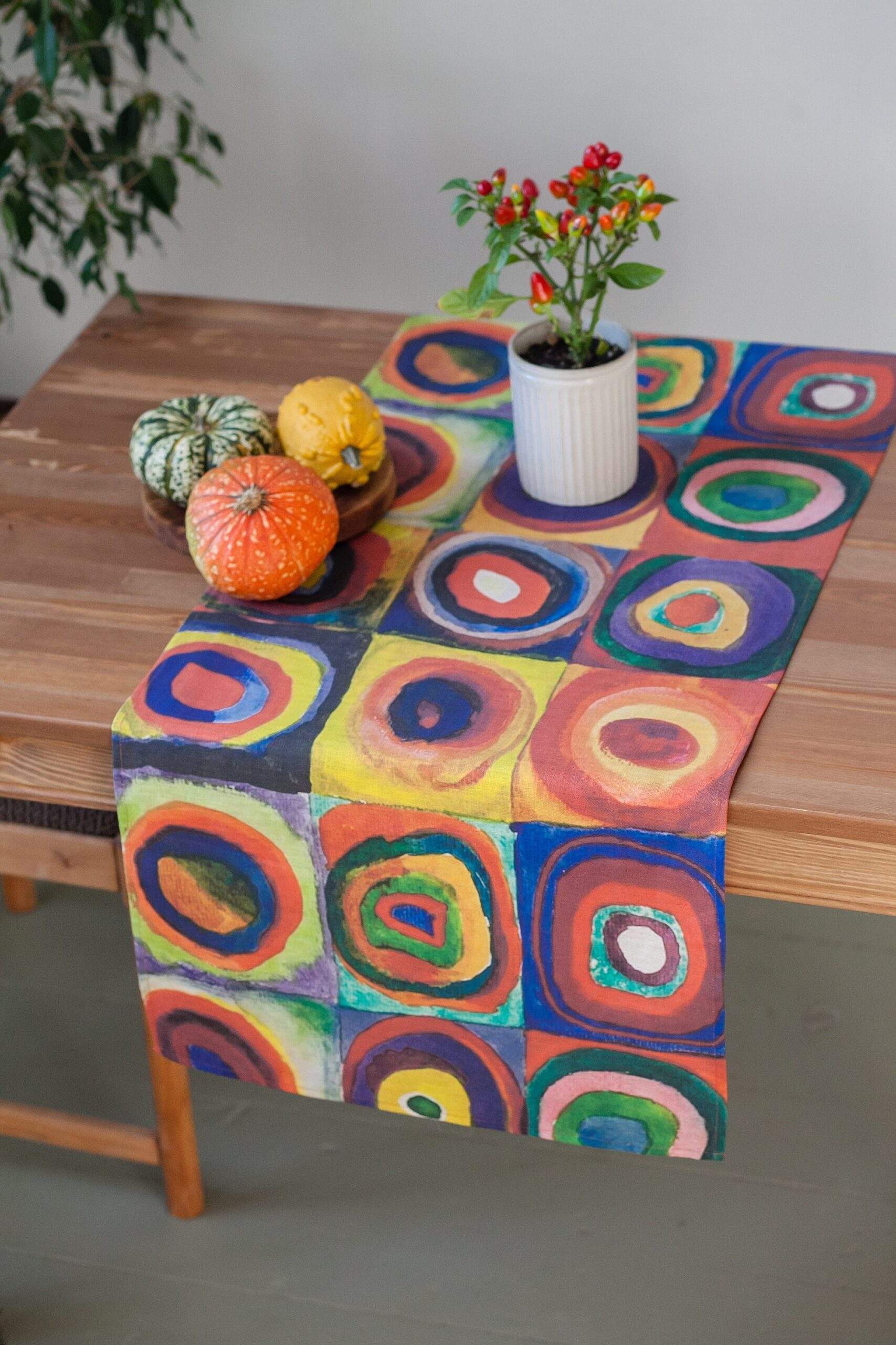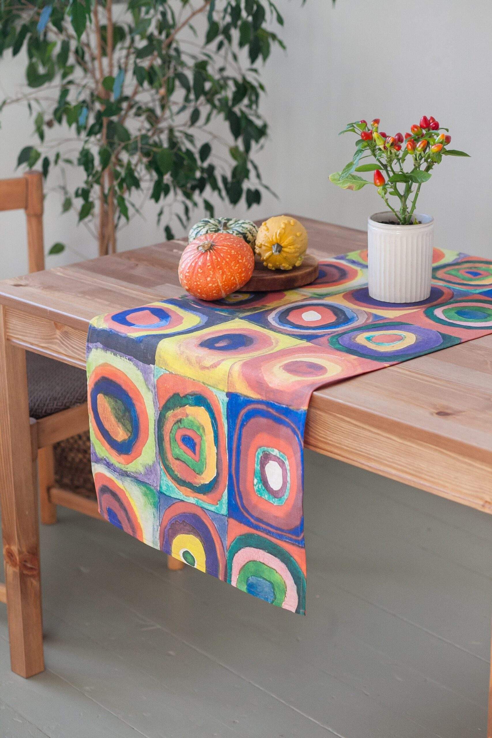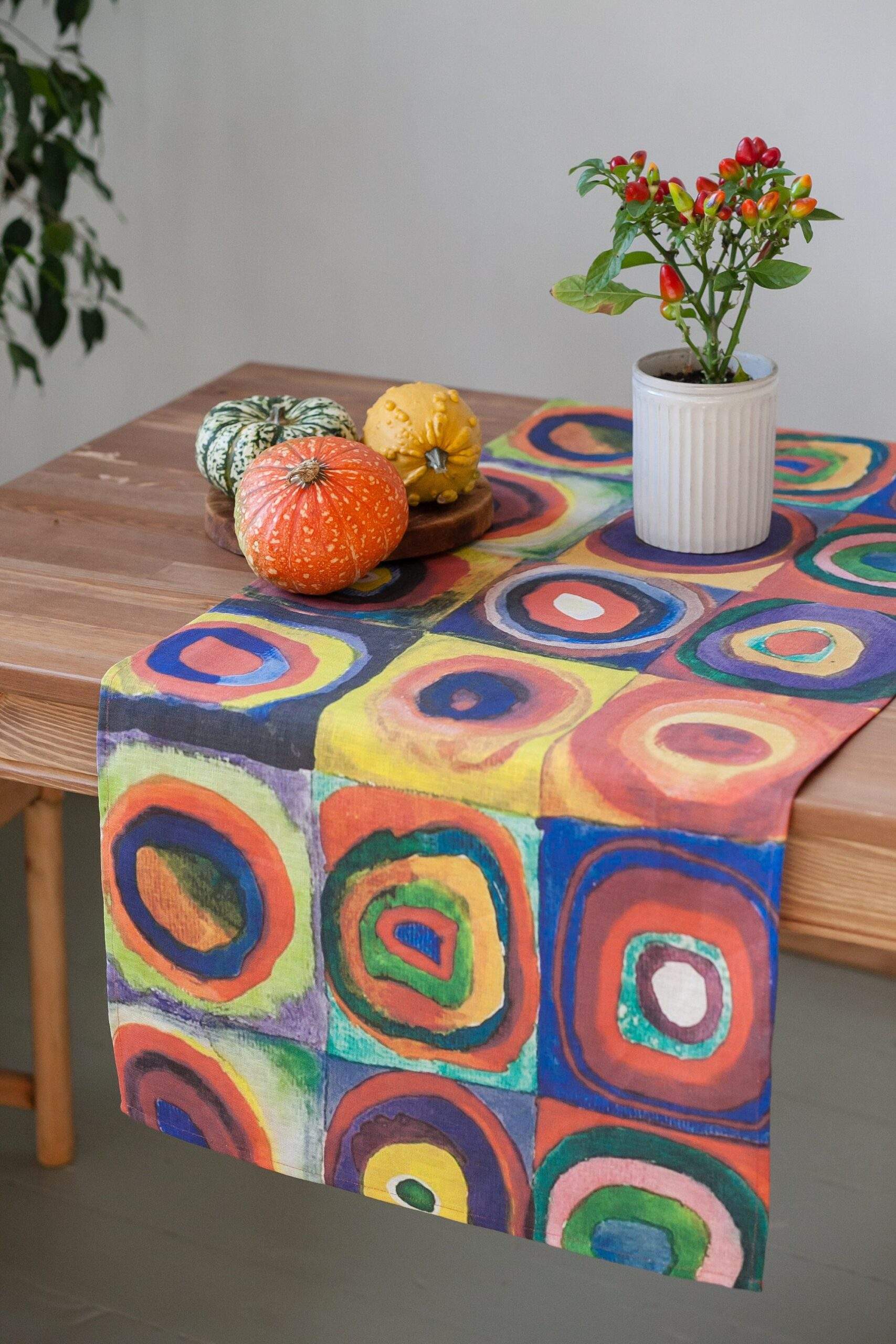 Linen table runner “Color Study: Squares with Concentric Circles” by Wassily Kandinsky. Abstract art collection. Squares with Concentric Circles perhaps, Kandinsky’s most recognizable work, is not actually a full-fledged picture. This drawing is a small study on how different colour combinations are perceived that the painter used in his creative process as a support material.