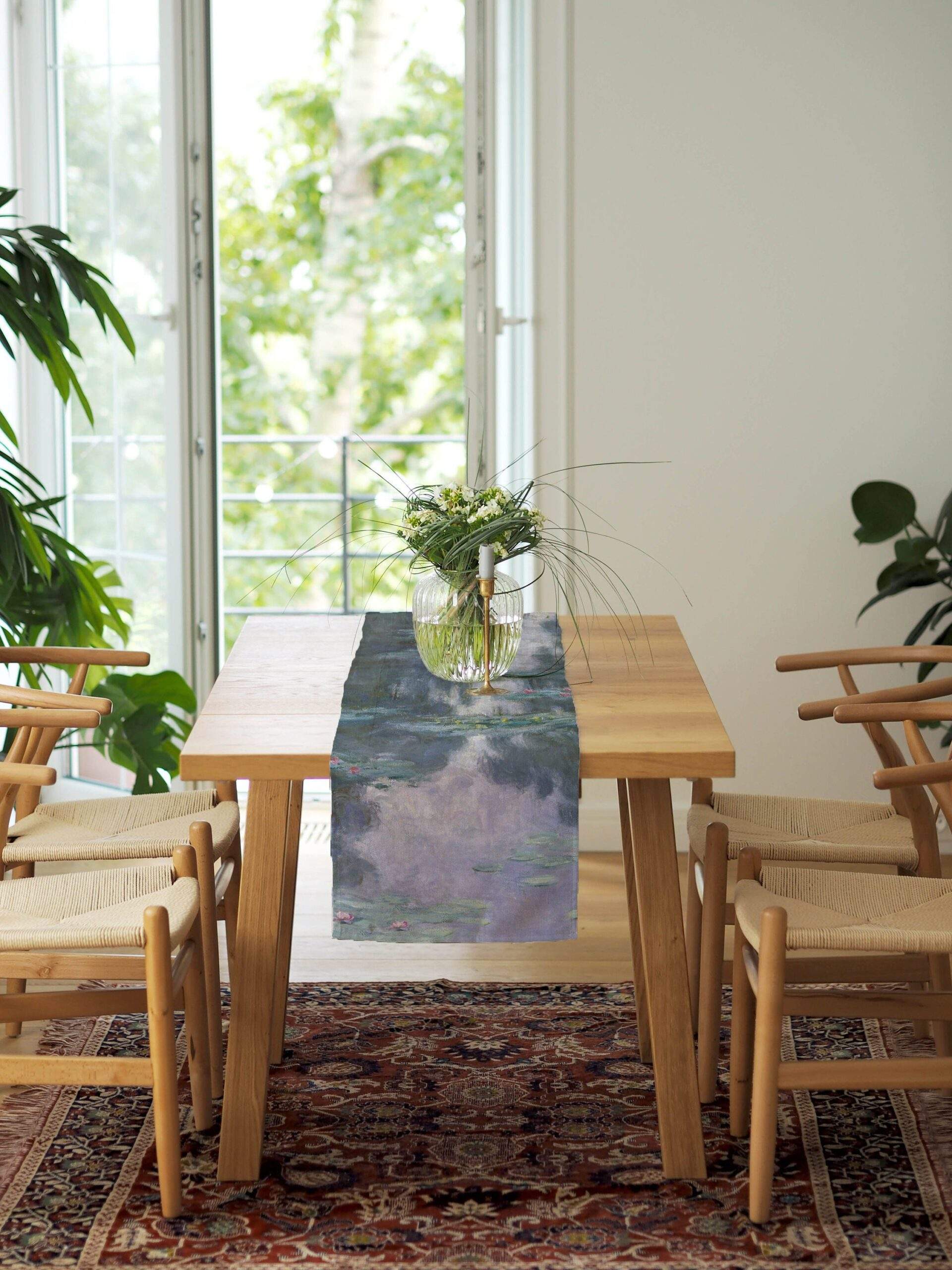 Linen table runner “Water Lilies” by Claude Monet. Water Lilies is a series of approximately 250 oil paintings by French Impressionist Claude Monet. The paintings depict his flower garden at his home in Giverny, and were the main focus of his artistic production during the last thirty years of his life.