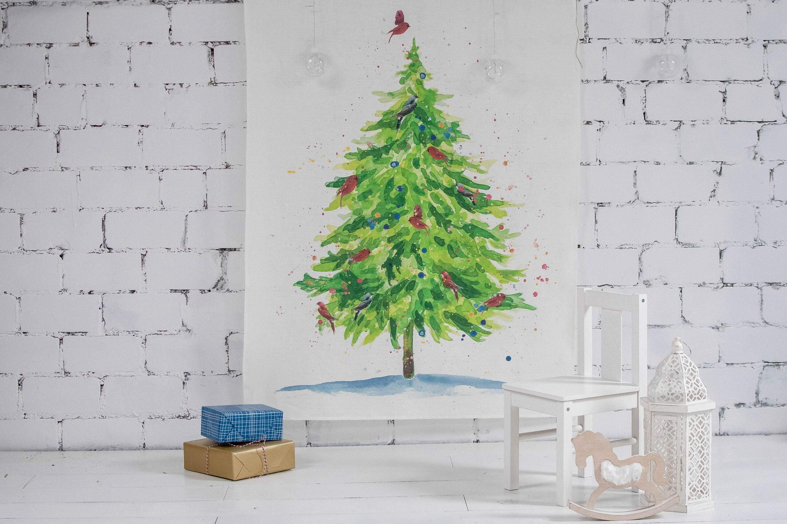 Fir Tapestry with red birds. Hand made in Lithuania, 100% organic linen fabric. Tapestry, tree decor, wall tapestry, wall hanging, boho decor, Christmas decor, hippie tapestry, holiday decor, Christmas tree, wall art.