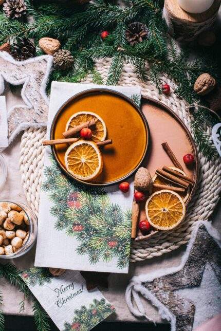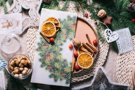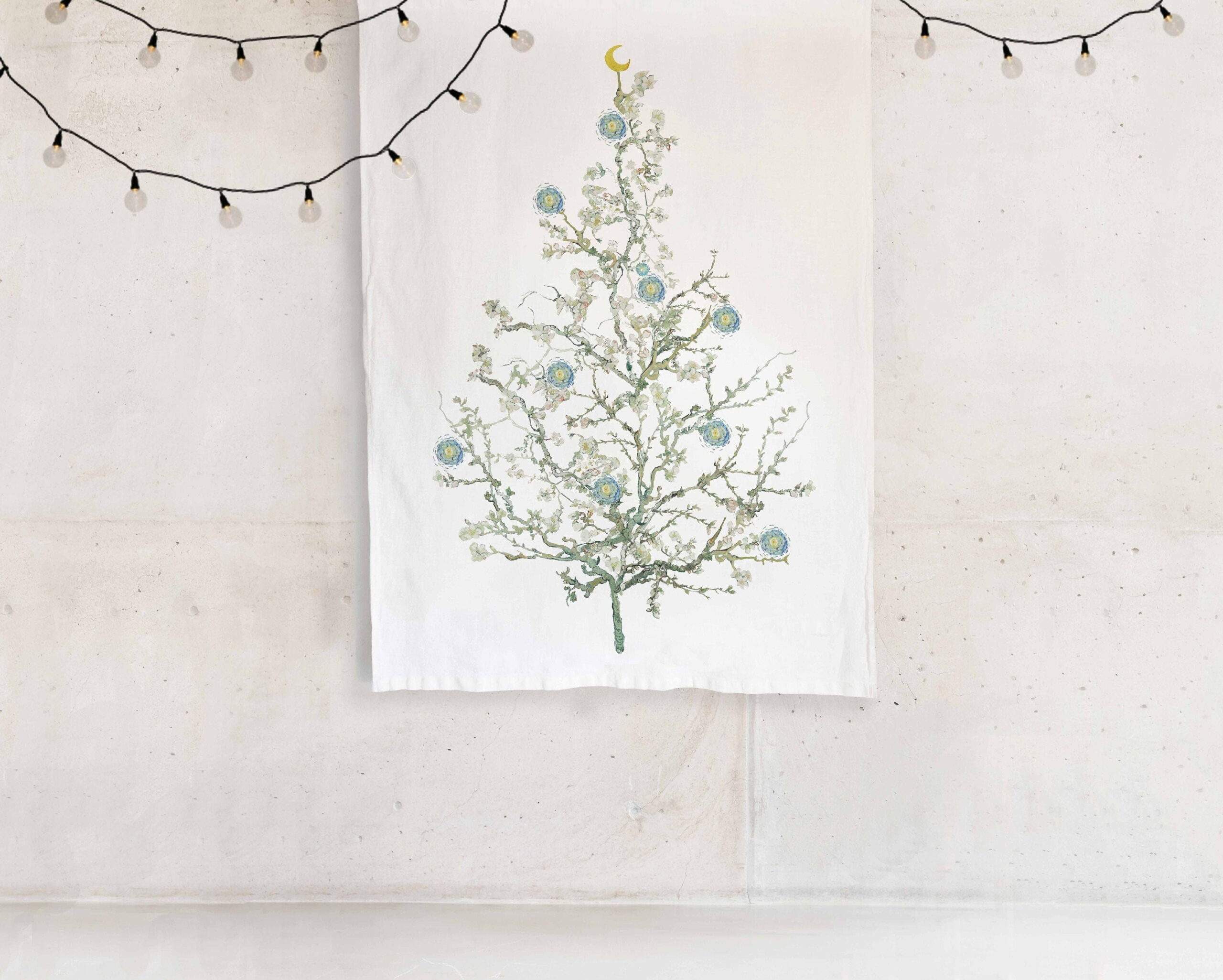 Wall tapestry “Christmas tree”, made by Vincent van Gogh Almond Blossom artwork motives. White linen background.
