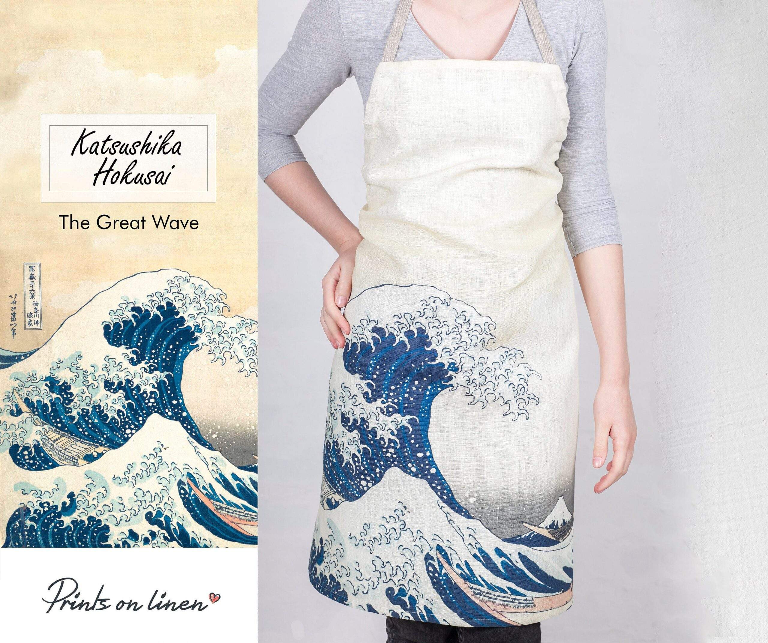 Linen Apron Katsushika Hokusai art print “The great wave”. 100% organic linen fabric. Free size linen apron. Cross back apron. Nice gift idea for women or men, baking gift, housewarming gift.