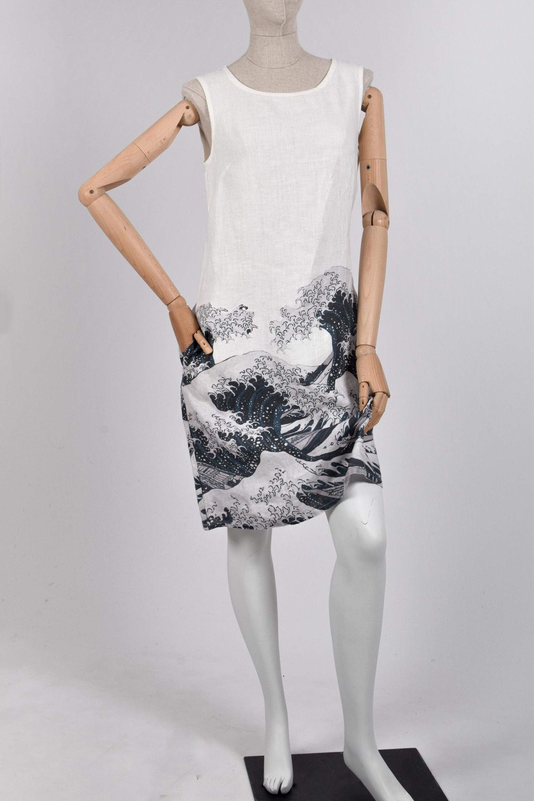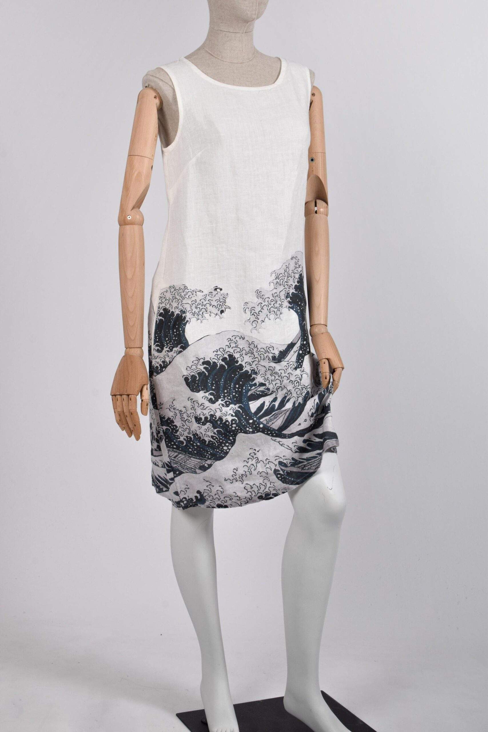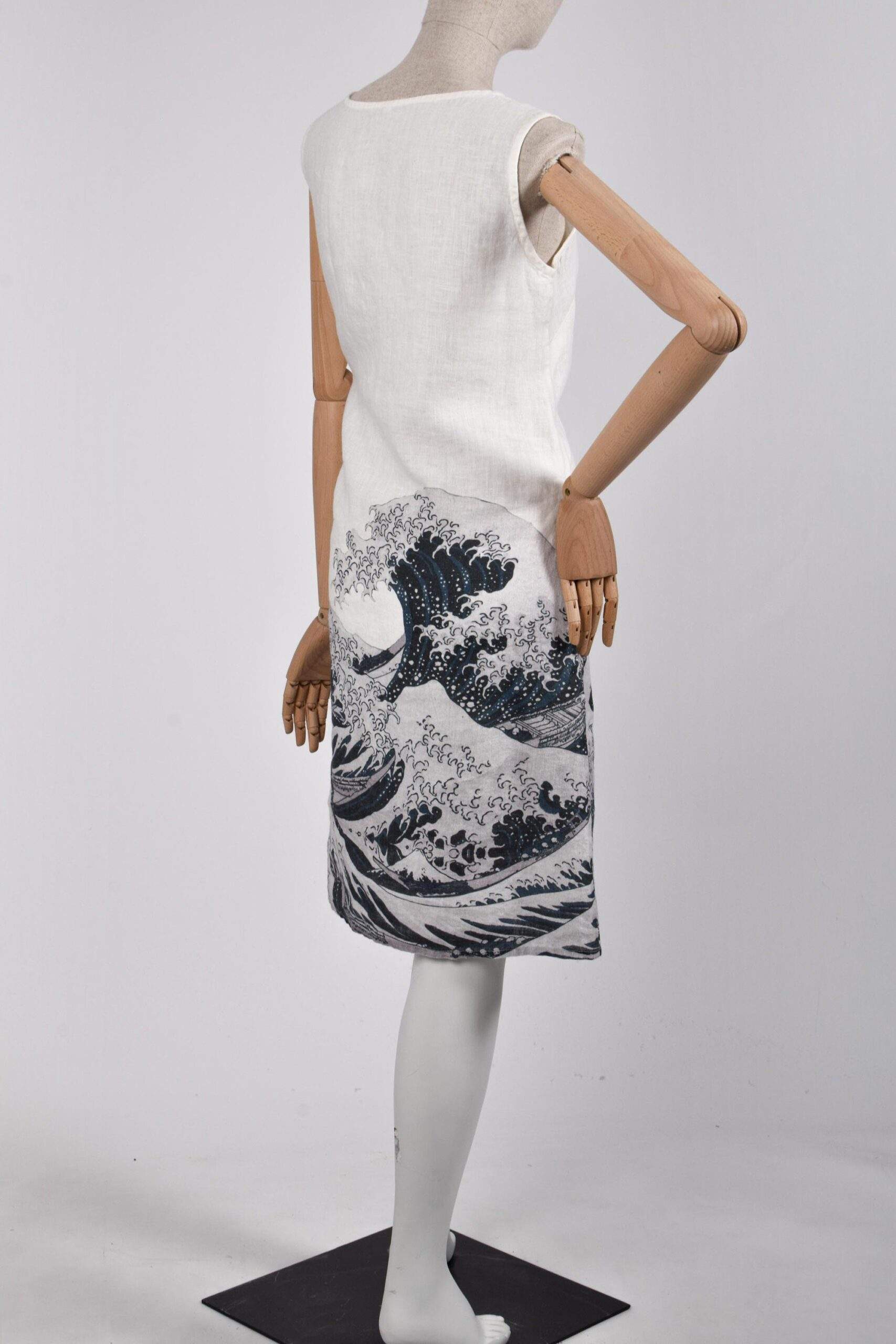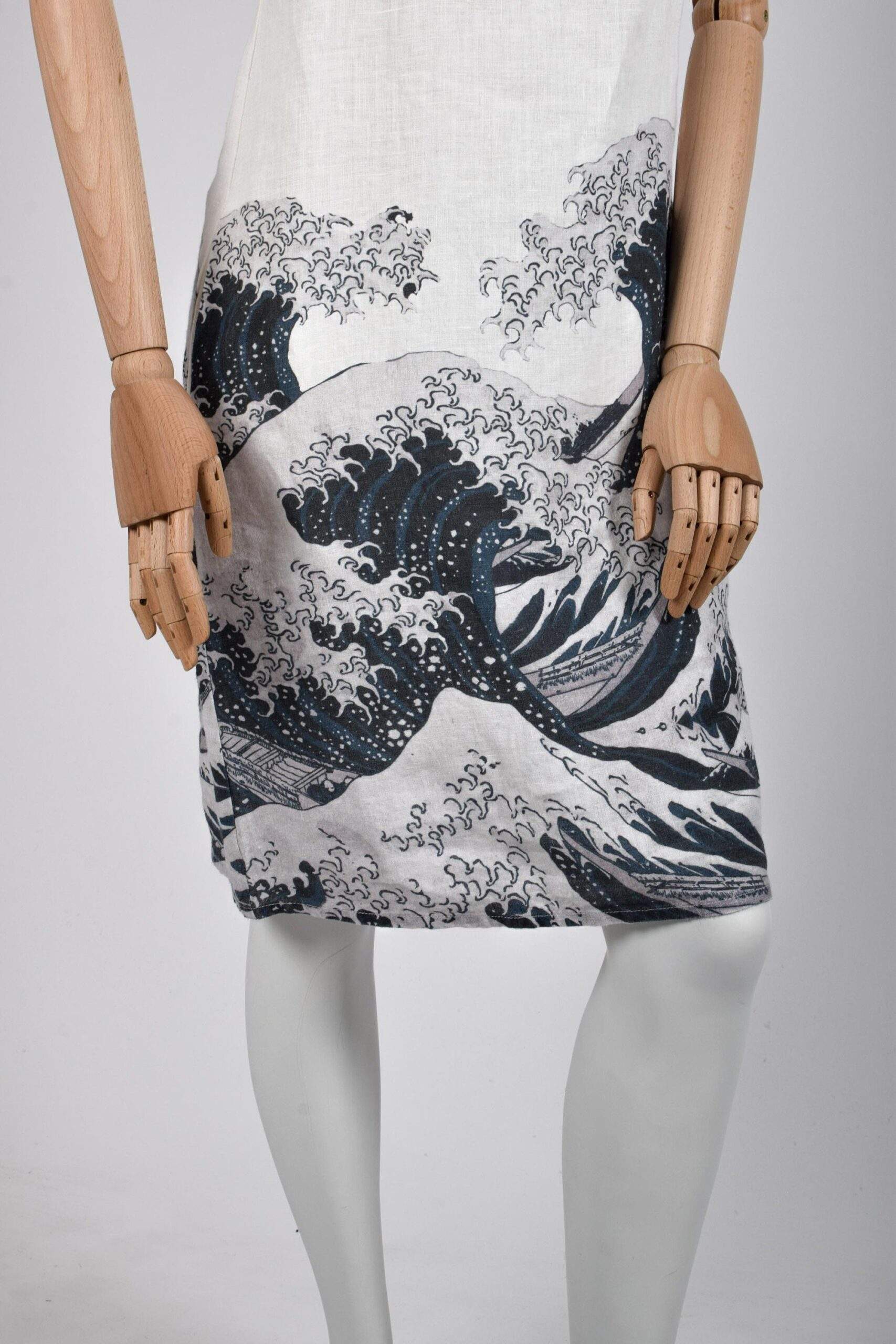 Linen women dress inspired Katsushika Hokusai artwotk “The Great Wave”. Pure linen fabric.