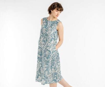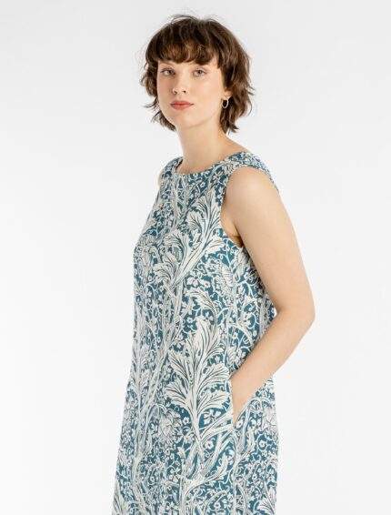 Pattern are on both dress sides, sleeveless dress with pockets.