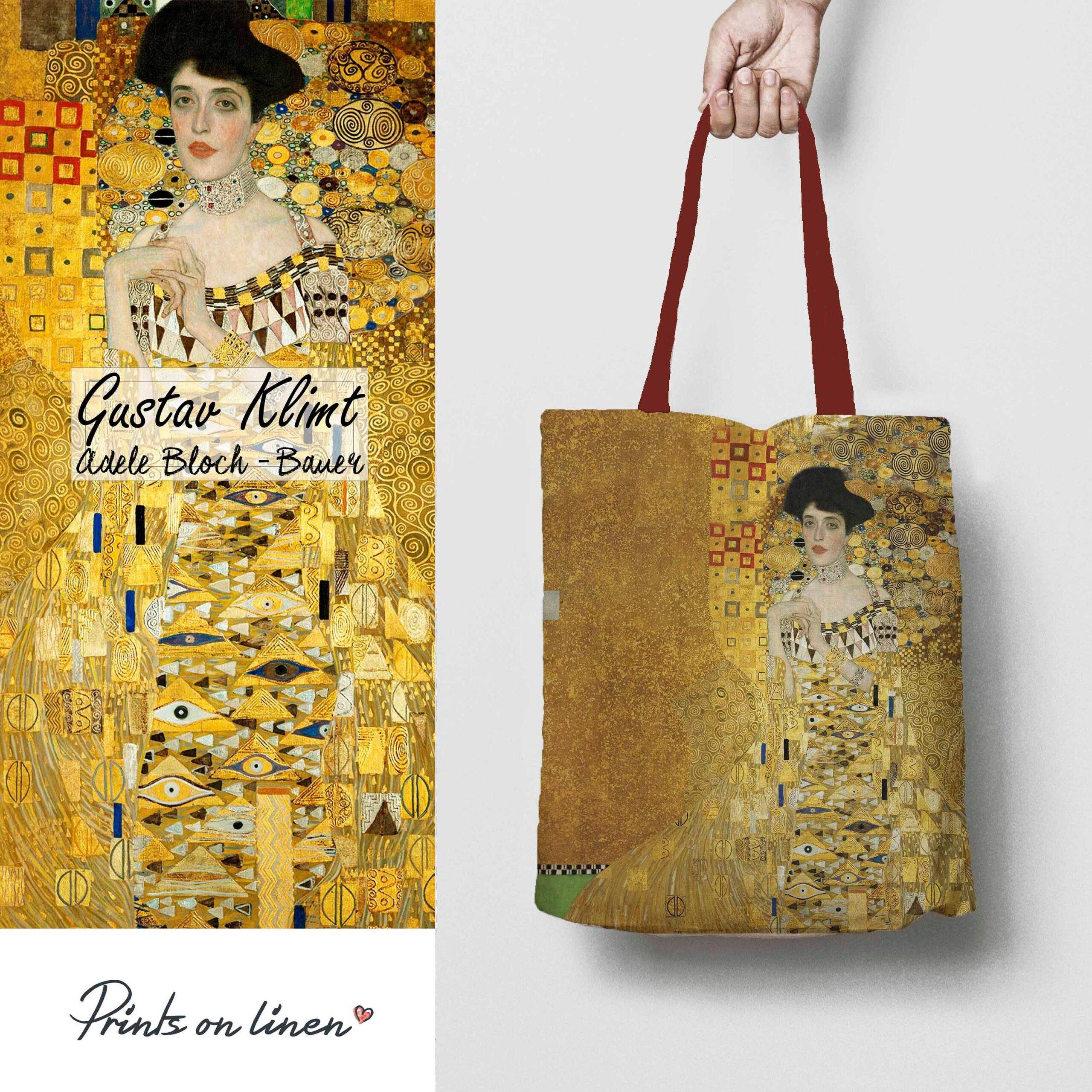 Tote bag by Gustav Klimt “Adele Bloch-Bauer”, made of 100% linen fabric. Artistic Design and Classic Print on this Vintage style bags.