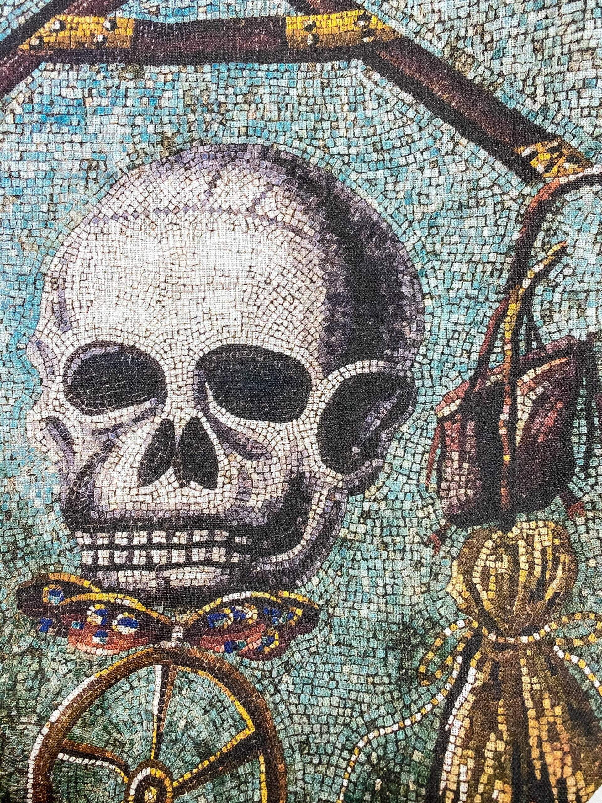 Memonto Mori mosaic from Pompeii. The mosaic represents an allegorical and symbolic philosophical theme of the transience of life and death that eliminates disparities in social class and wealth. … The servant is thought to have conveyed this with the warning “Memento mori” that means “Remember that you will die”.