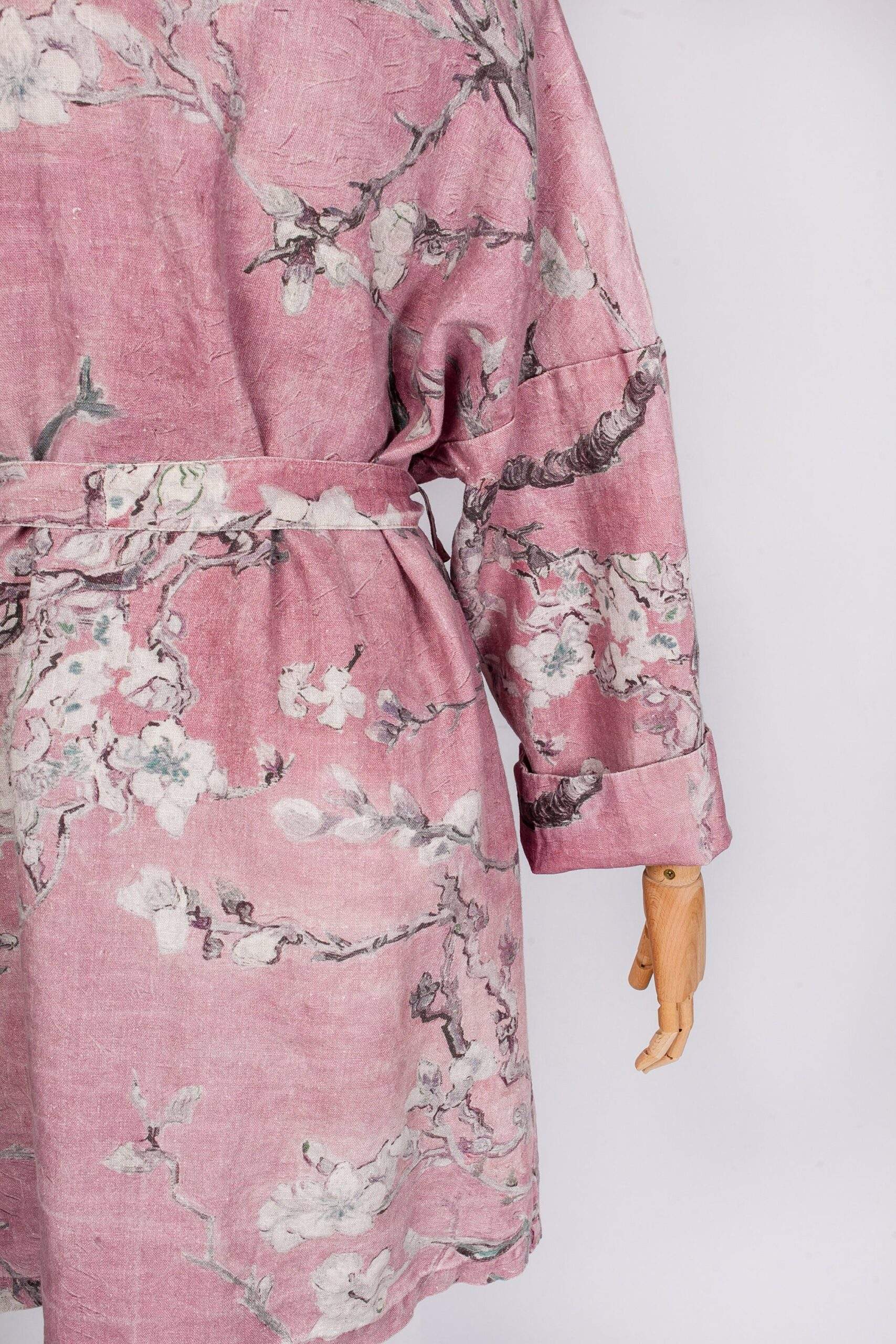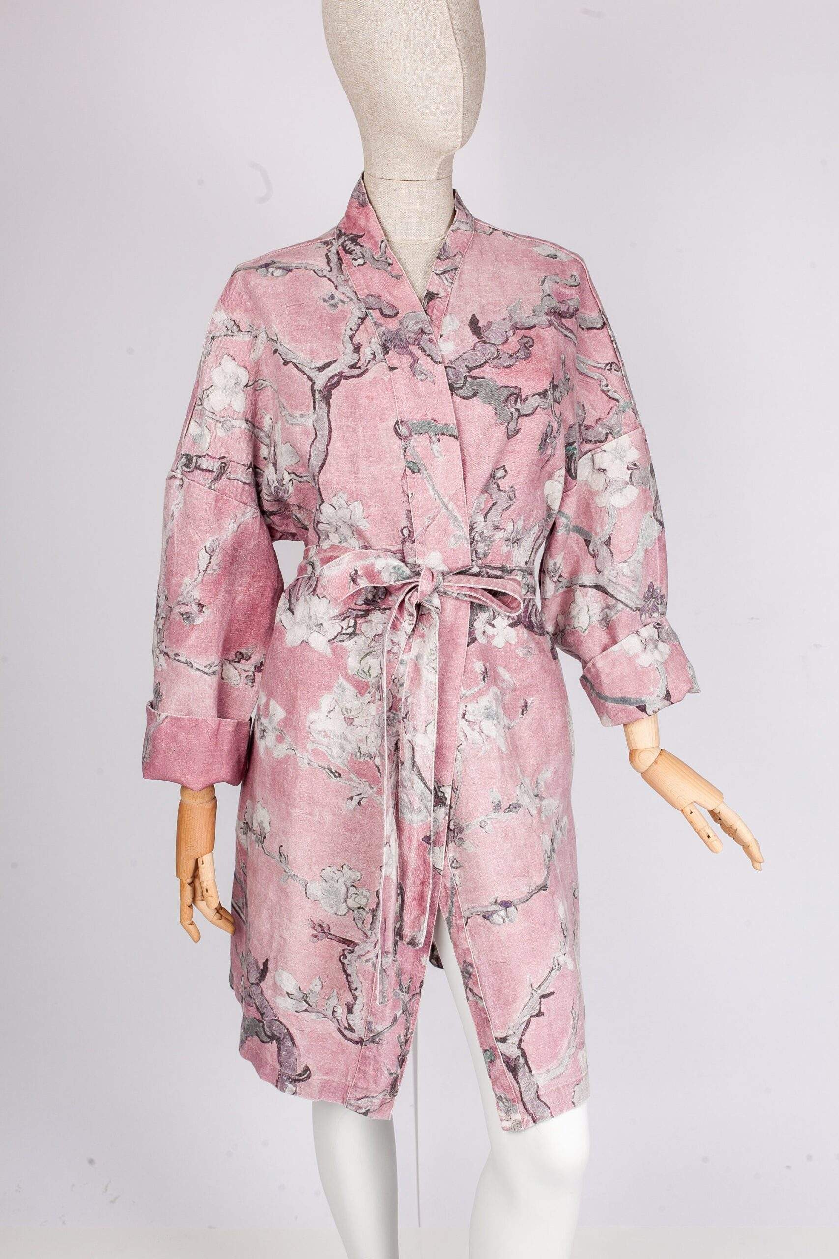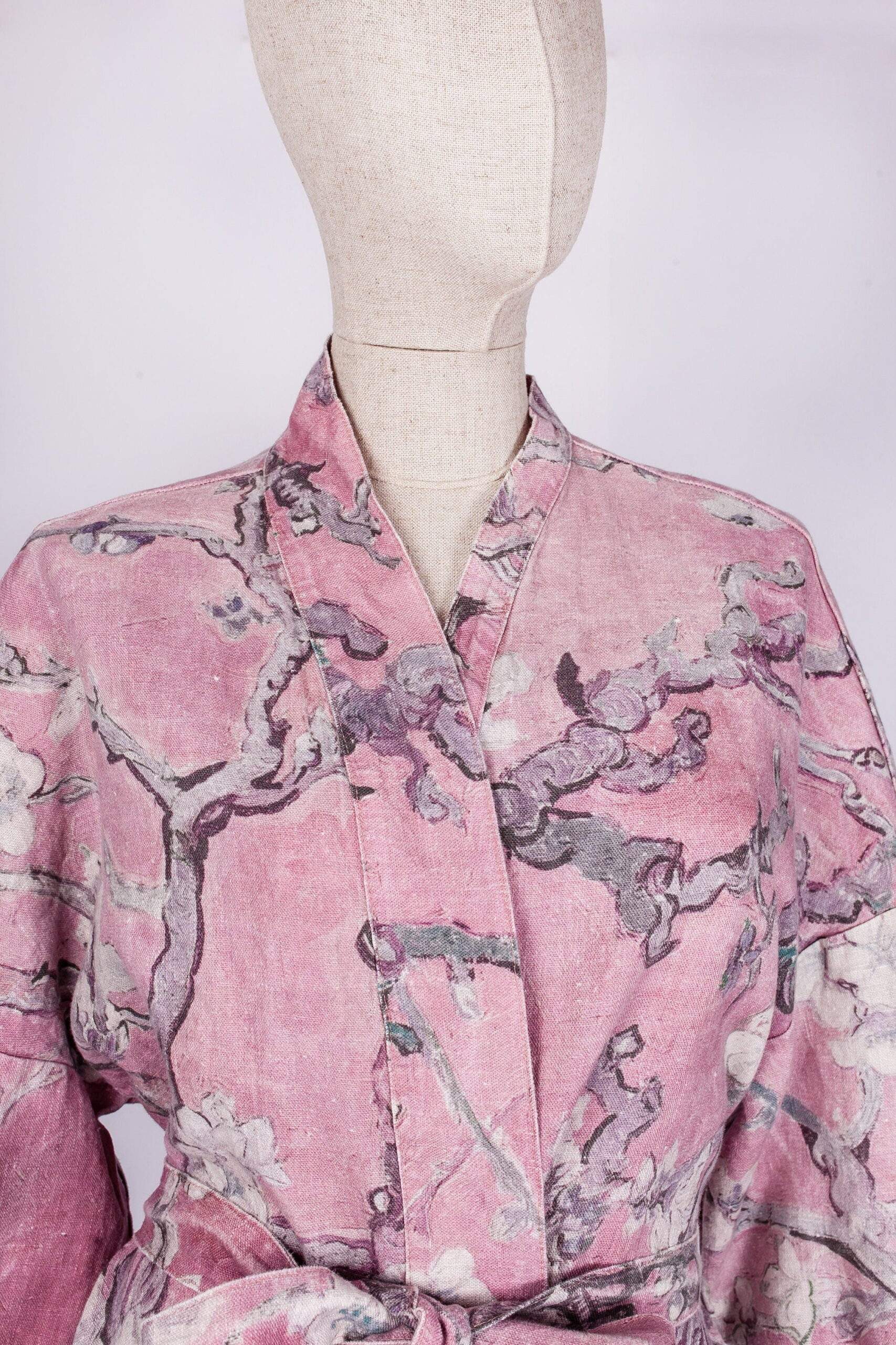 Women linen bathrobe Vincent Van Gogh “Almond blossom” with asymmetric collar. Blush pink color edition.