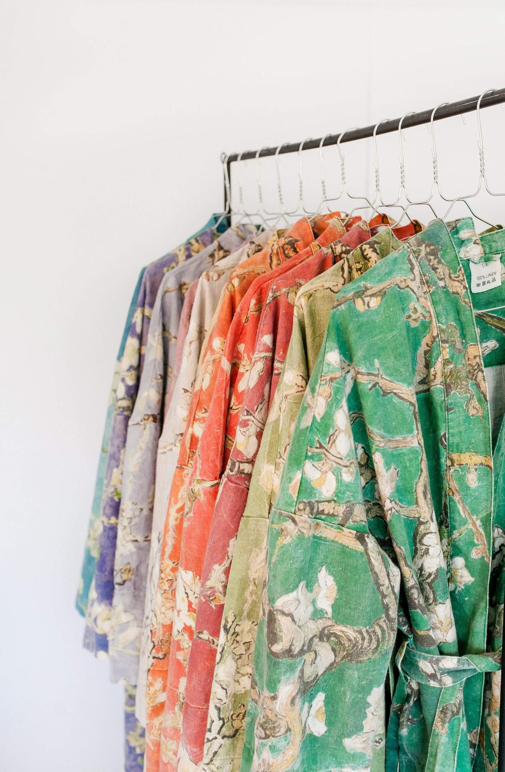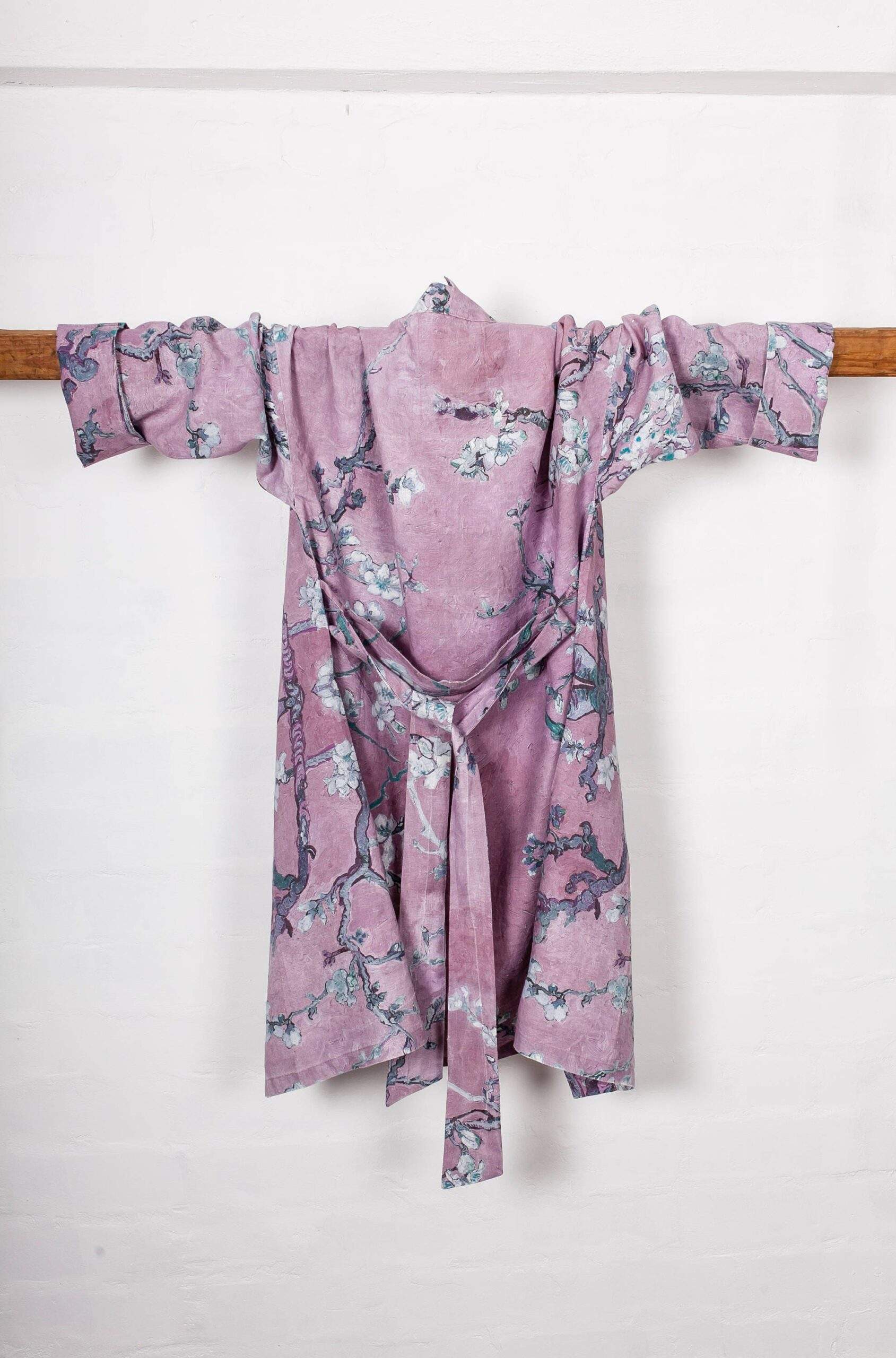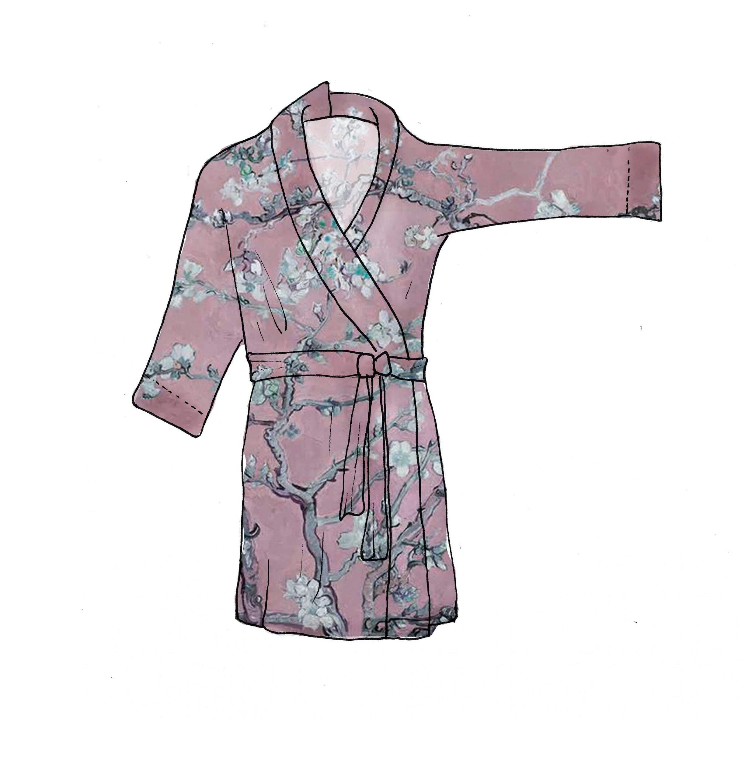 Women linen bathrobe Vincent Van Gogh “Almond blossom” with asymmetric collar. Blush pink color edition.