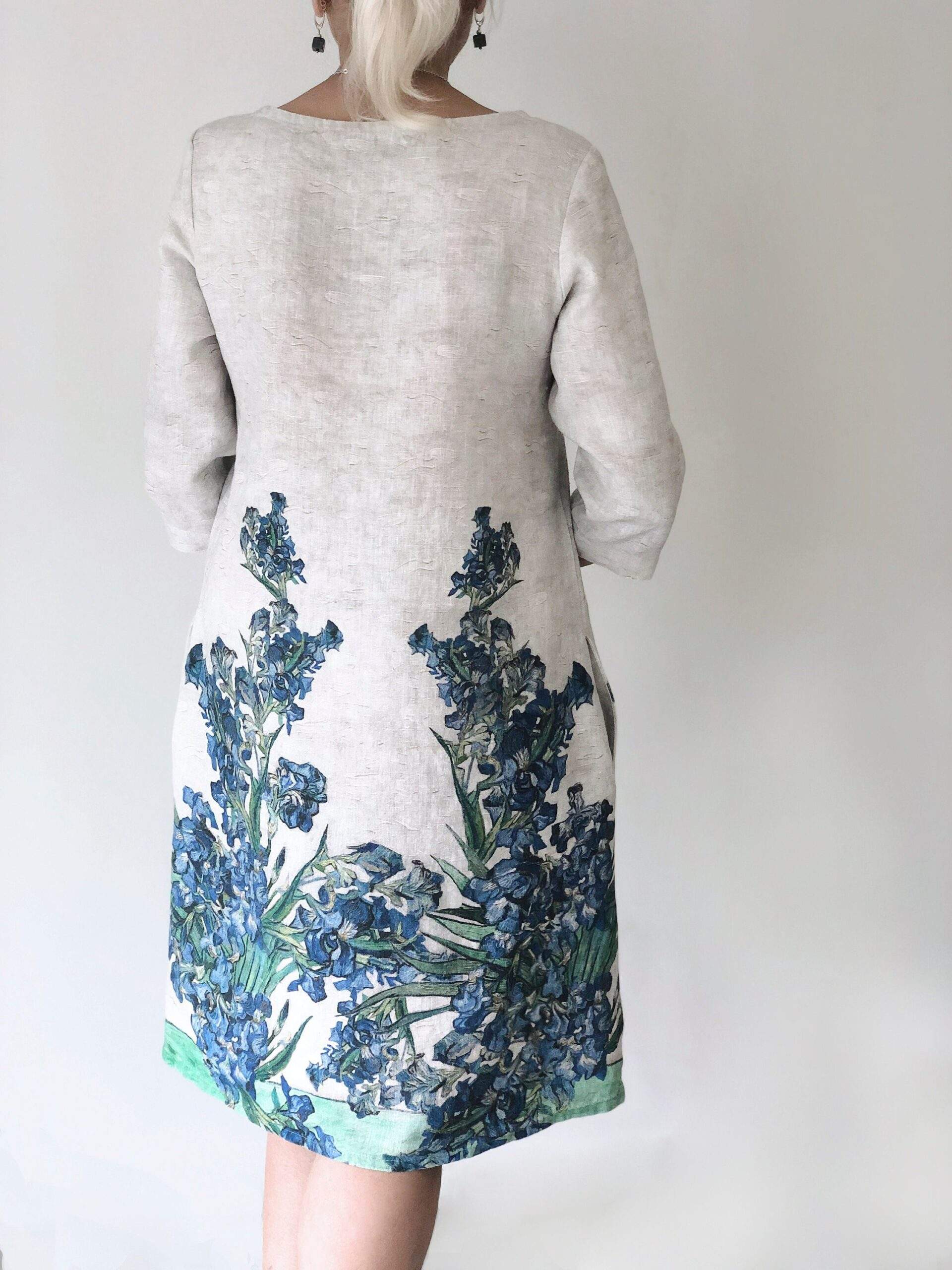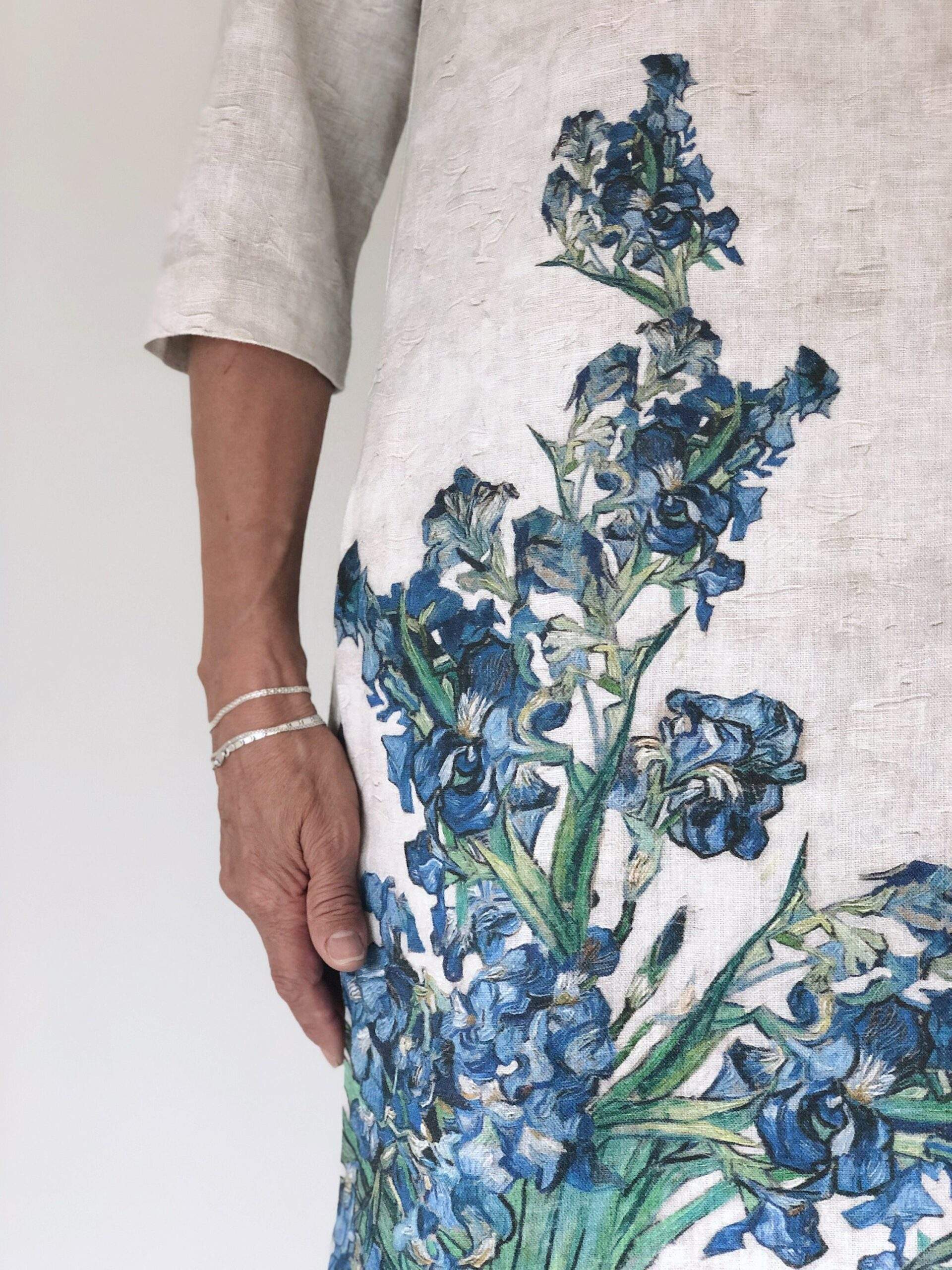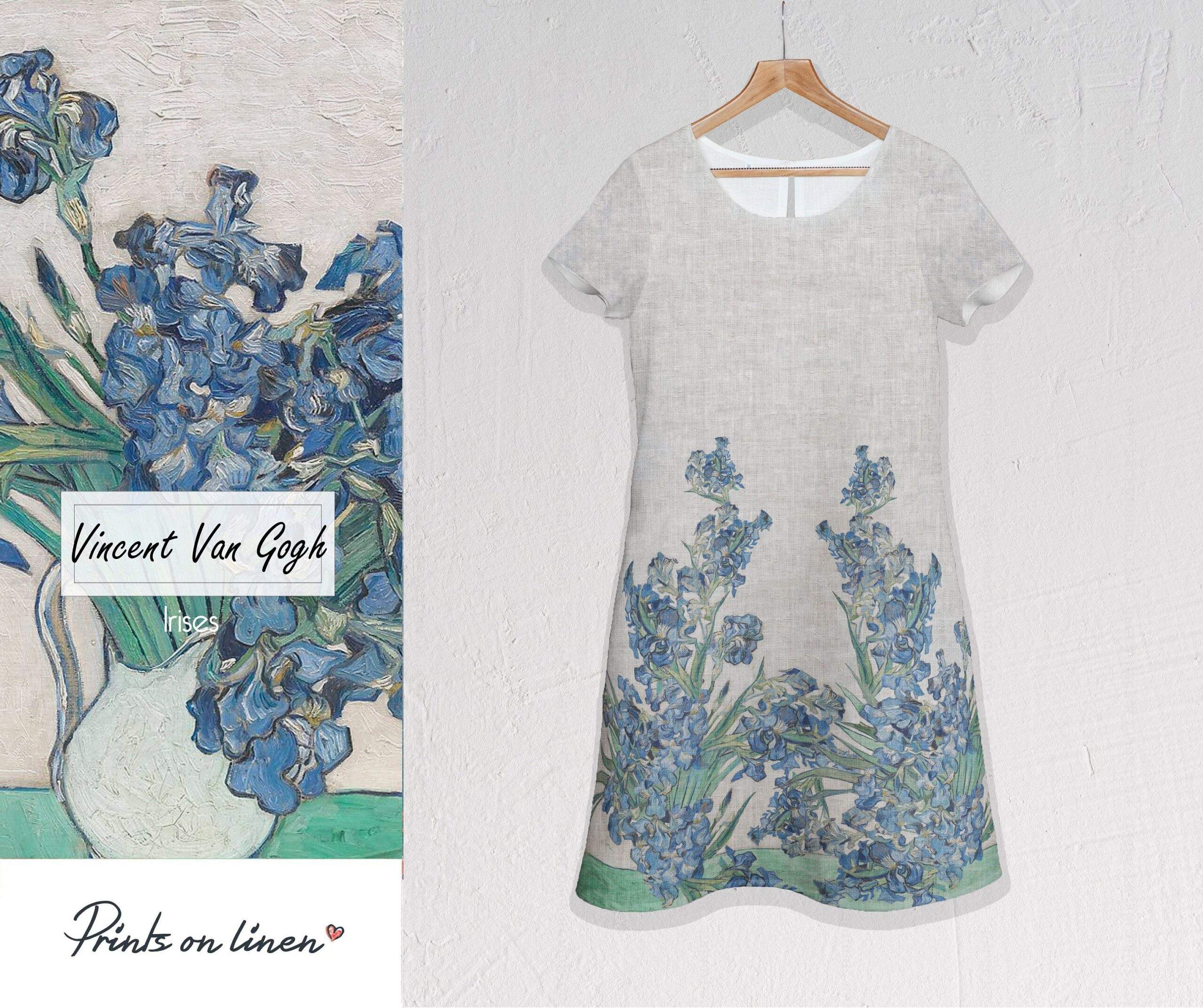 Feminine linen dress of Vase with Irises by Vincent Van Gogh. It is believed that irises combine two separate worlds of divine and earth, and brings blessed peace to anyone. The kingdom of divine and earth connect heavenly white and blue colours and everyday life elements which are vase and table. Feminine linen dress of Vase with Irish by Vincent Van Gogh is of standard and plus size has brought a new life to the canvas. This dress would be a perfect choice for those women who never get tired from seeking peace.
