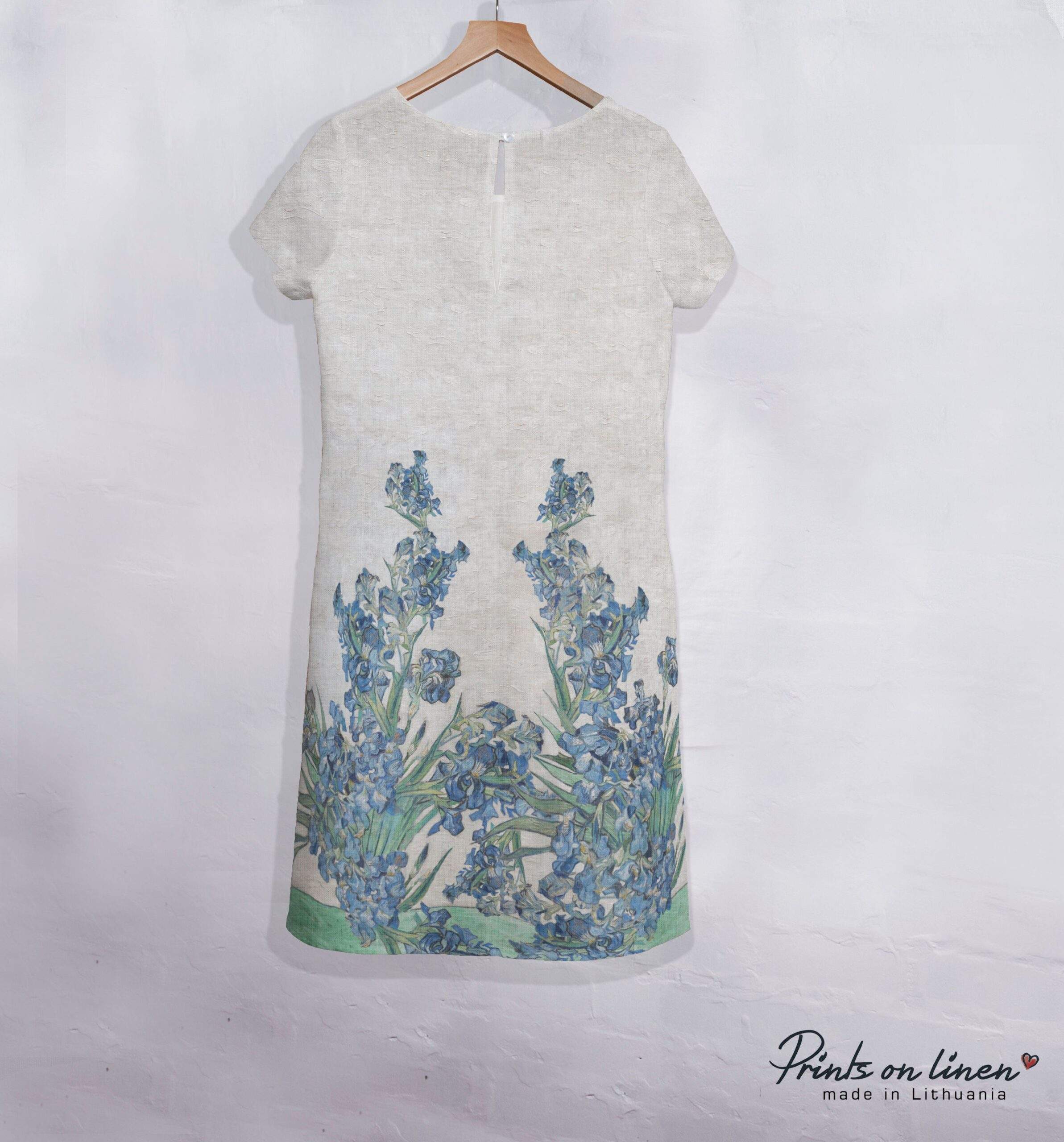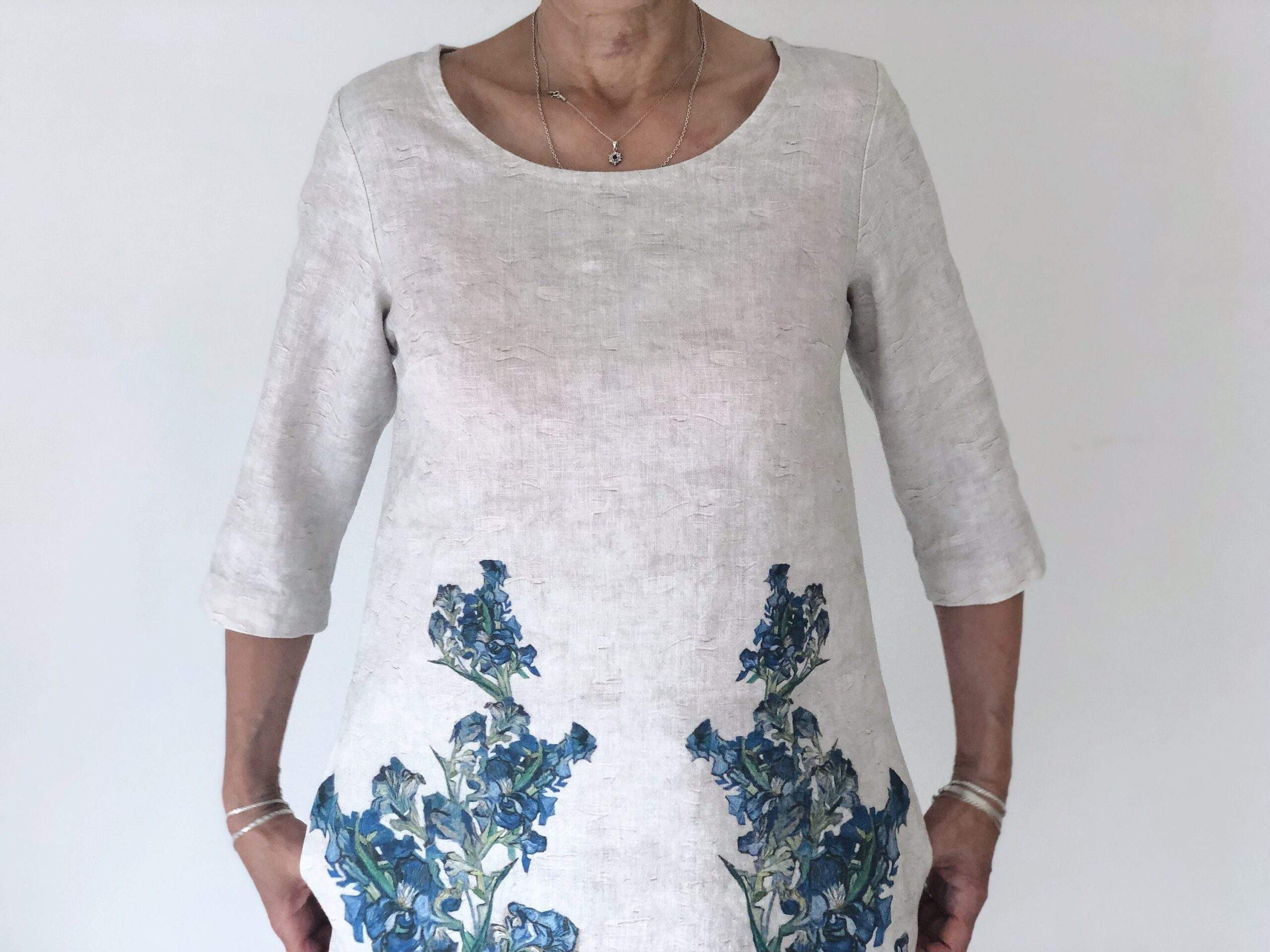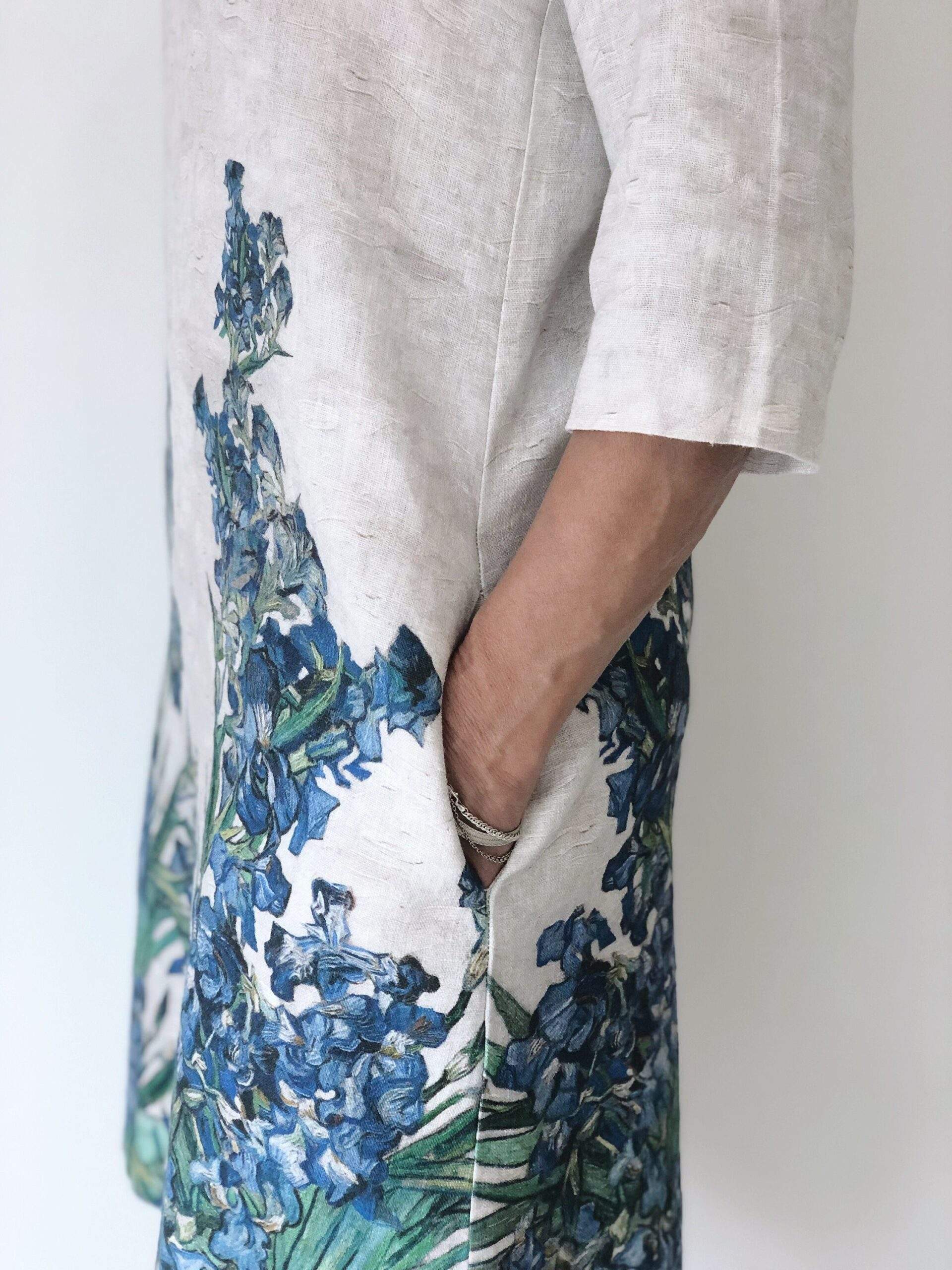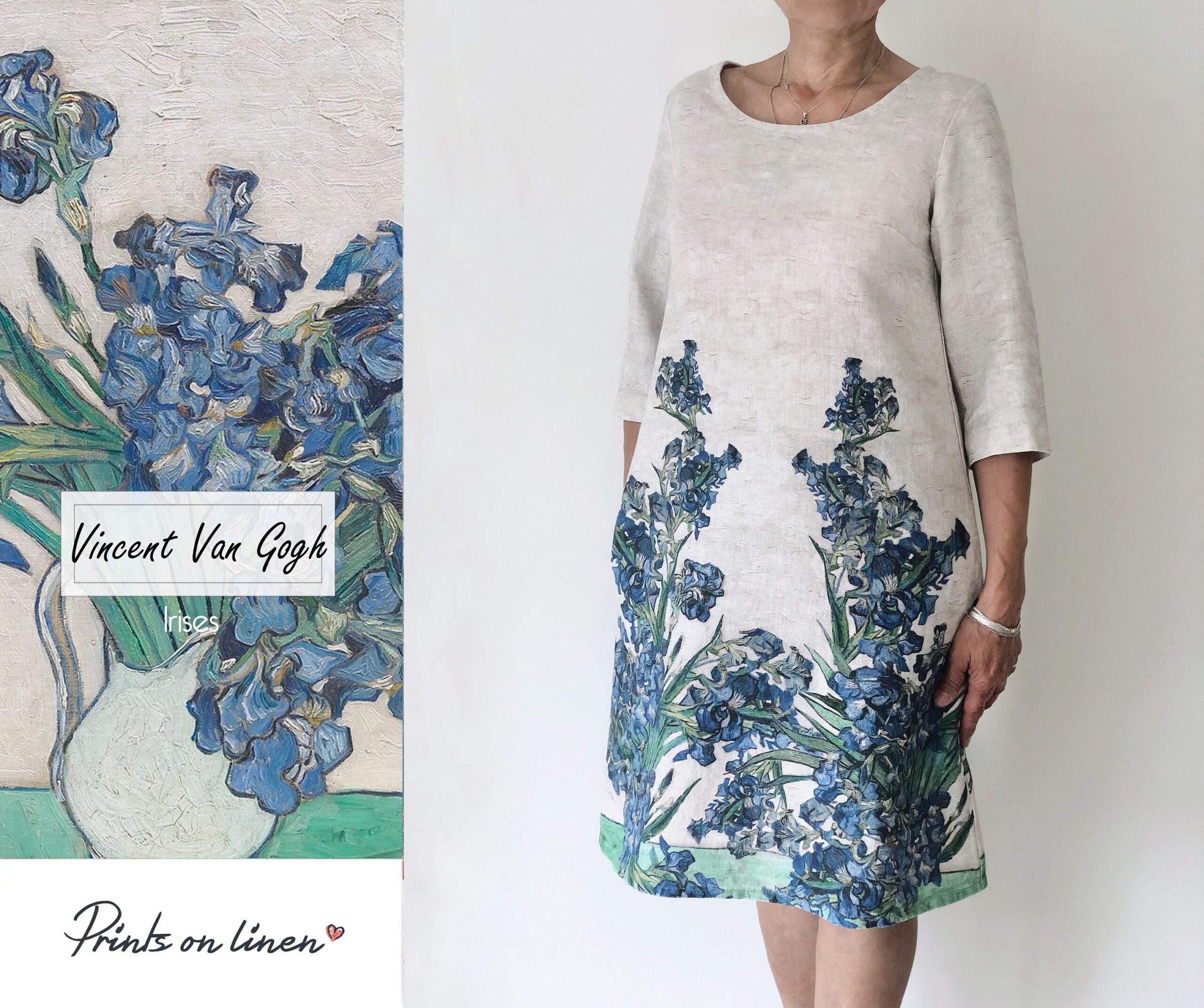 Feminine linen dress of Vase with Irises by Vincent Van Gogh. It is believed that irises combine two separate worlds of divine and earth, and brings blessed peace to anyone. The kingdom of divine and earth connect heavenly white and blue colours and everyday life elements which are vase and table. Feminine linen dress of Vase with Irish by Vincent Van Gogh is of standard and plus size has brought a new life to the canvas. This dress would be a perfect choice for those women who never get tired from seeking peace.
