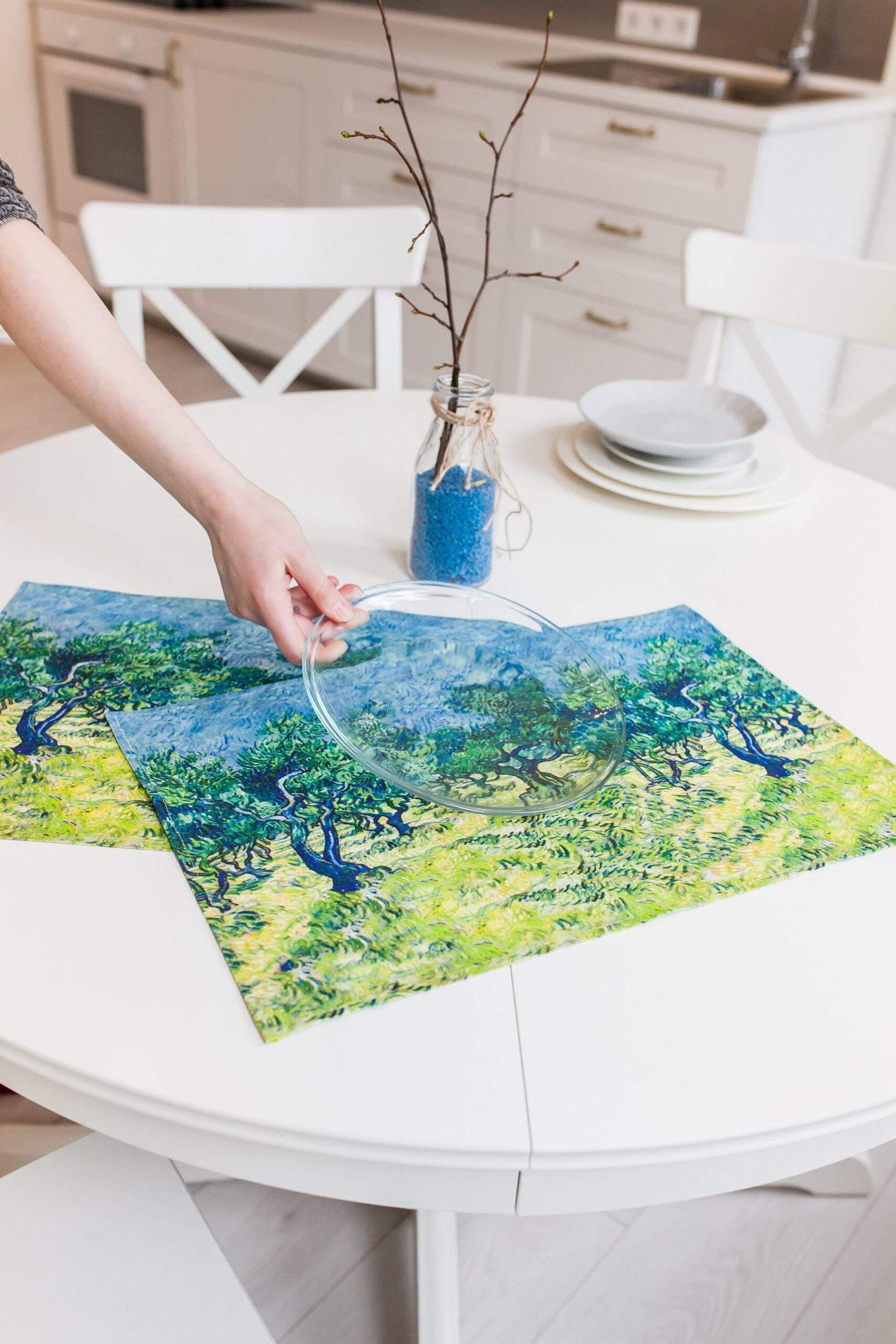 Van Gogh “Olive Trees” artwork print, linen placemats set. Housewarming gift, farmhouse decor, easter table decor, wholesale prices. Linen placemats set (4 or 6 placemat set) with Vincent van Gogh art, printed on natural white linen fabric.