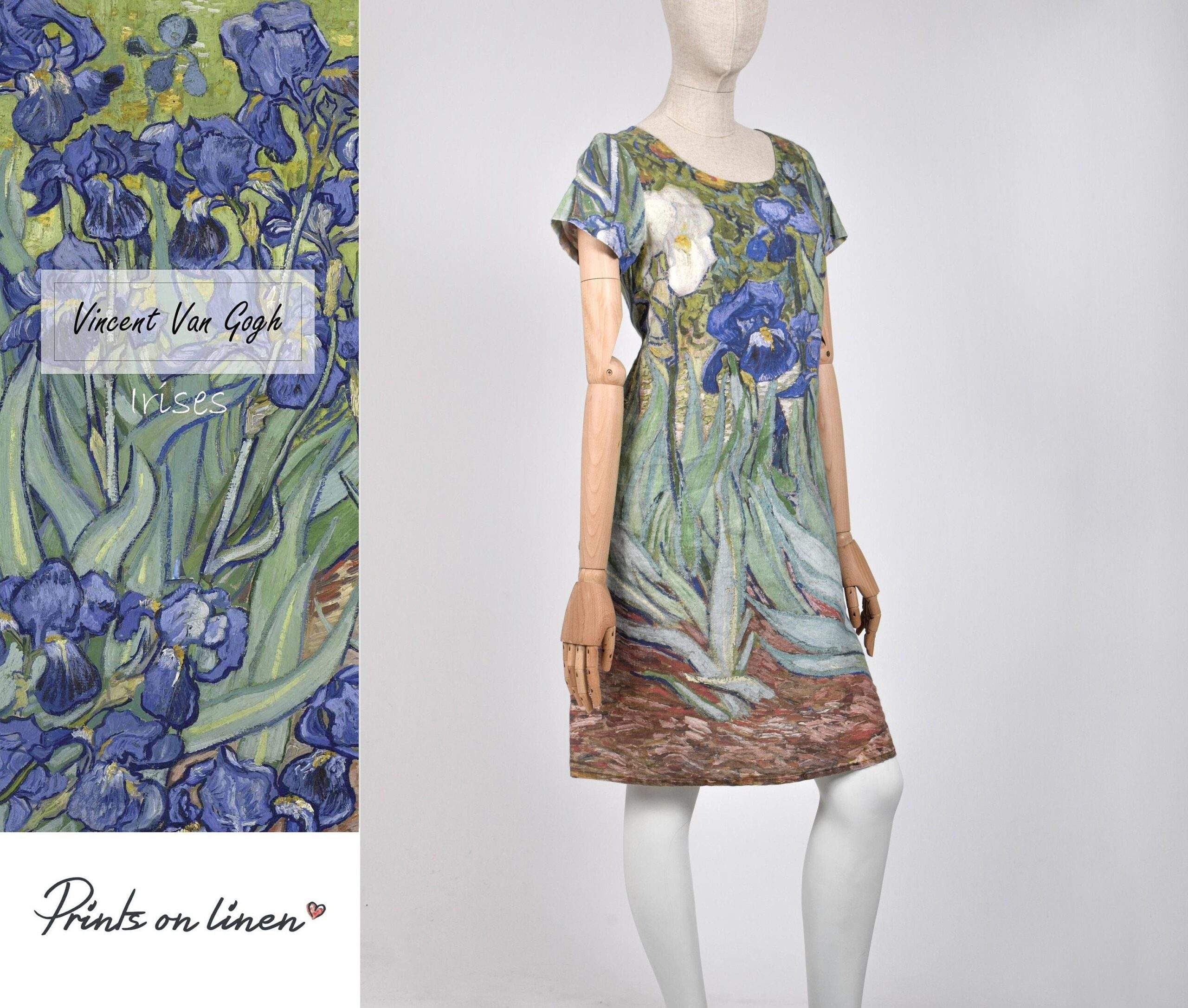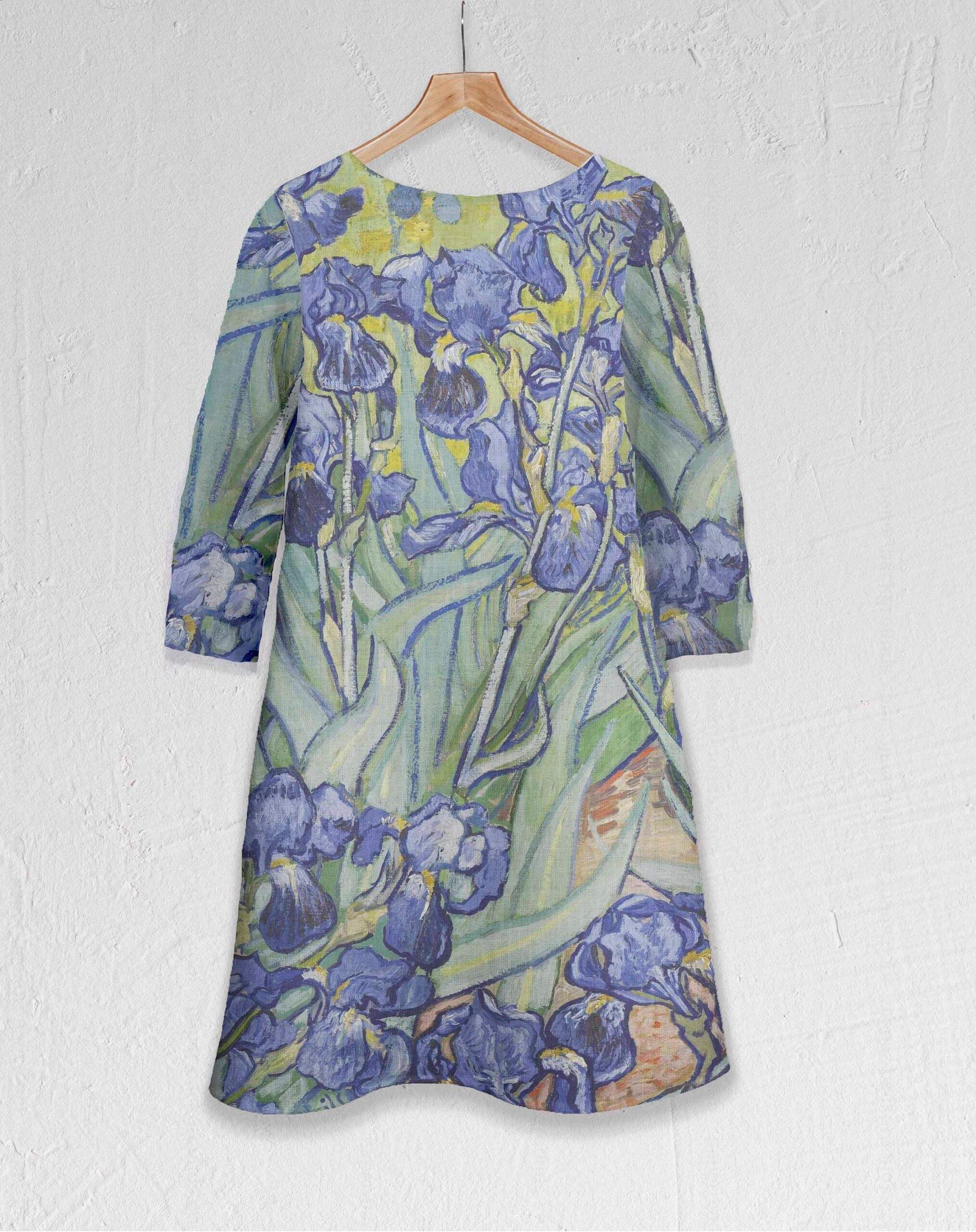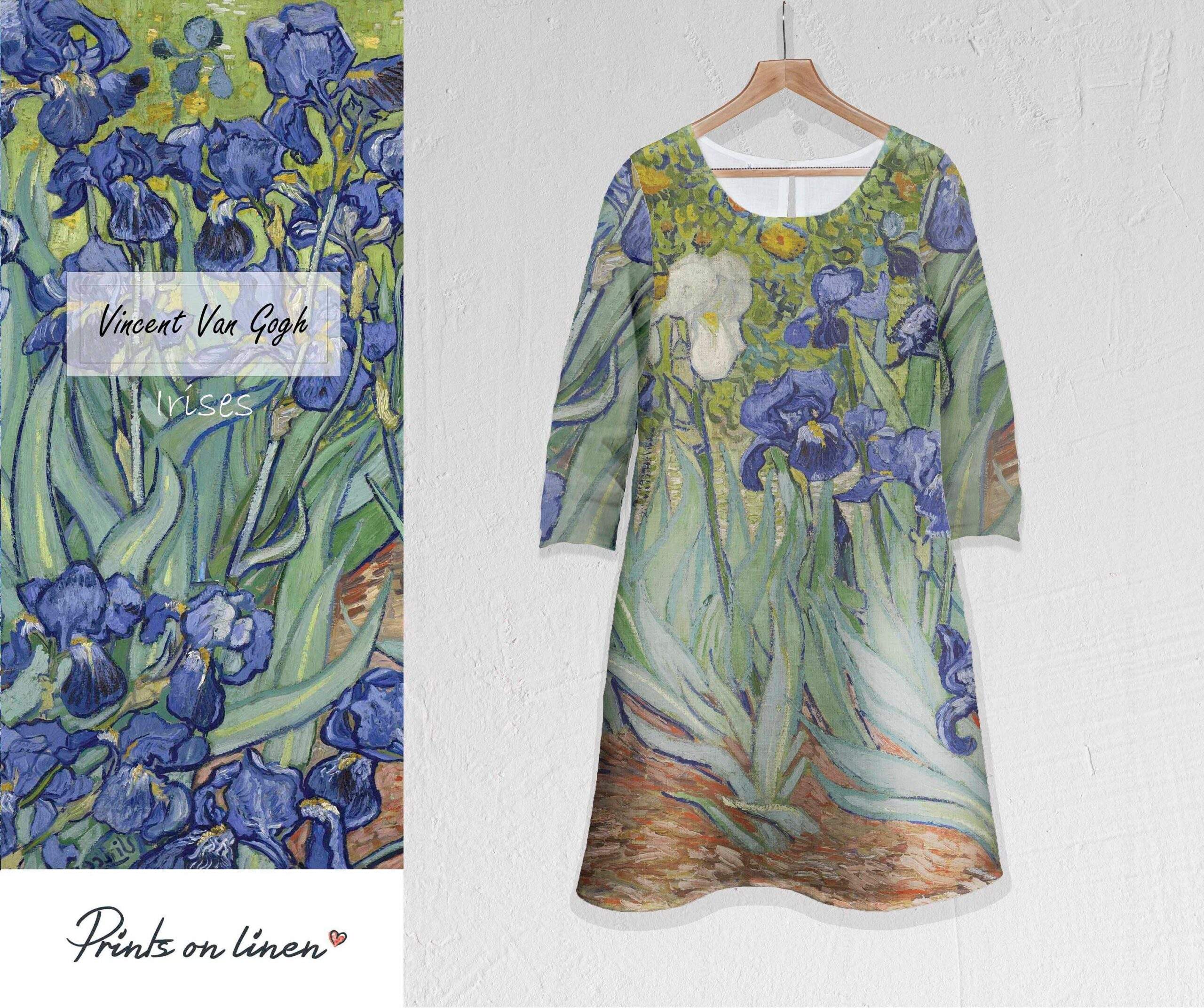 Women linen dress of Vincent Van Gogh Irises. Sometimes less means more. Sometimes the longest trips start with the shortest roads. The painting by Vincent van Gogh of Irises was highly valued as it helps to create the impression of fresh air and real life. Irises linen dress can be of standard size and plus size. It is the sip of fresh air and joy in your everyday life.