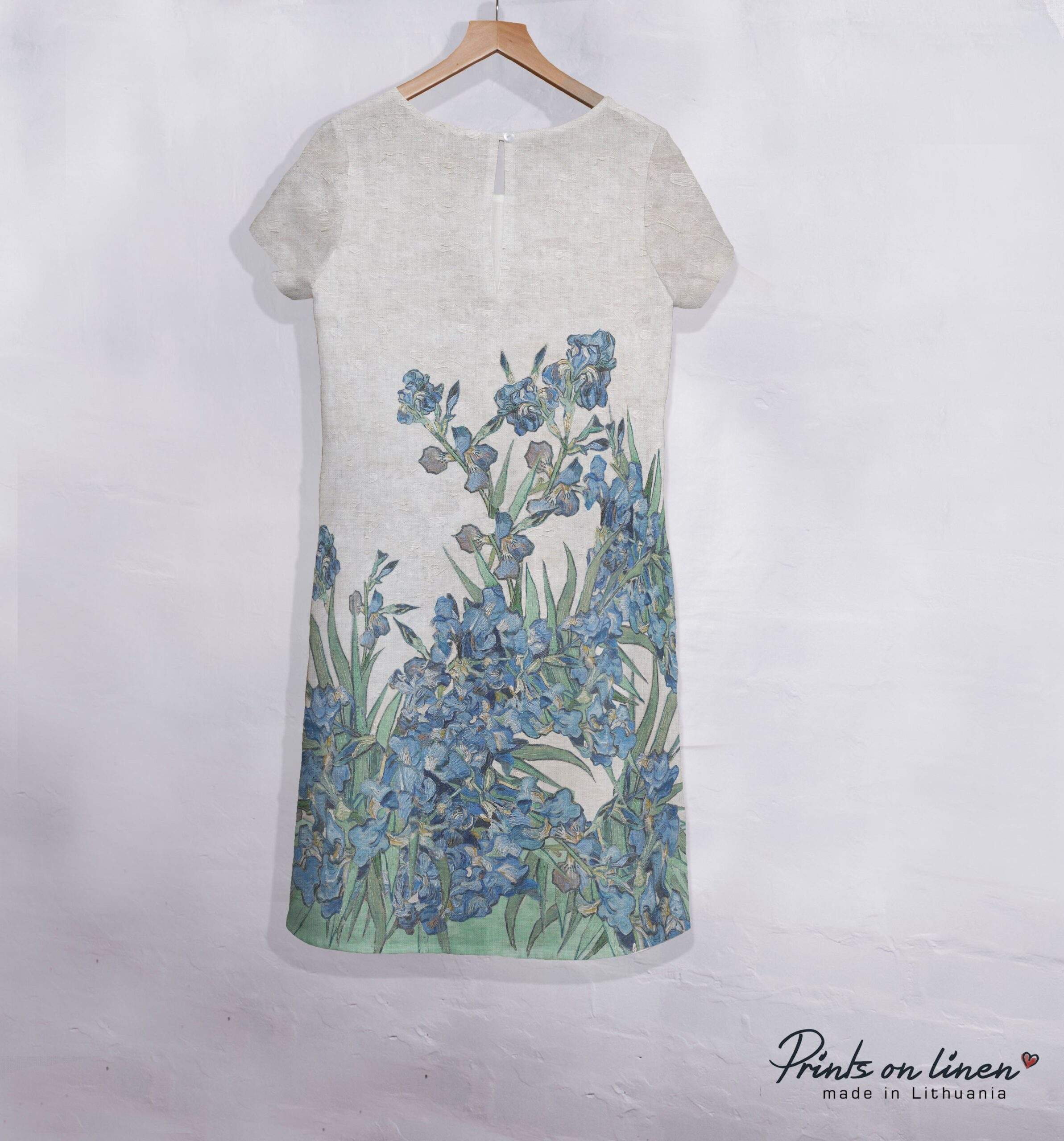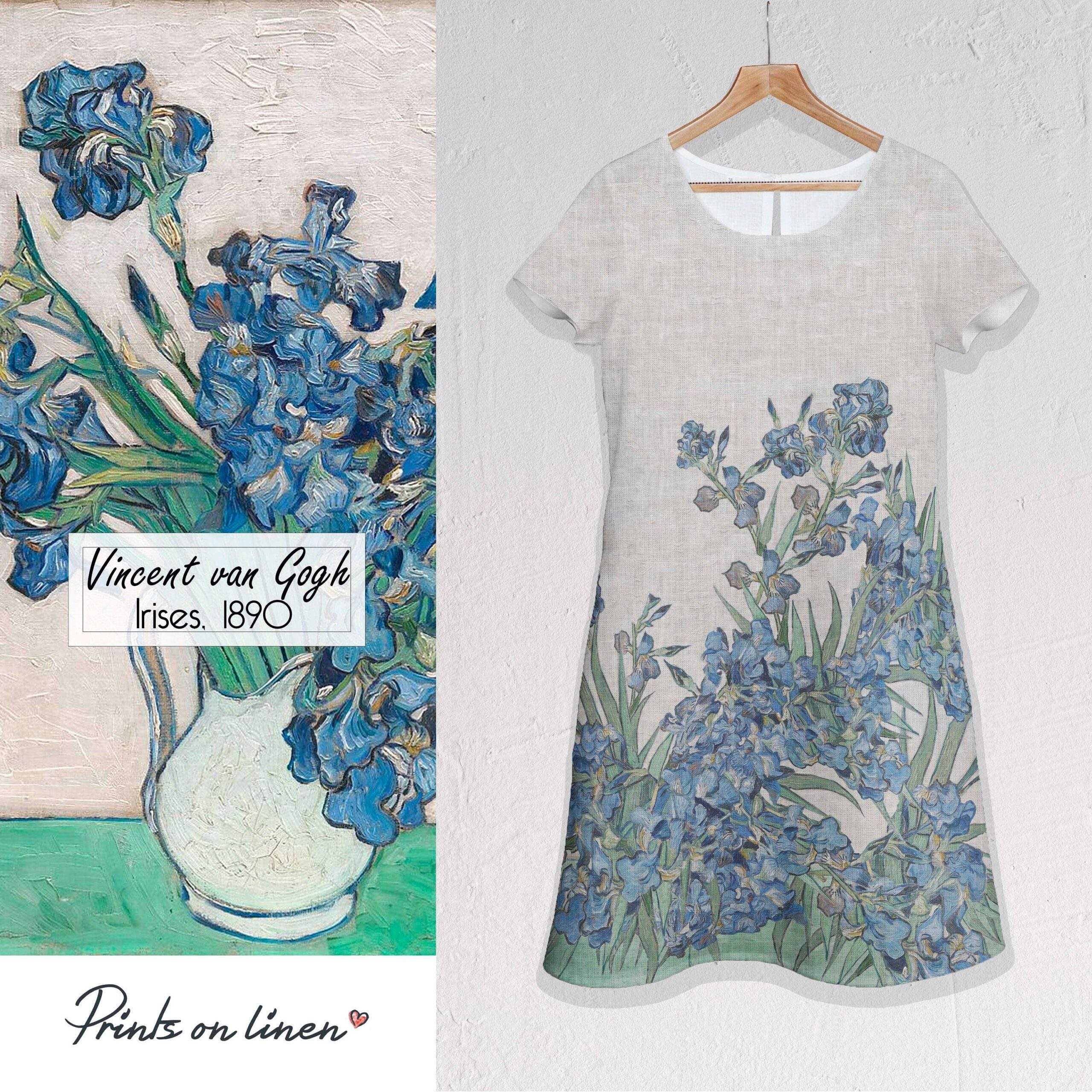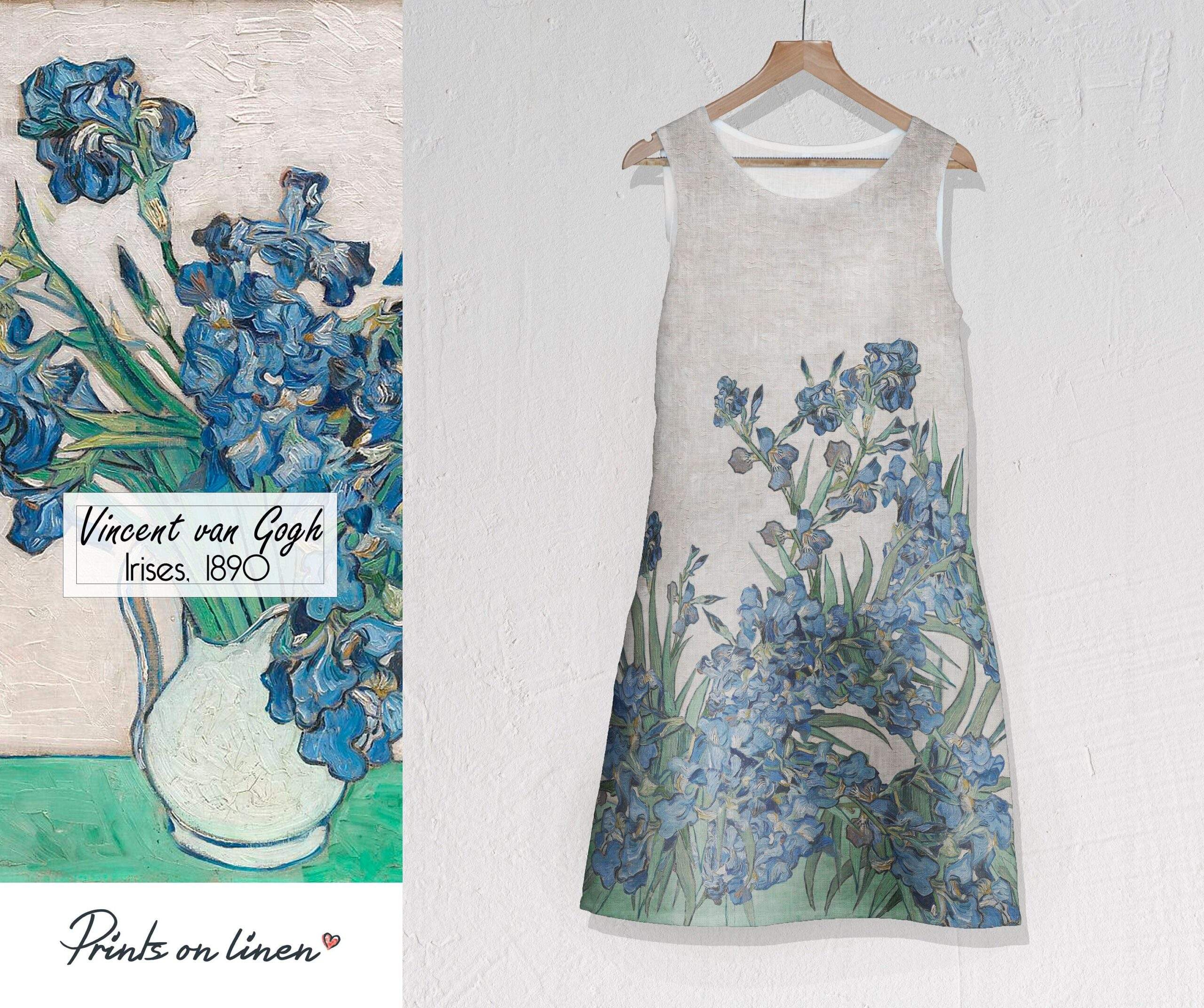Linen women dress of Vase with Irises by Vincent Van Gogh. It is believed that irises combine two separate worlds of divine and earth, and brings blessed peace to anyone. The kingdom of divine and earth connect heavenly white and blue colours and everyday life elements which are vase and table.