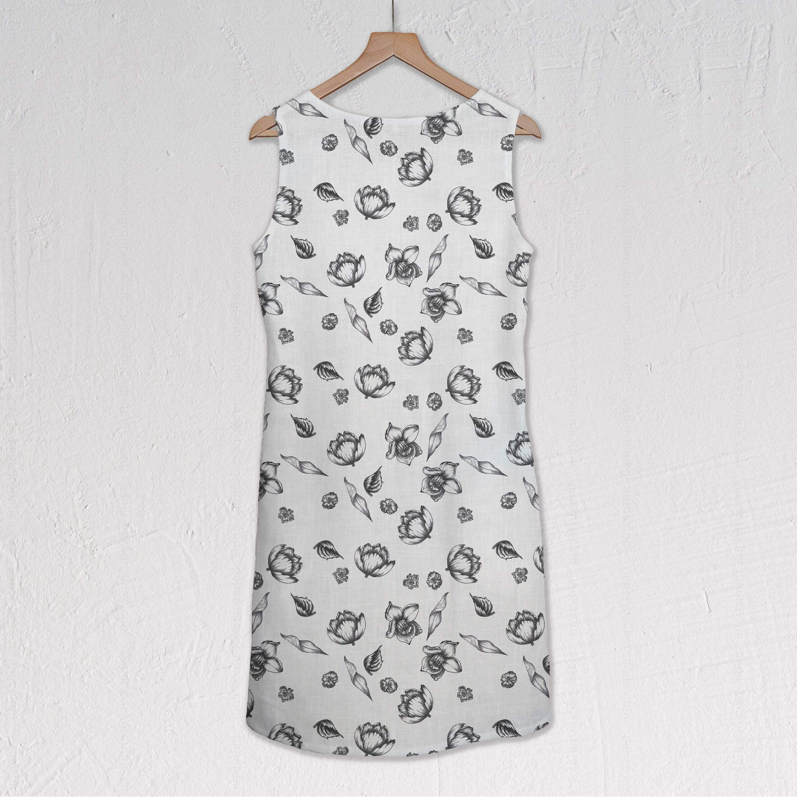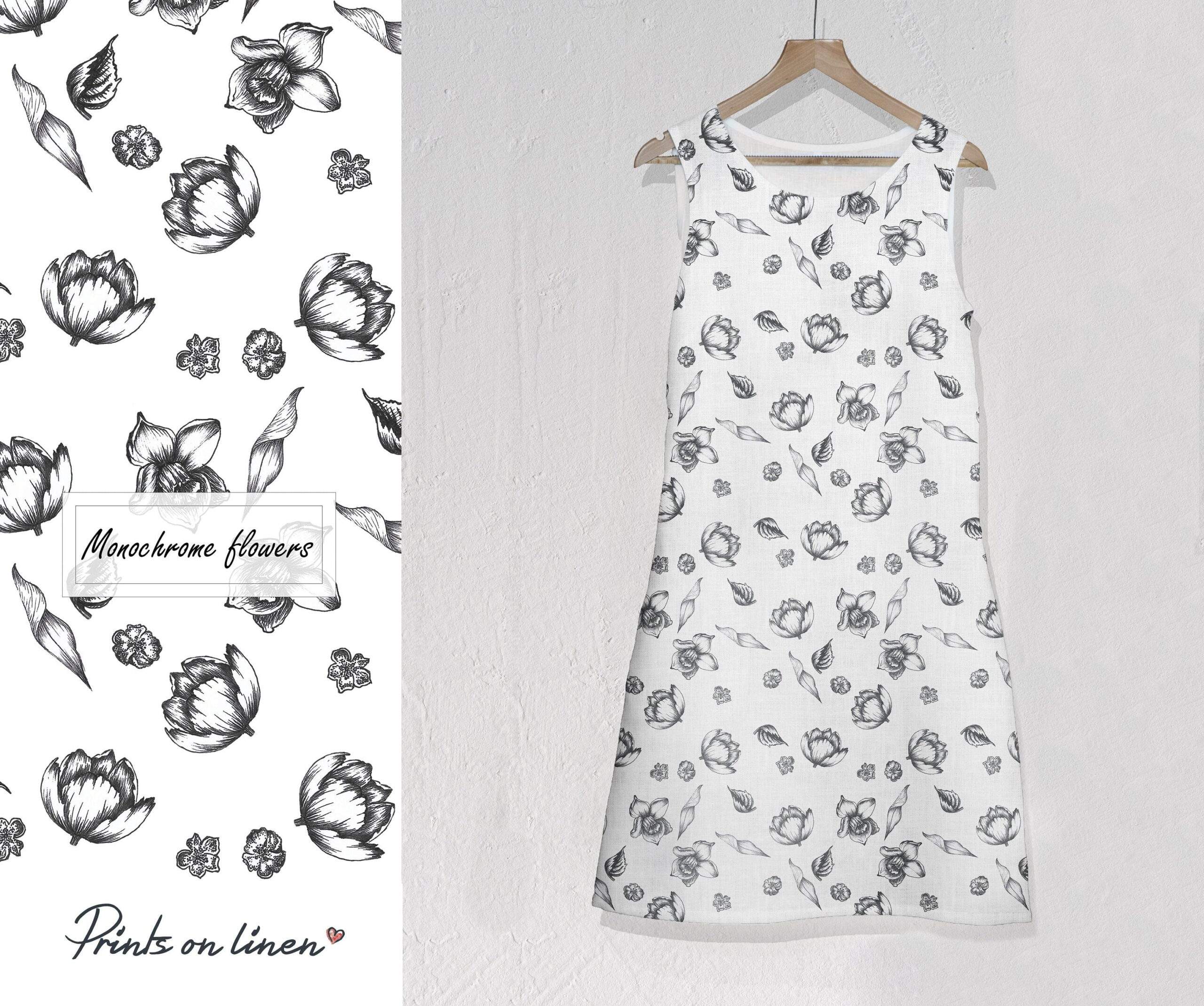 Women dress made of 100% linen with monochrome flowers pattern. Dress background white linen fabric.