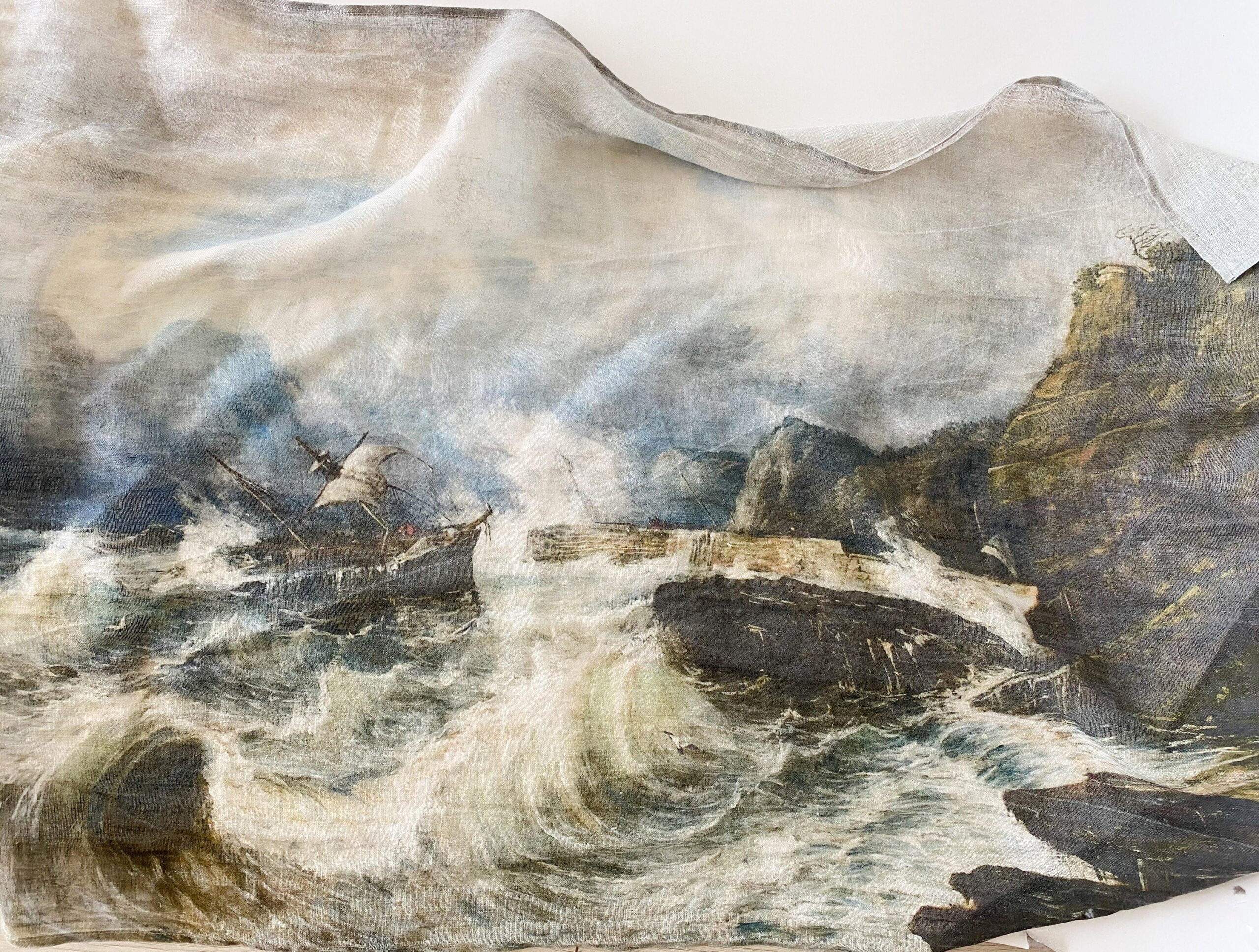 Women scarf “Puerto de Laredo” Rafael Monleón. Linen women scarf, 1883 years artwork.